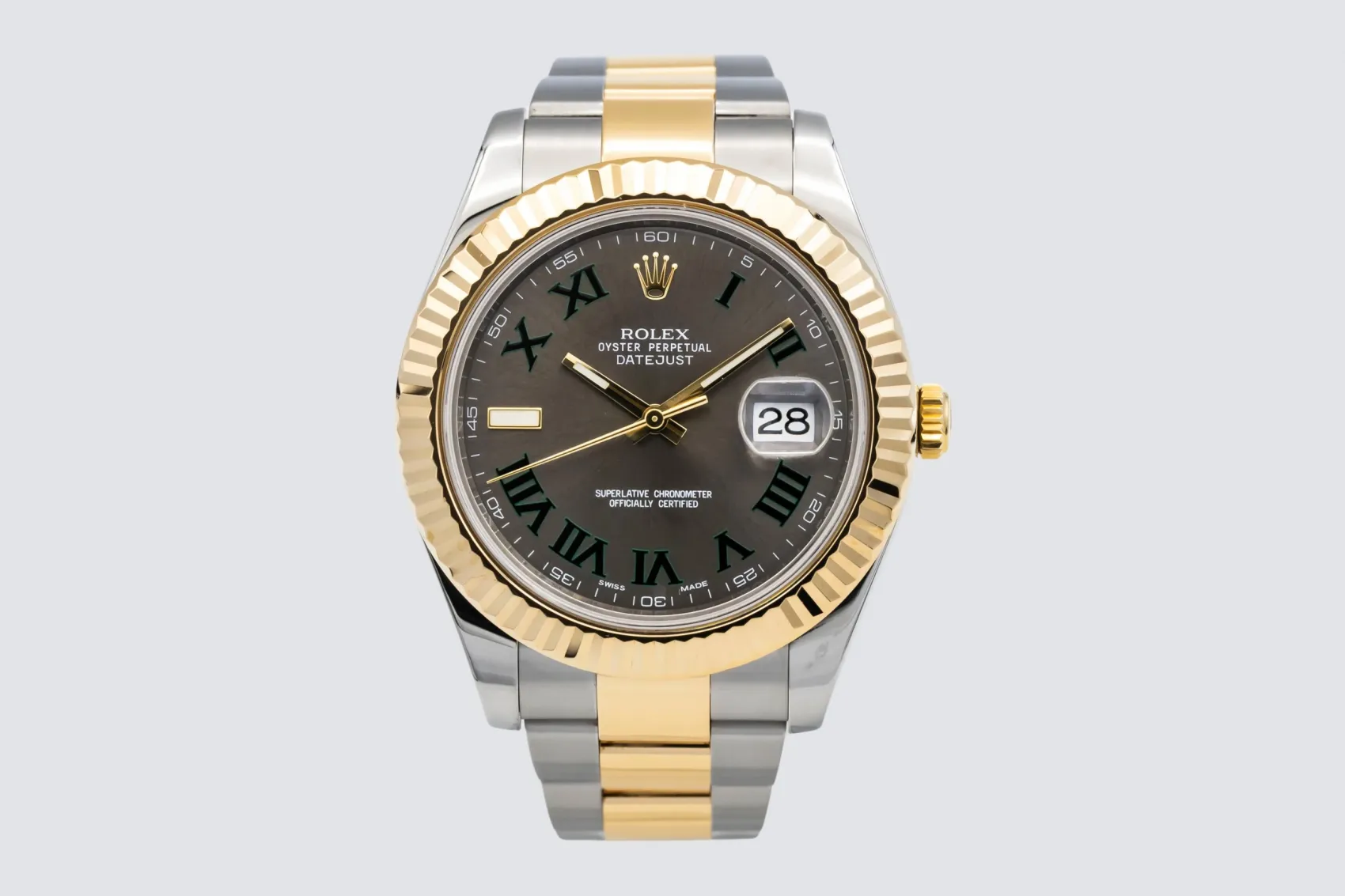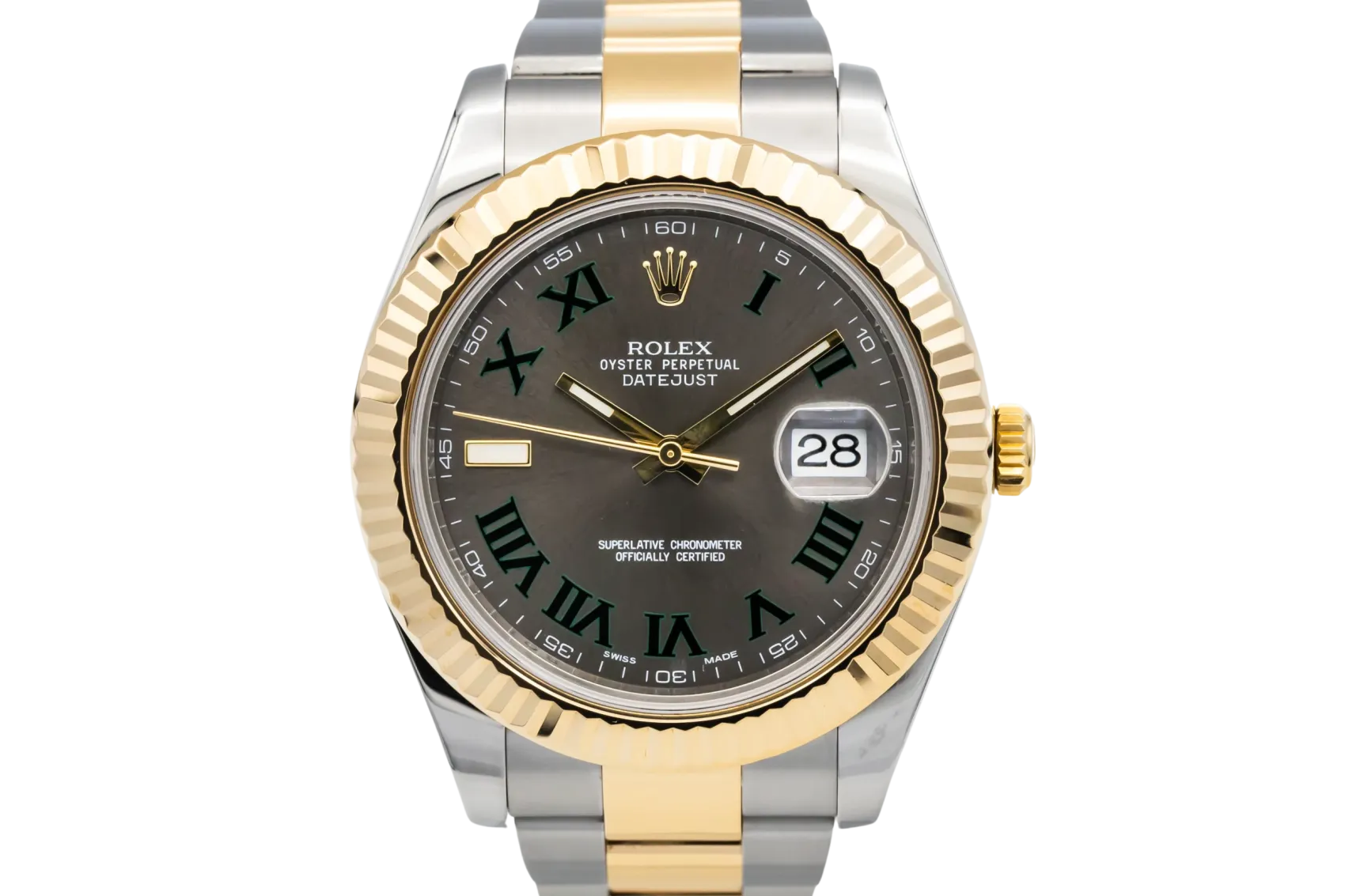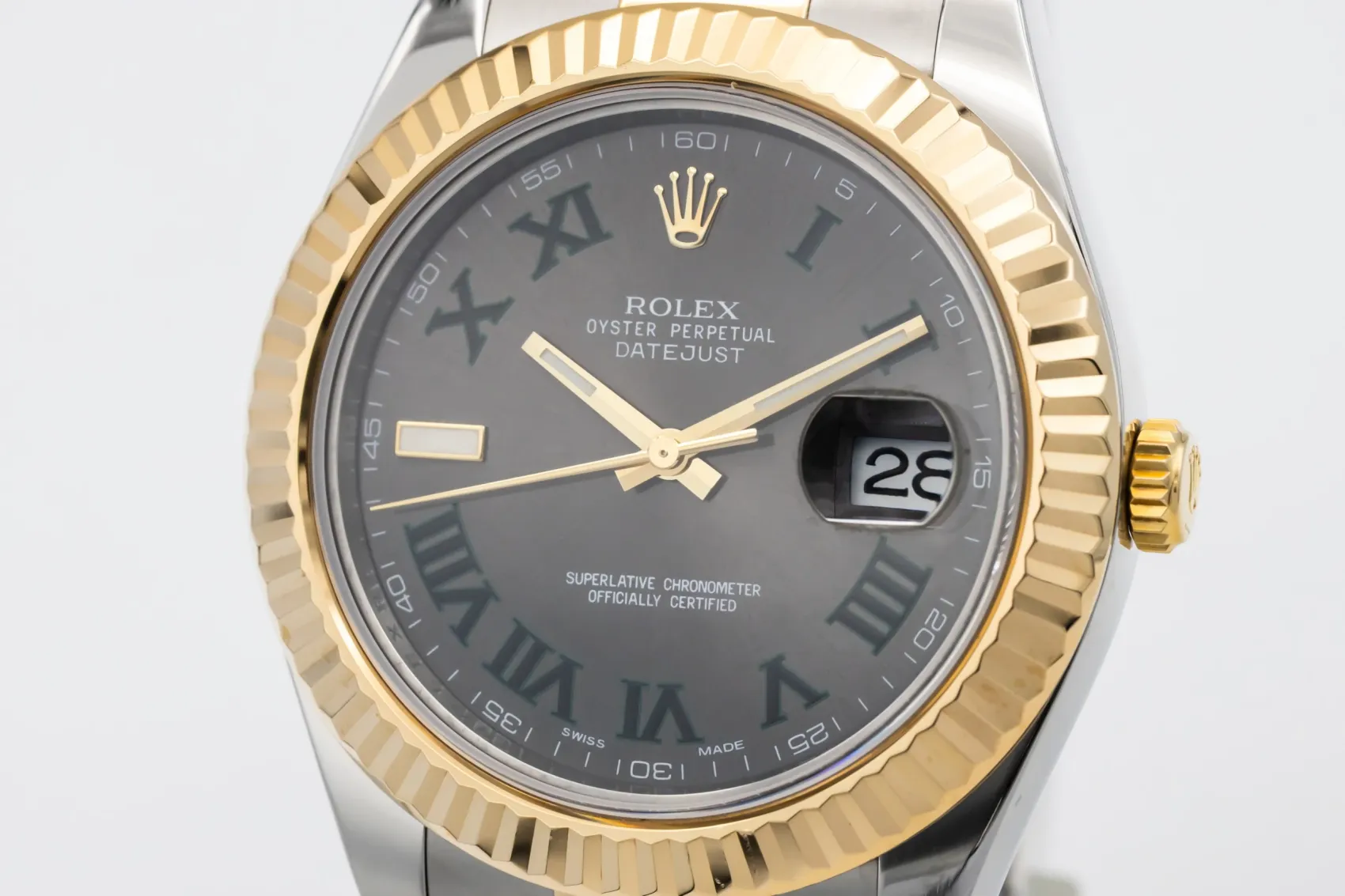 finance this from £200.98 p/m call the shop Read about our Limited Lifetime WarrantyThis 2009 Rolex DateJust II is presented in a bold 41mm Oyster case crafted from stainless steel and 18ct yellow gold, paired with the robust Oyster bracelet. The dial features roman numeral markers, polished hands, and the signature date aperture at 3 o’clock with Cyclops magnification, while the fluted 18ct yellow gold bezel adds classic Rolex refinement.