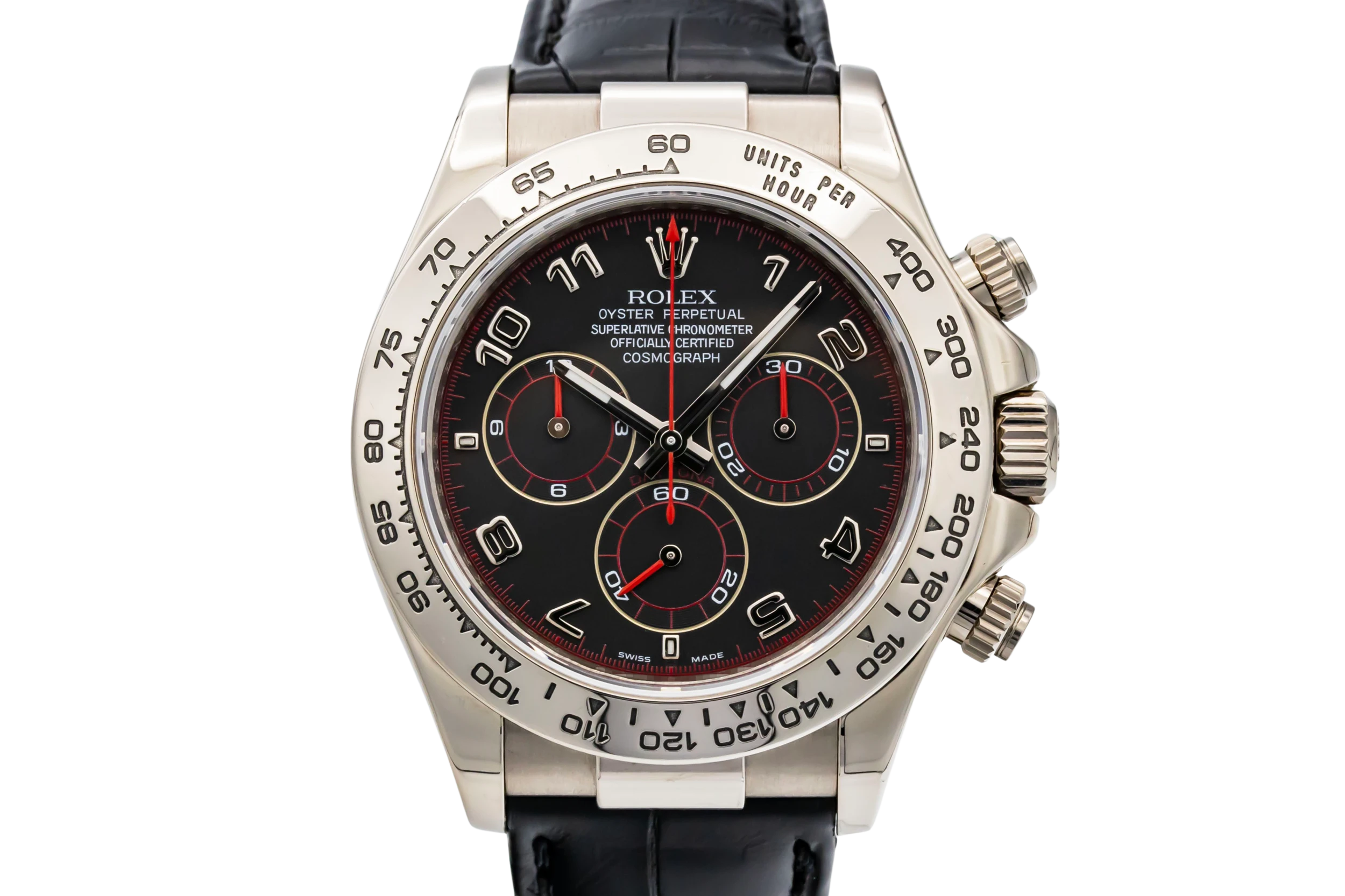 This 2012 Rolex Cosmograph Daytona 40mm features a racing grey dial with contrasting black chronograph sub-dials, polished white gold hands, and arabic numerals, all framed by a smooth, elegant bezel. The black leather strap perfectly complements the dial, offering sophisticated wearability while maintaining a distinctly contemporary yet timeless look.