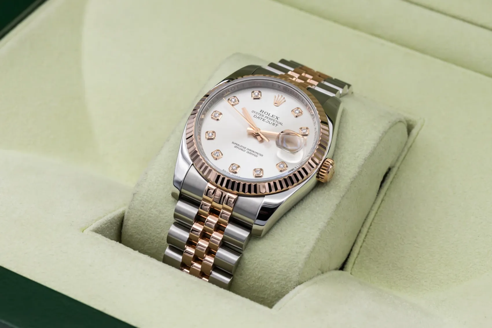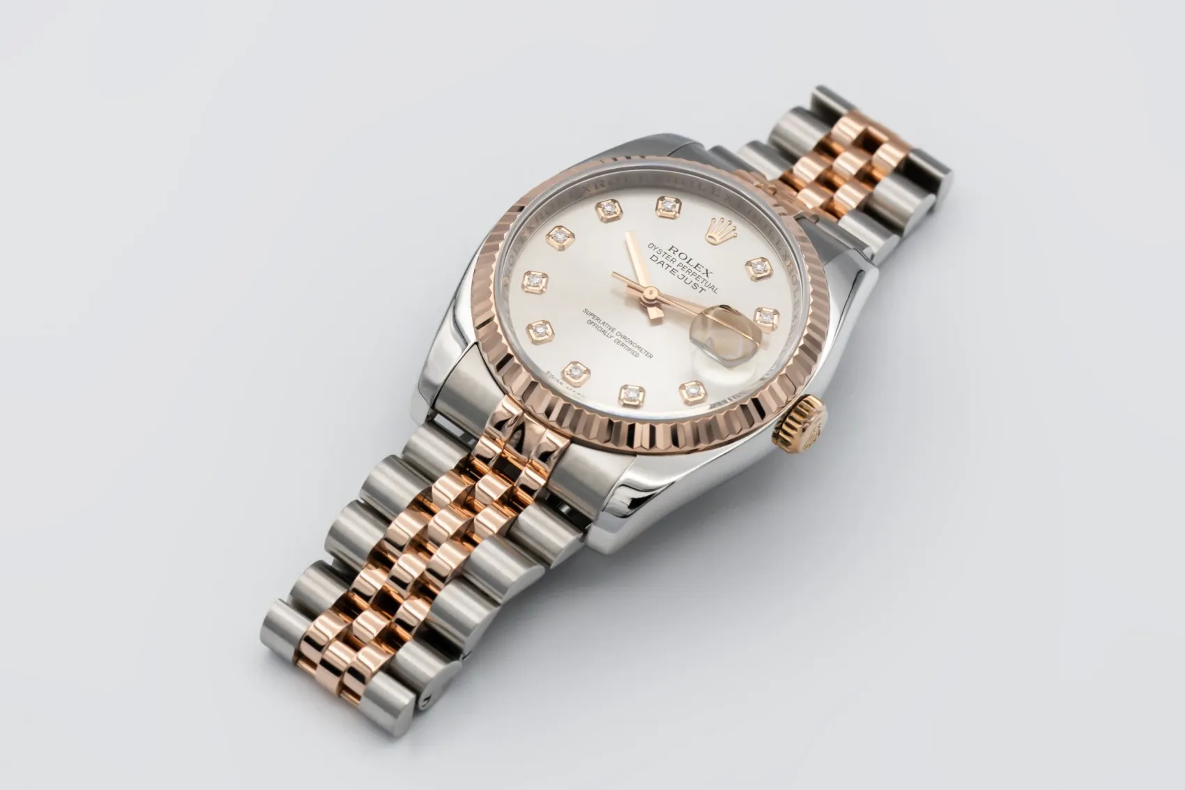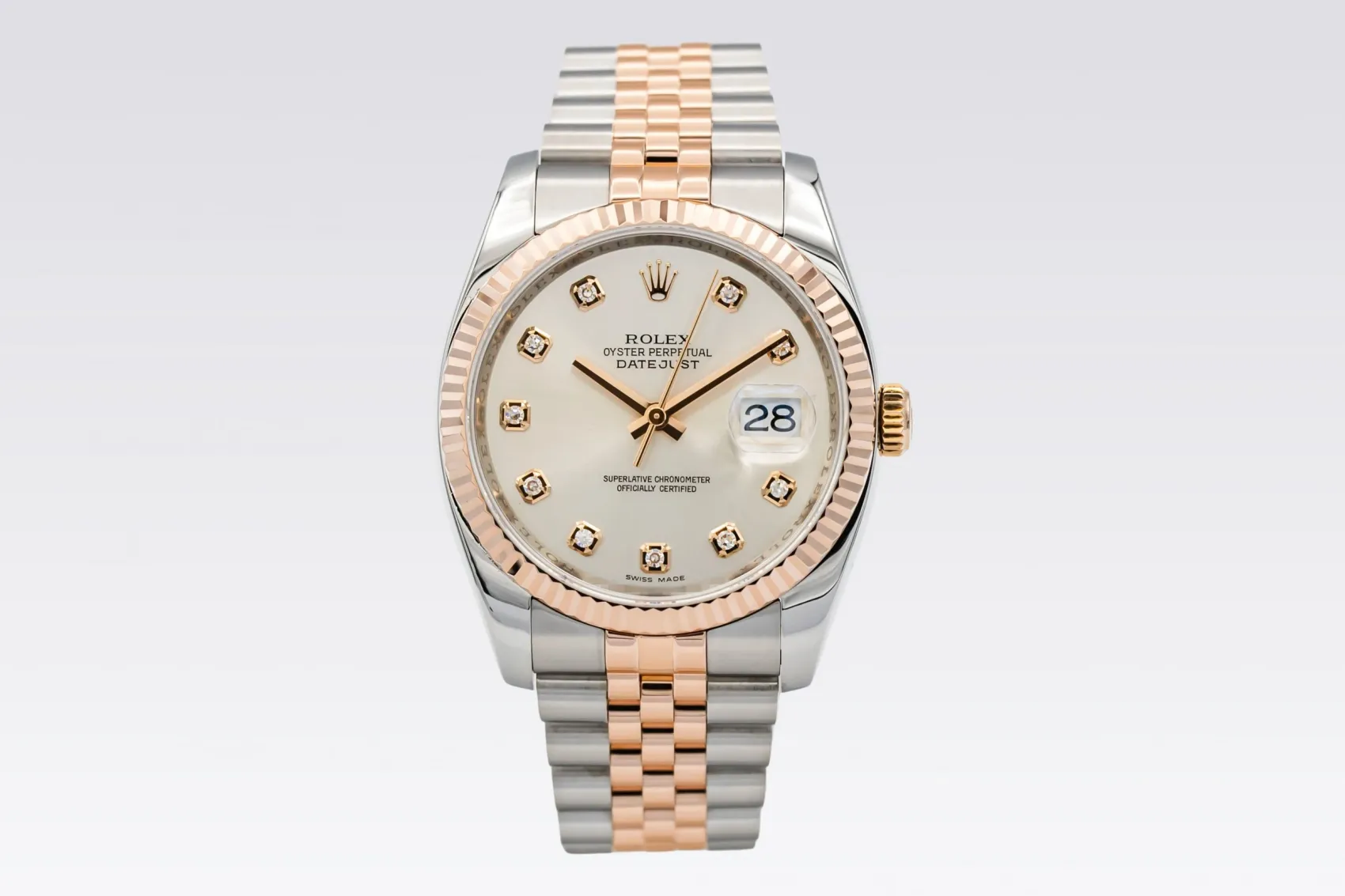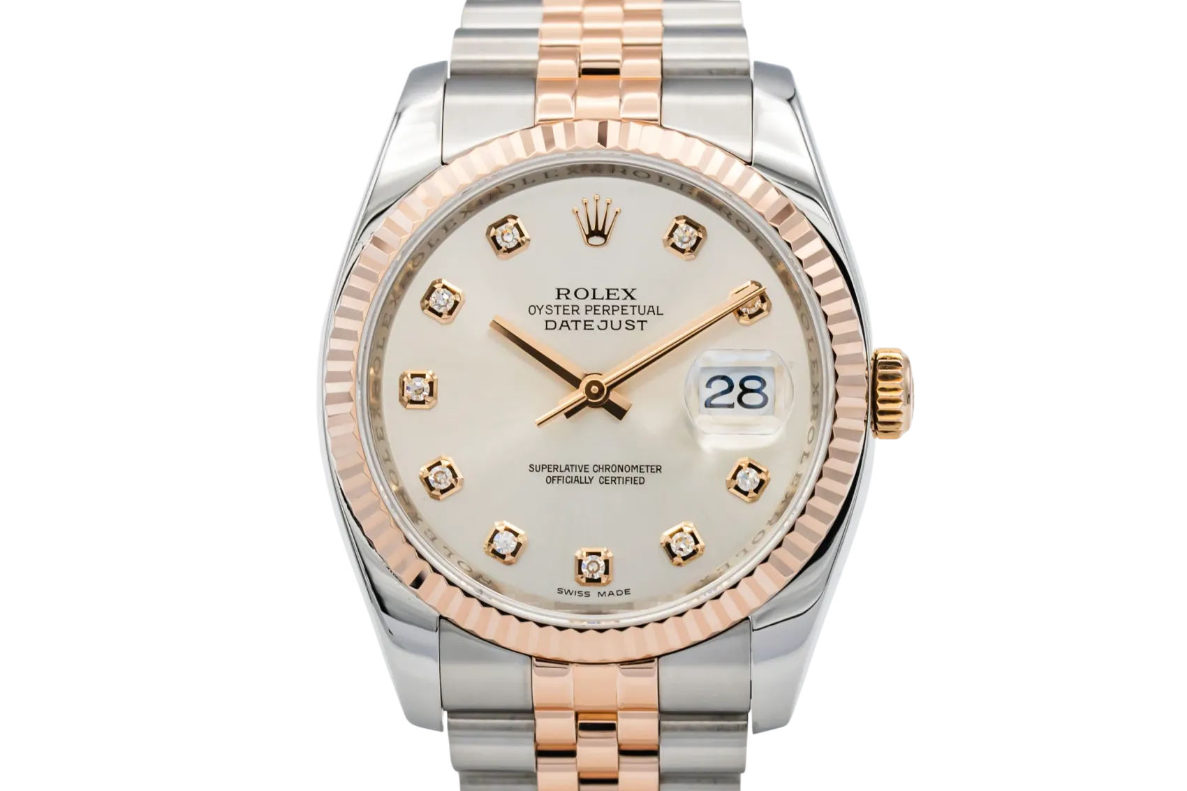 finance this from £200.07 p/m call the shop Read about our Limited Lifetime WarrantyThis 2011 Rolex DateJust 36mm a silver dial which is complemented by diamond hour markers, providing a timeless and highly legible aesthetic. A signature fluted Everose gold bezel frames the dial beautifully, while the iconic Jubilee bracelet adds comfort and sophistication with its five-piece links.