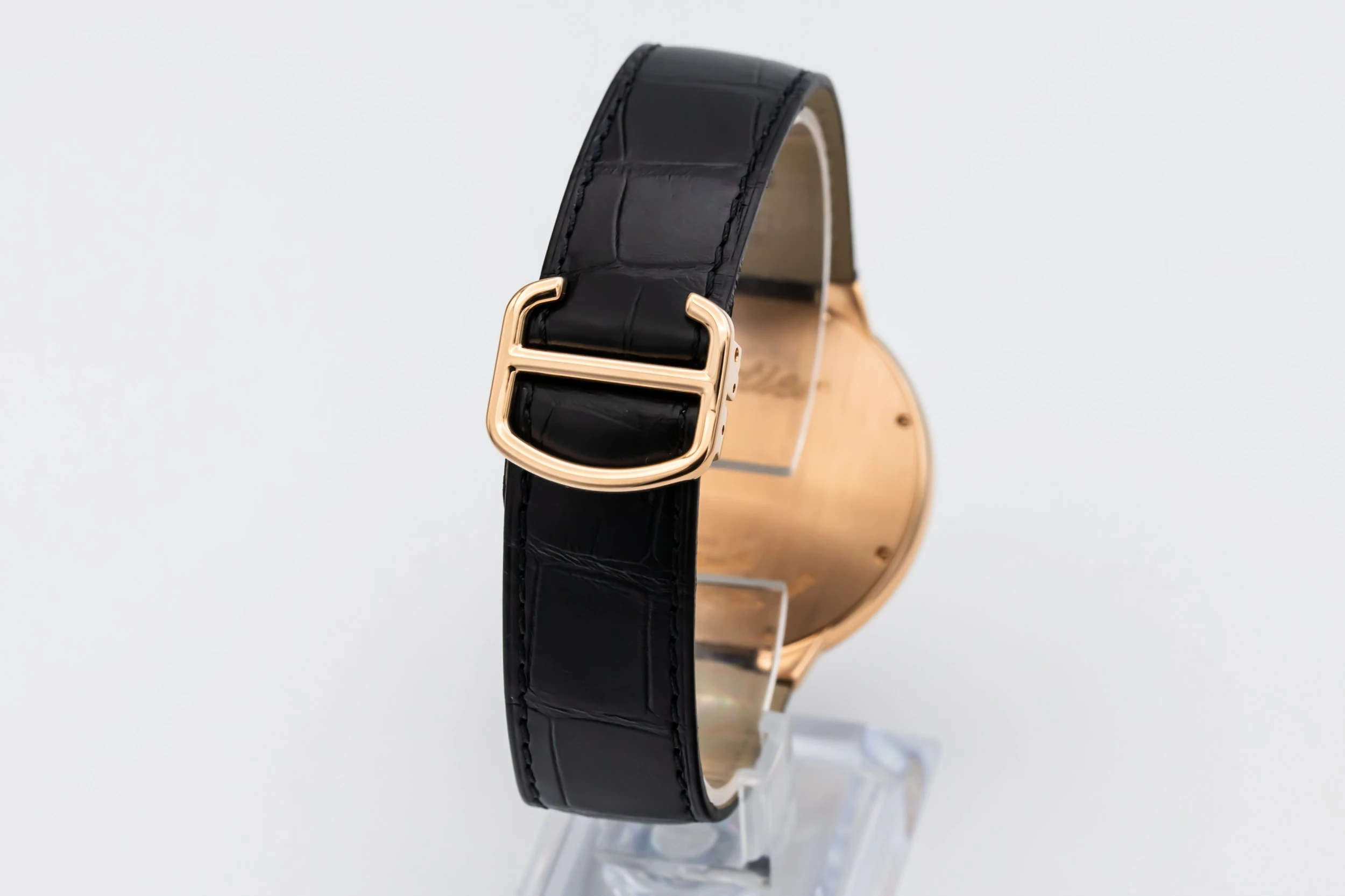 This 2012 Cartier Ballon Bleu 42mm is crafted from luxurious 18ct rose gold, showcasing the collection’s signature rounded case and elegant proportions. The silvered opaline dial features bold black Roman numerals, framed by the distinctive smooth bezel and slightly domed sapphire crystal. Paired with a rich black leather strap, this piece exudes refined sophistication and timeless Cartier design.