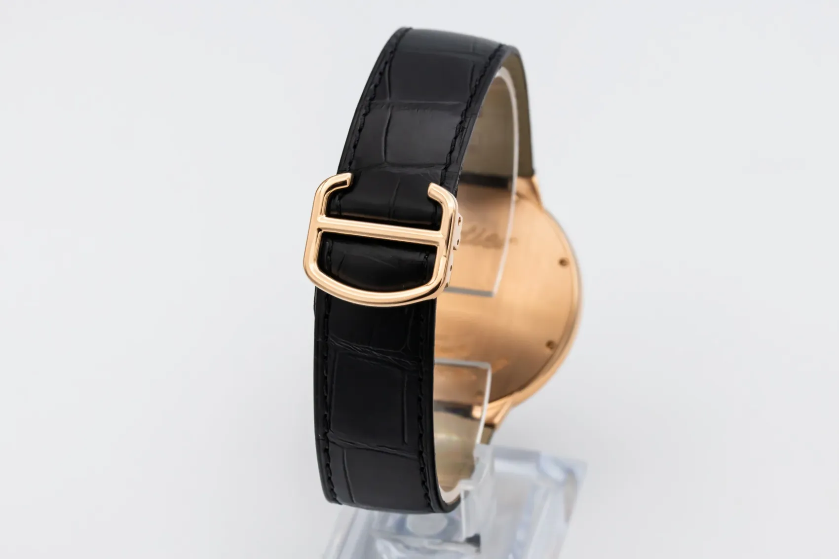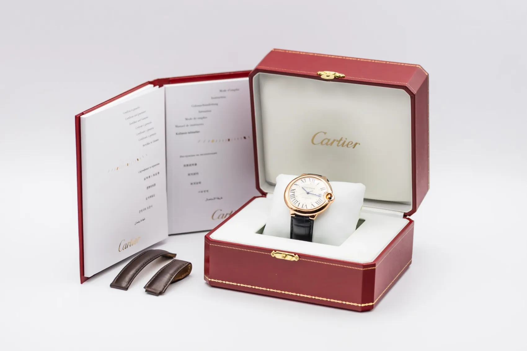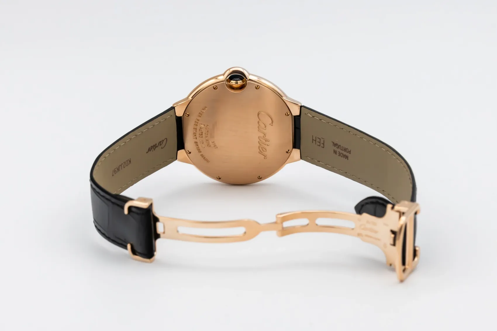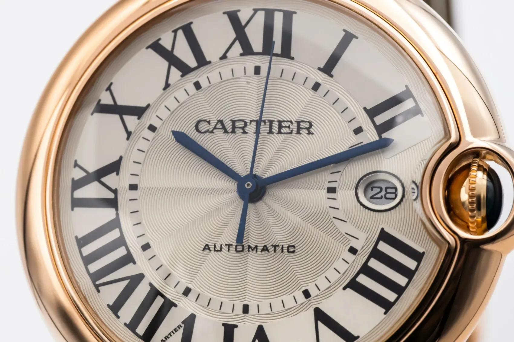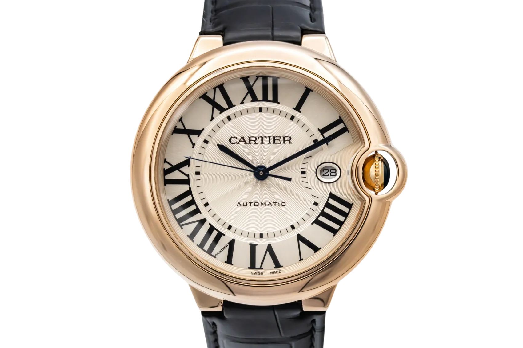 finance this from £190.02 p/m call the shop Read about our Limited Lifetime WarrantyThis 2012 Cartier Ballon Bleu 42mm is crafted from luxurious 18ct rose gold, showcasing the collection’s signature rounded case and elegant proportions. The silvered opaline dial features bold black Roman numerals, framed by the distinctive smooth bezel and slightly domed sapphire crystal. Paired with a rich black leather strap, this piece exudes refined sophistication and timeless Cartier design.