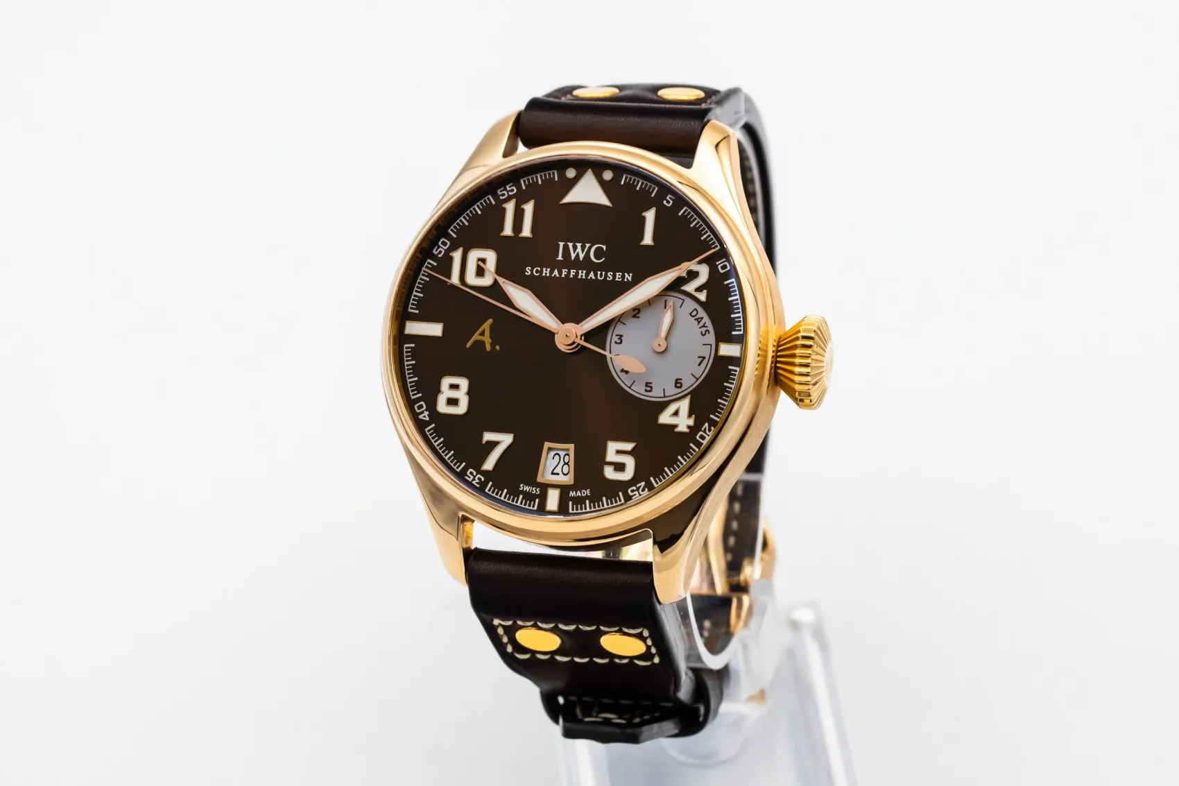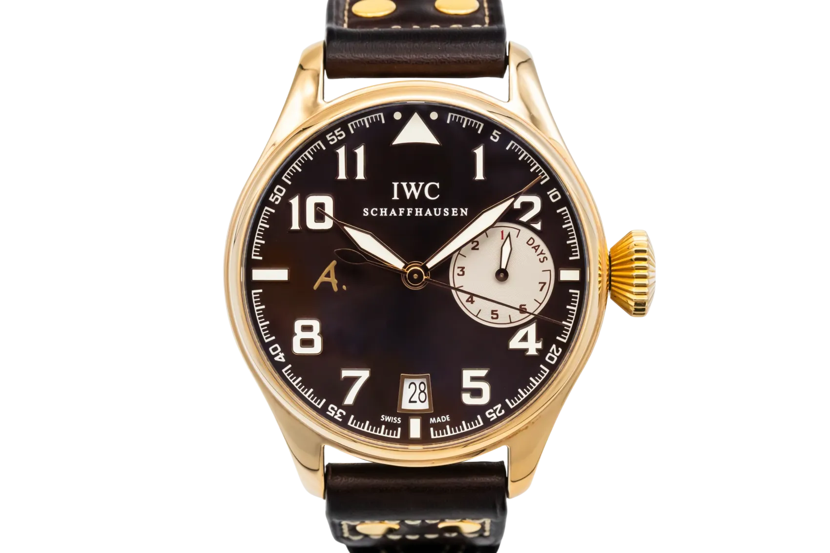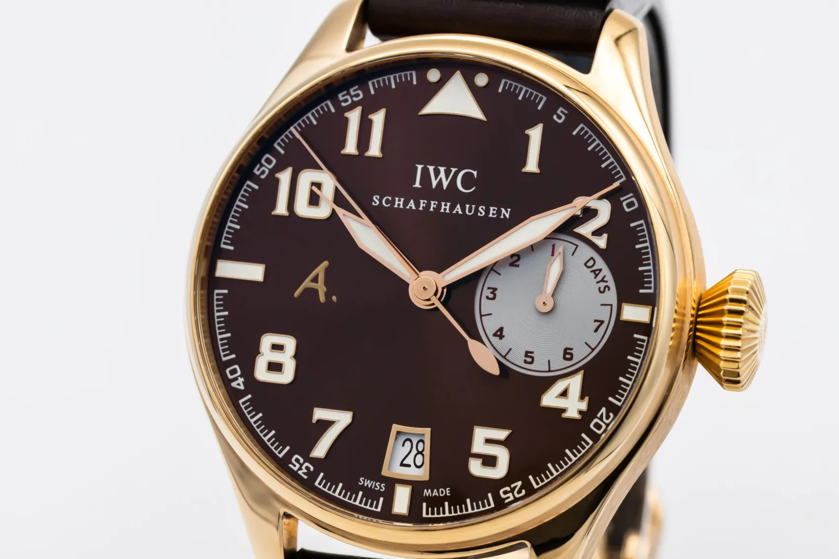 finance this from £291.46 p/m call the shop Read about our Limited Lifetime WarrantyThis 2009 IWC Pilot Antoine De Saint Exupery 46mm features a rich tobacco-brown sunburst dial with contrasting luminous Arabic numerals, cathedral-style hands, and a power-reserve indicator at 3 o’clock. The warm brown leather pilot strap with white stitching adds a vintage aviation character, while the oversized conical crown completes the iconic Big Pilot aesthetic.