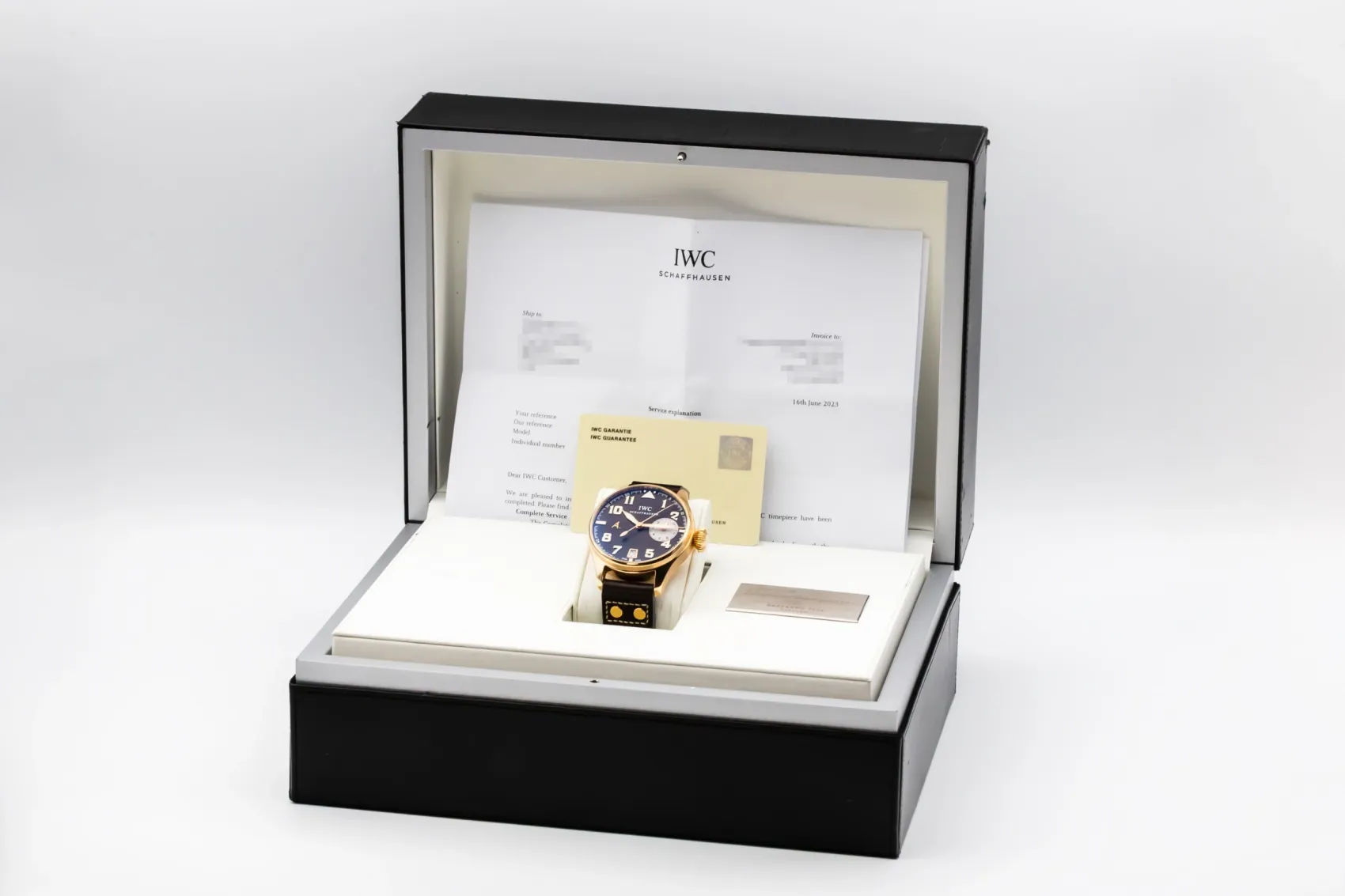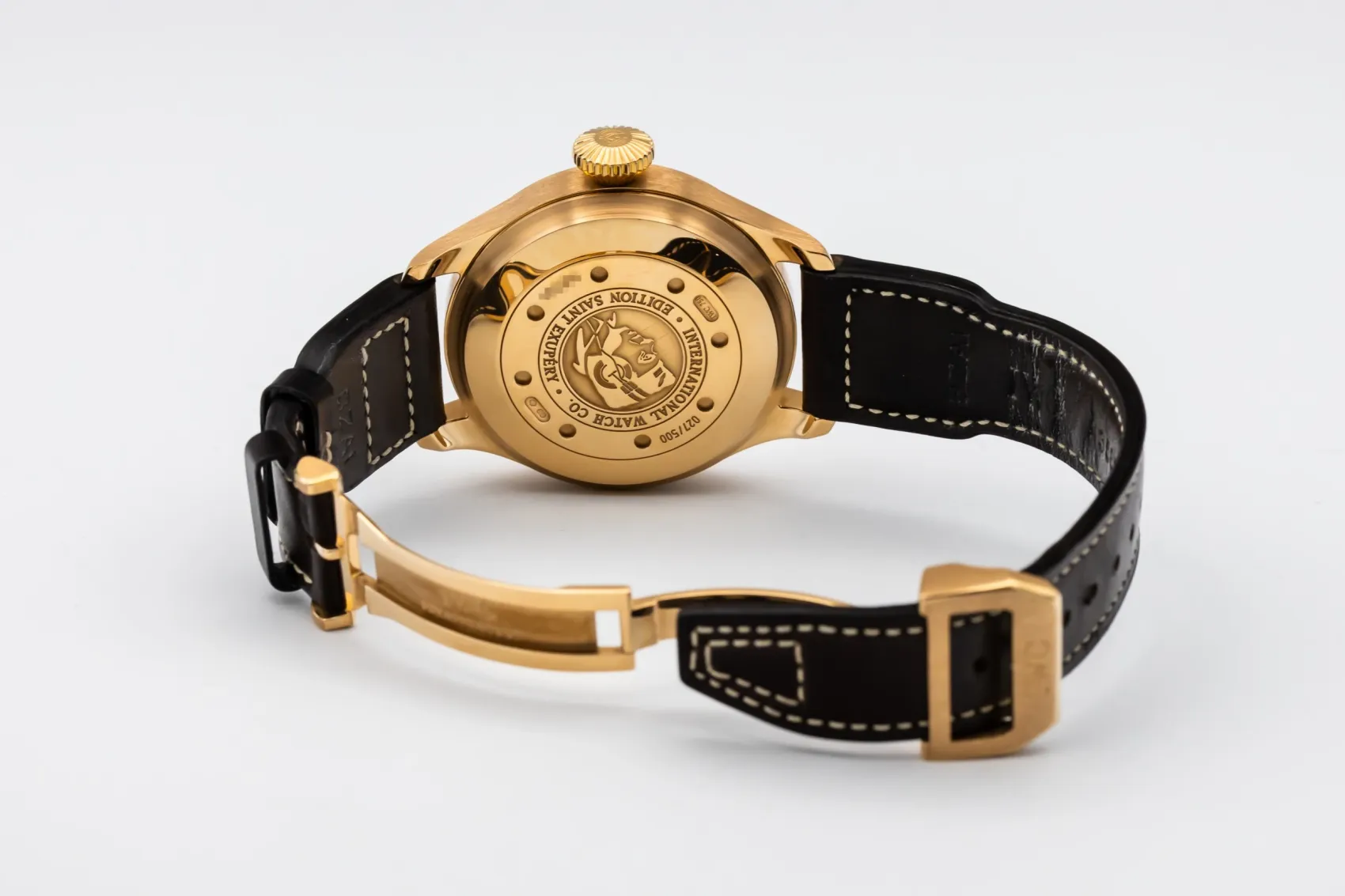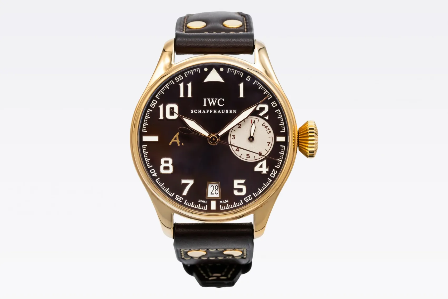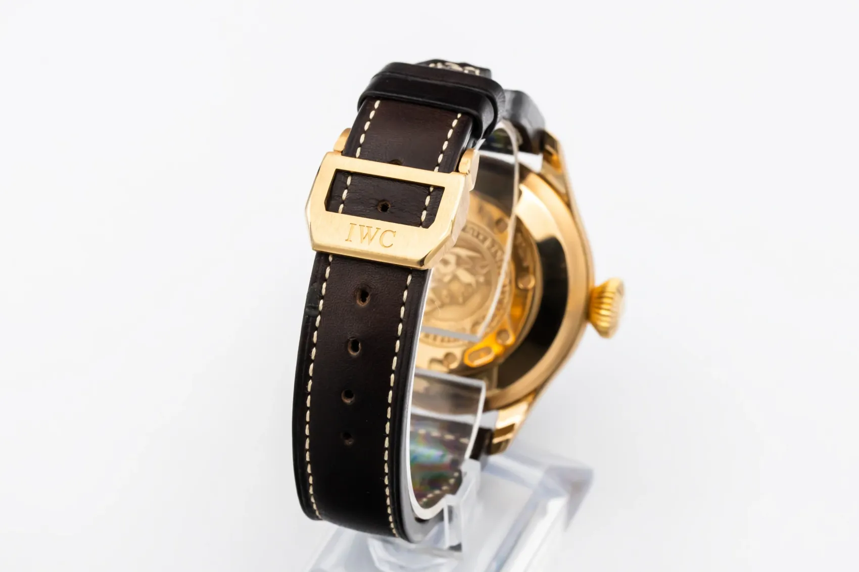 finance this from £291.46 p/m call the shop Read about our Limited Lifetime WarrantyThis 2009 IWC Pilot Antoine De Saint Exupery 46mm features a rich tobacco-brown sunburst dial with contrasting luminous Arabic numerals, cathedral-style hands, and a power-reserve indicator at 3 o’clock. The warm brown leather pilot strap with white stitching adds a vintage aviation character, while the oversized conical crown completes the iconic Big Pilot aesthetic.