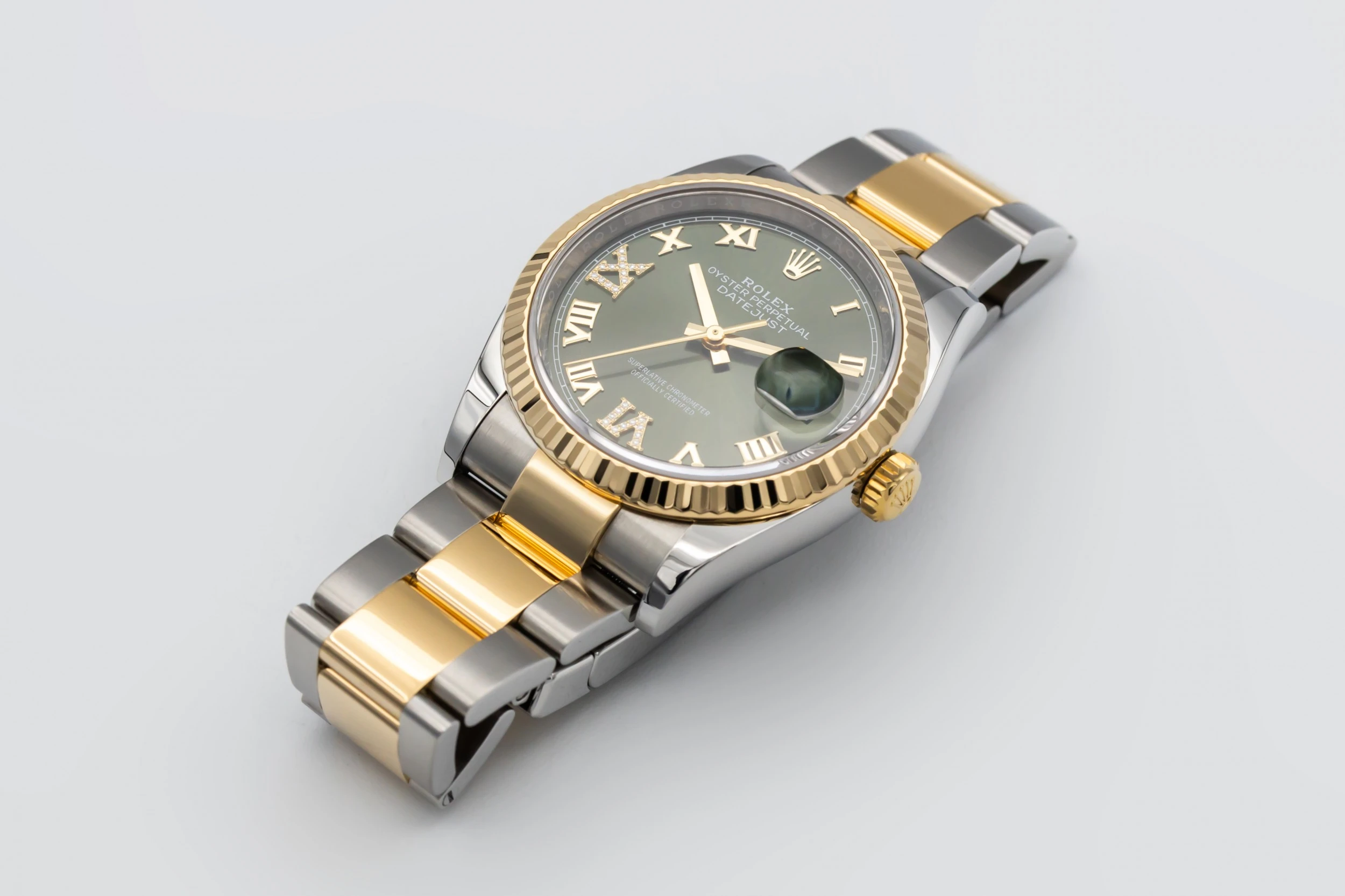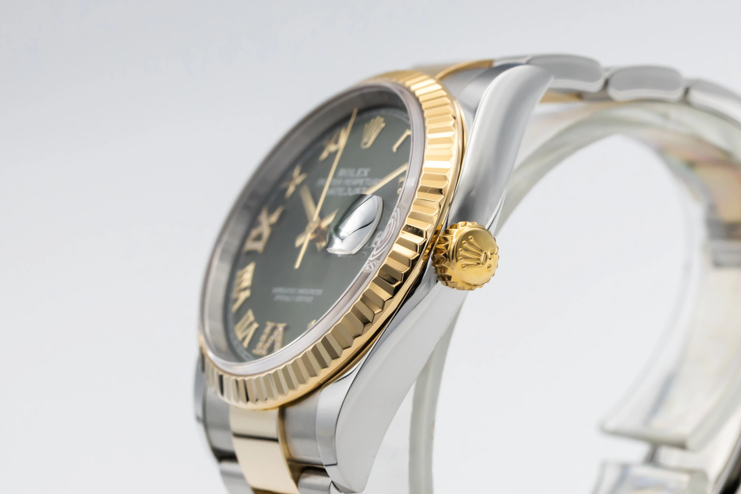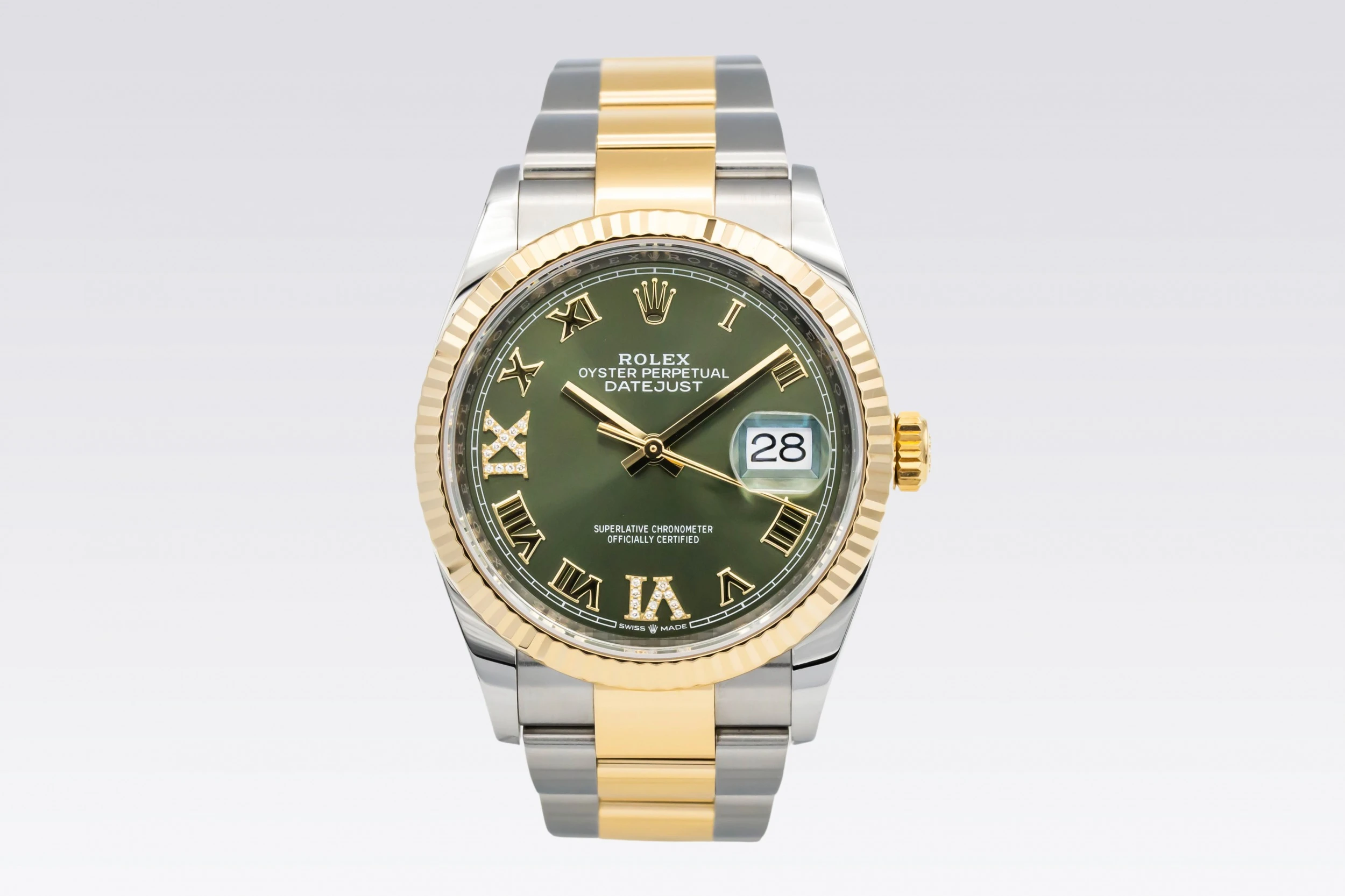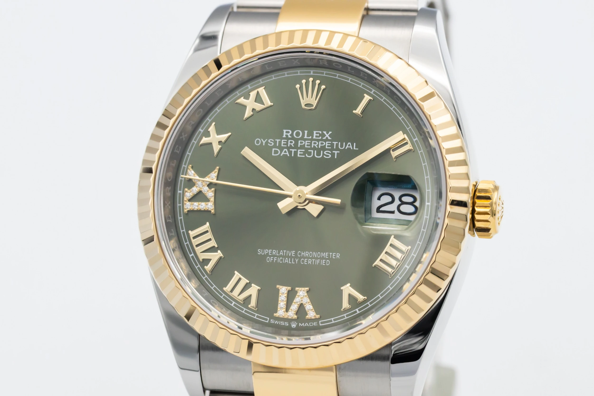 This 2020 Rolex DateJust 36mm features a rich olive-green dial that offers a striking contrast against the warm gold tones, highlighted by elegant Roman numeral hour markers with diamond-set numerals at 6 and 9 for added brilliance. A signature fluted yellow gold bezel frames the dial beautifully, while the robust Oyster bracelet provides both durability and refined comfort.
