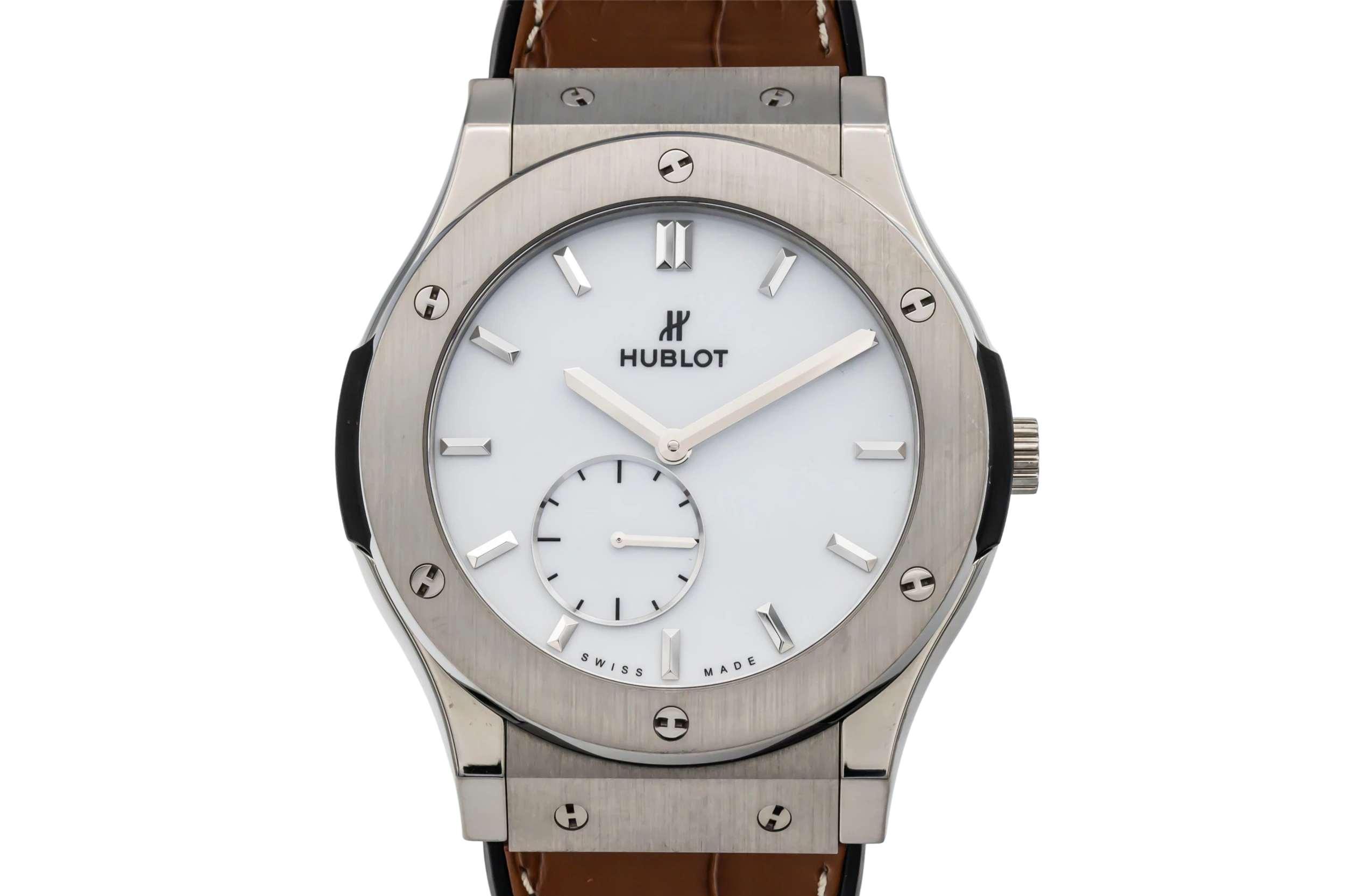 This 2020 Hublot Classic Fusion Ultra-Thin features a sleek 45mm titanium case with a satin-finished bezel secured by Hublot’s signature H-shaped screws, delivering a modern and refined aesthetic. The minimalist dial is finished in a white tone, accented by slim baton hour markers and hands that emphasise the watch’s ultra-thin profile. Paired with a brown leather strap.