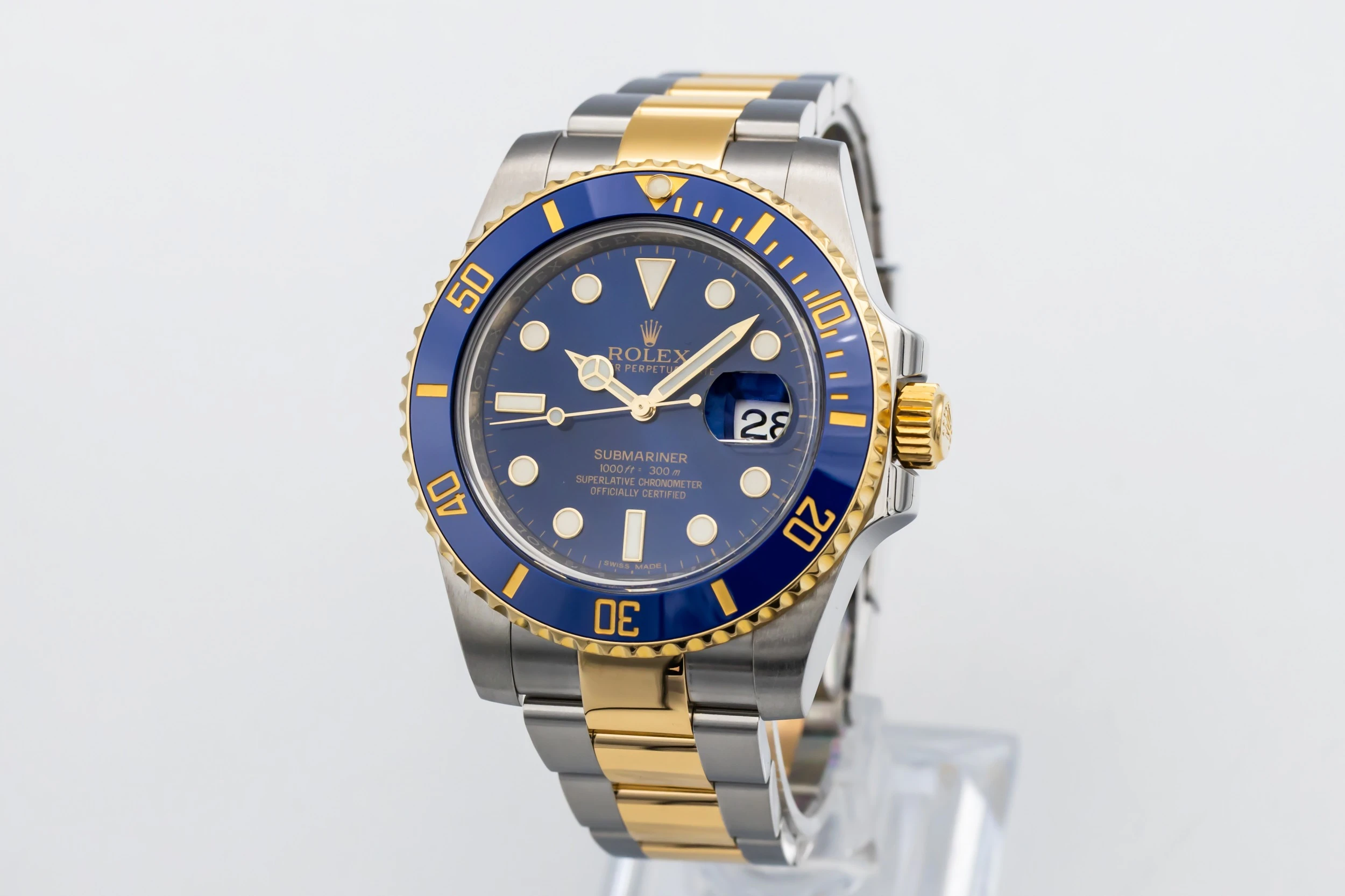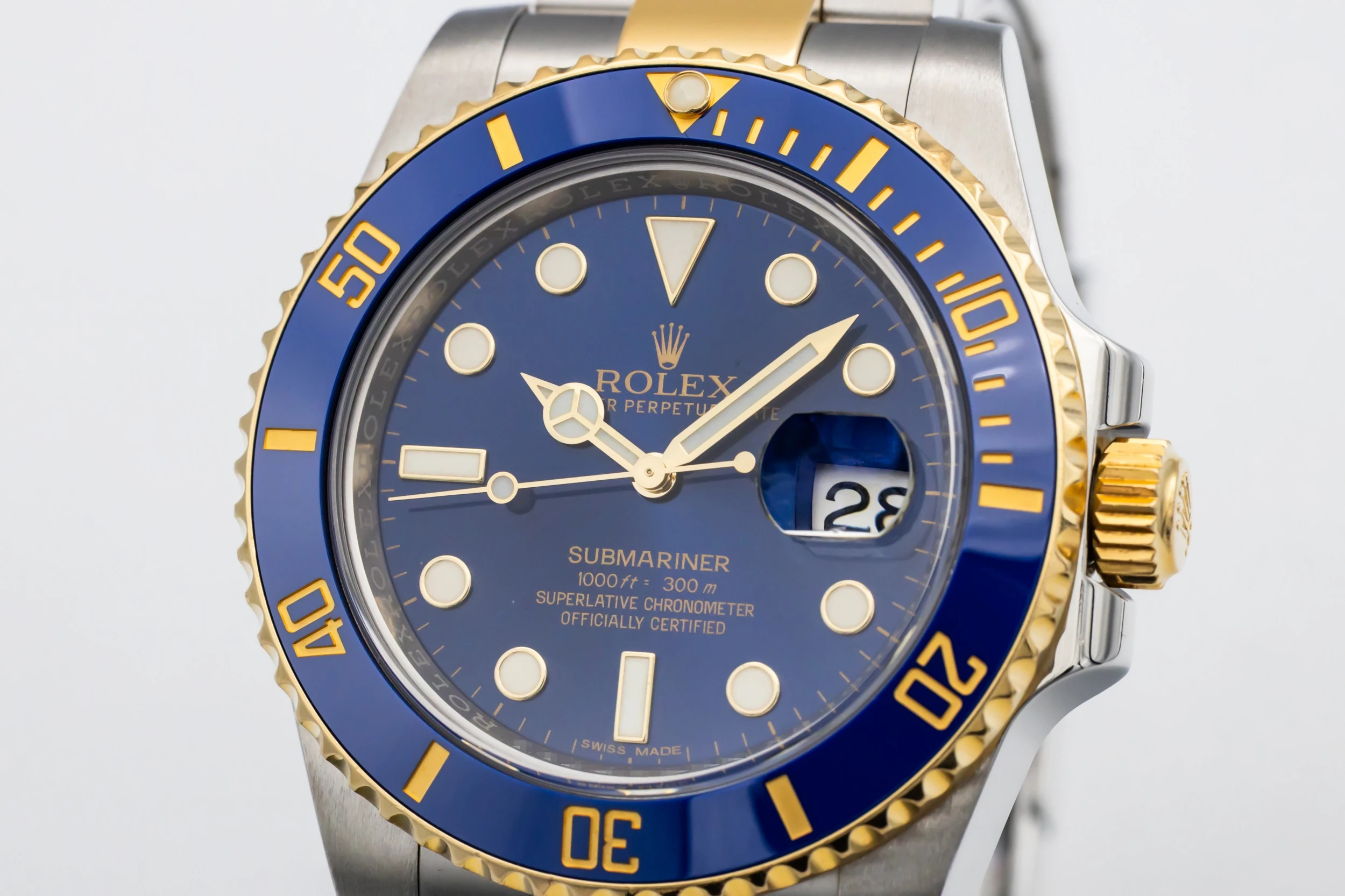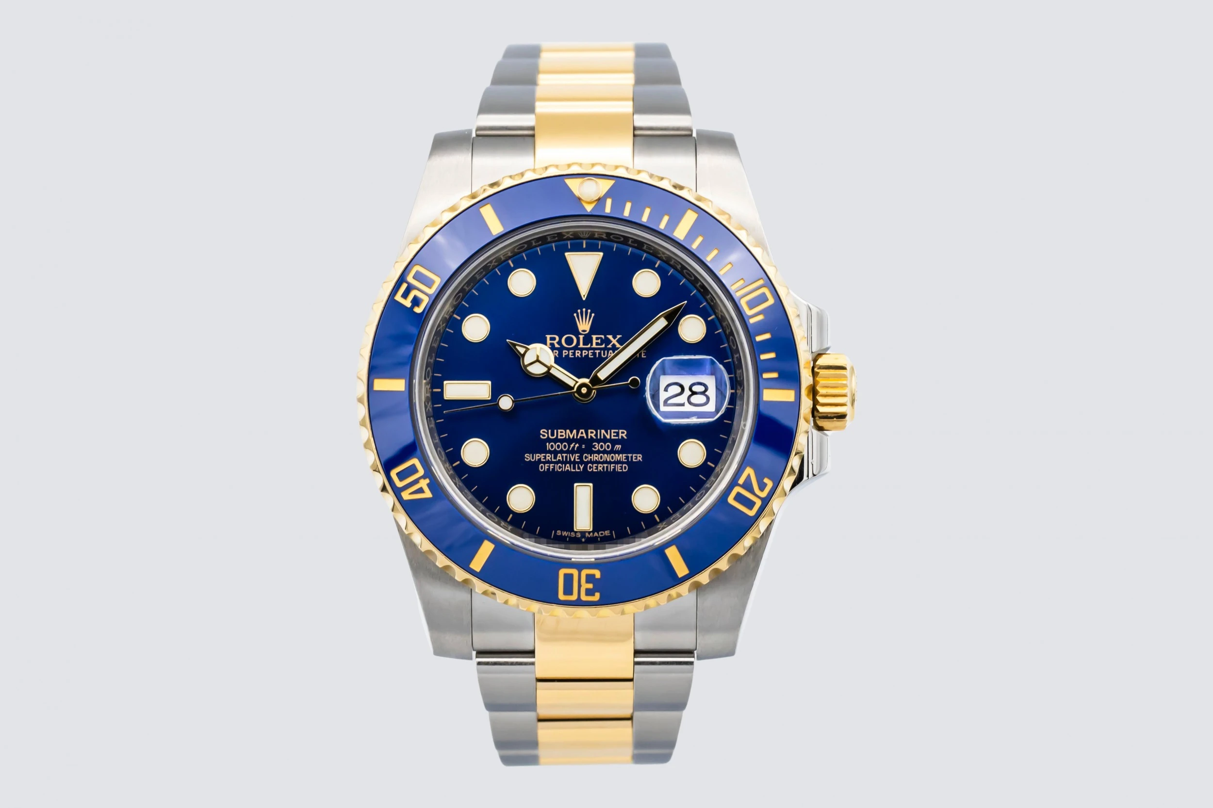 This 2016 Rolex Submariner ‘Bluesy’ features signature blue Cerachrom ceramic bezel insert and matching sunburst blue dial create a striking contrast against the luminous hour markers and Mercedes hands. A date window at 3 o’clock with Rolex’s Cyclops magnifier enhances everyday practicality, while Chromalight luminescence ensures excellent legibility in low light.