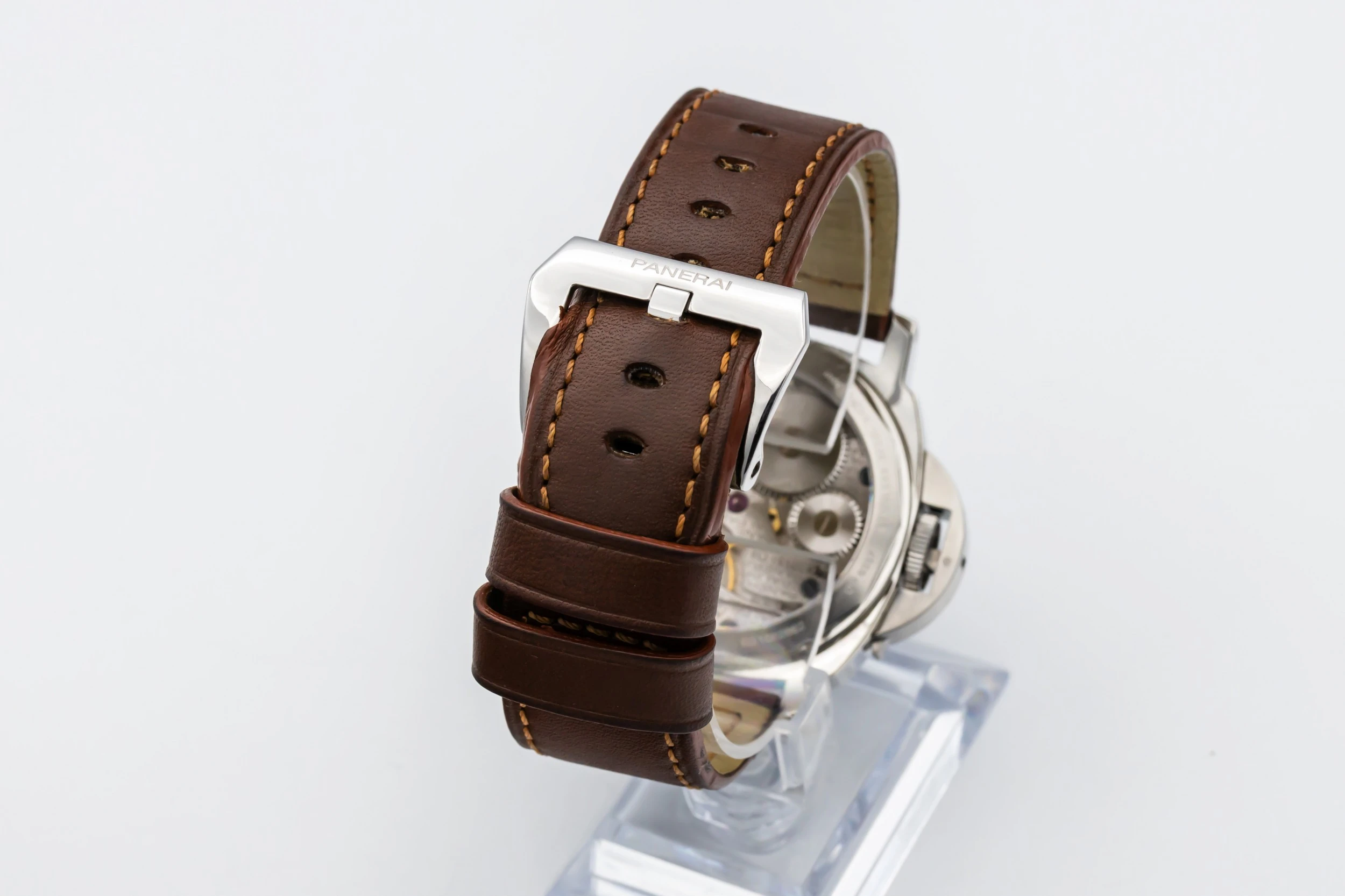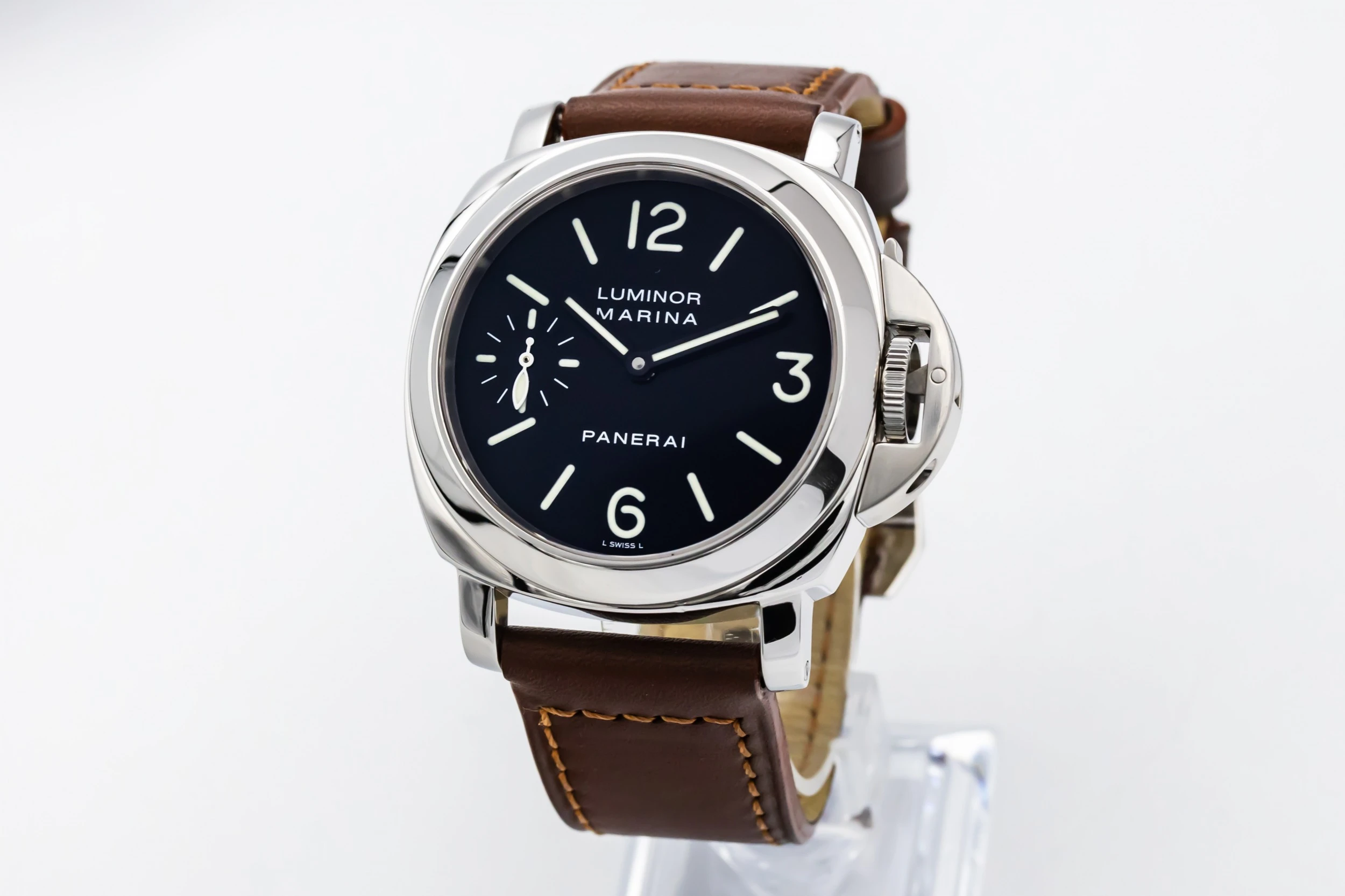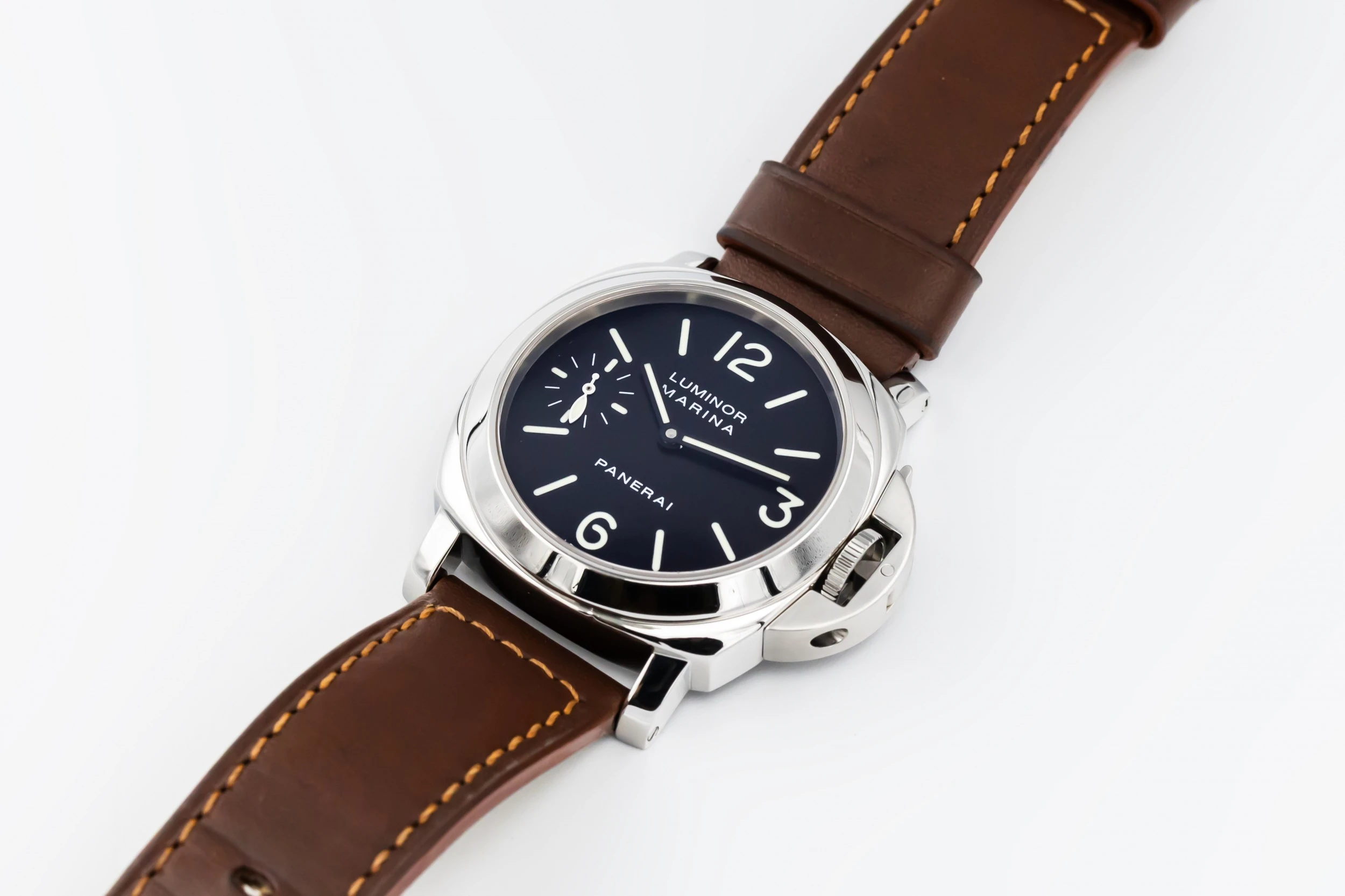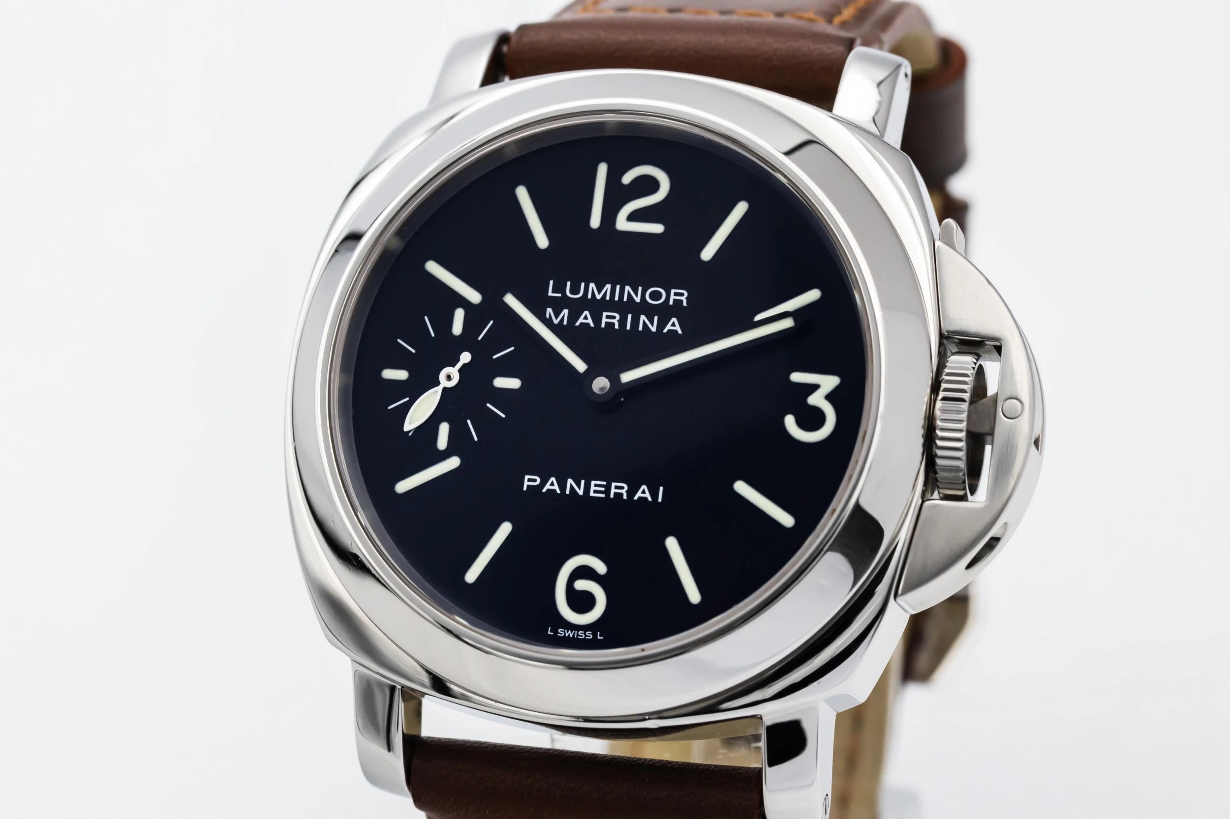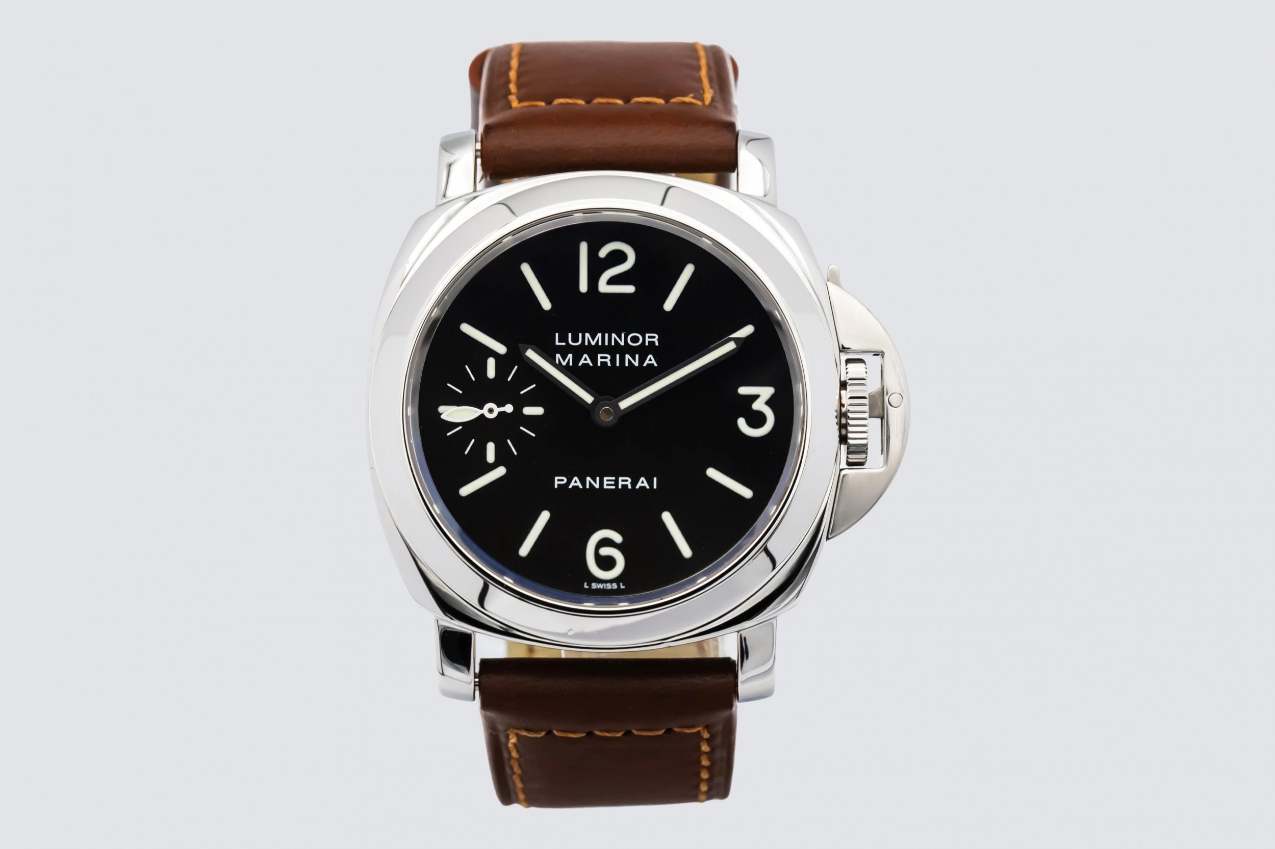 This 2015 Panerai Luminor Marina 44mm presents the brand’s signature cushion-shaped stainless steel case paired with a rich brown leather strap that enhances its rugged yet refined character. The classic black sandwich dial features large luminous Arabic numerals and markers, strong baton hands, and a small seconds sub-dial at 9 o’clock — all designed for exceptional legibility.