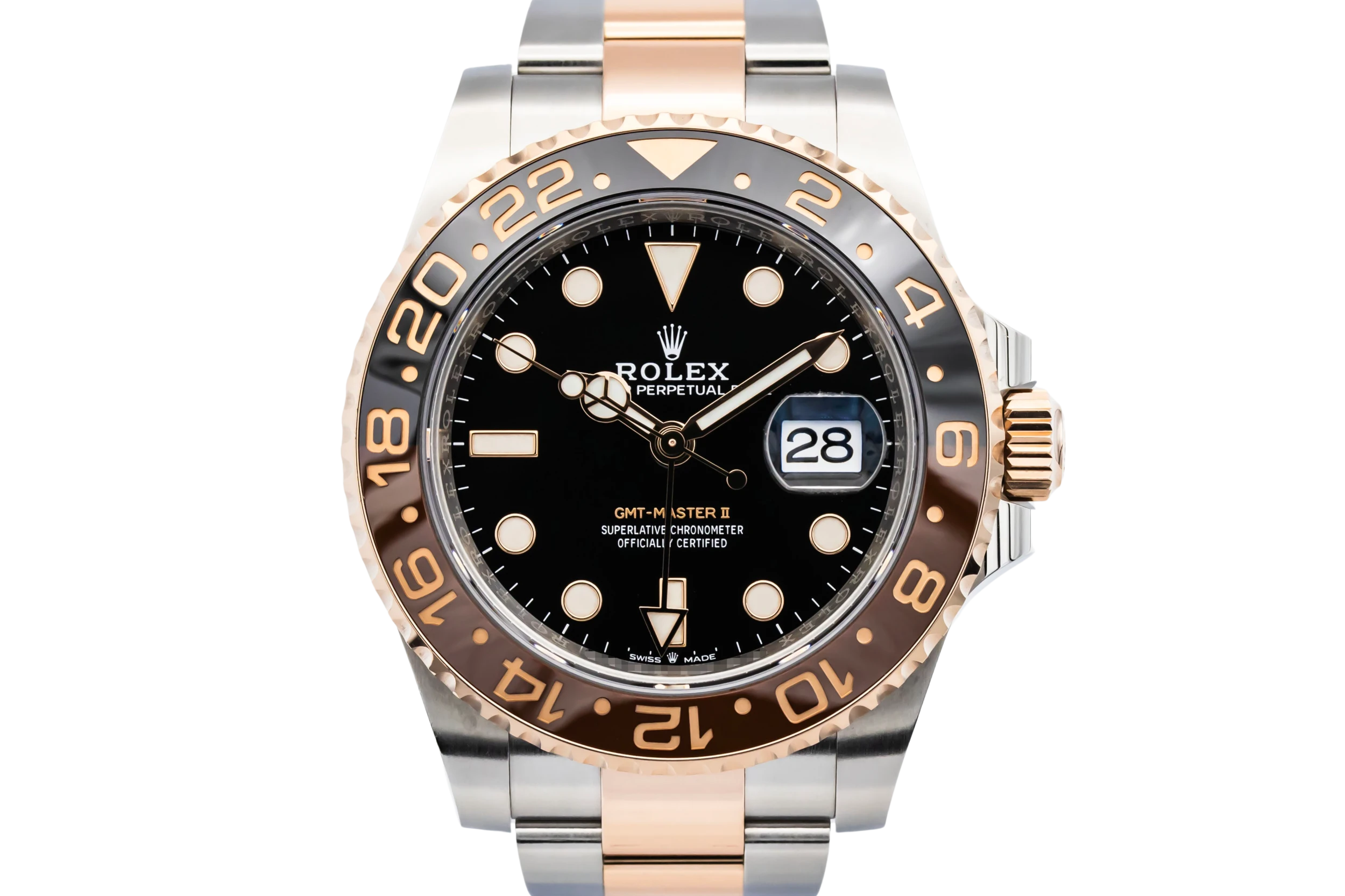 This 2022 Rolex GMT-Master II affectionately nicknamed “Rootbeer”, combines sporty performance with luxurious two-tone styling. Its 40mm Oystersteel case is paired with 18ct Everose gold on the bezel, crown, and centre links of the Oyster bracelet. The black dial features luminous baton and round hour markers alongside the signature Mercedes hands and a contrasting Everose GMT hand.