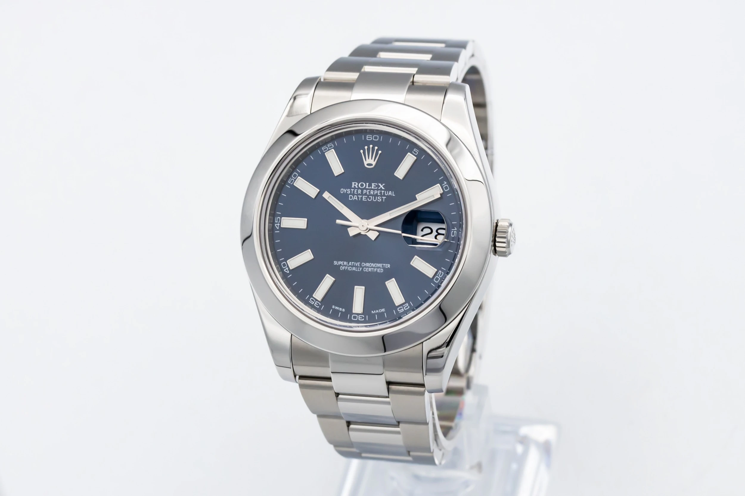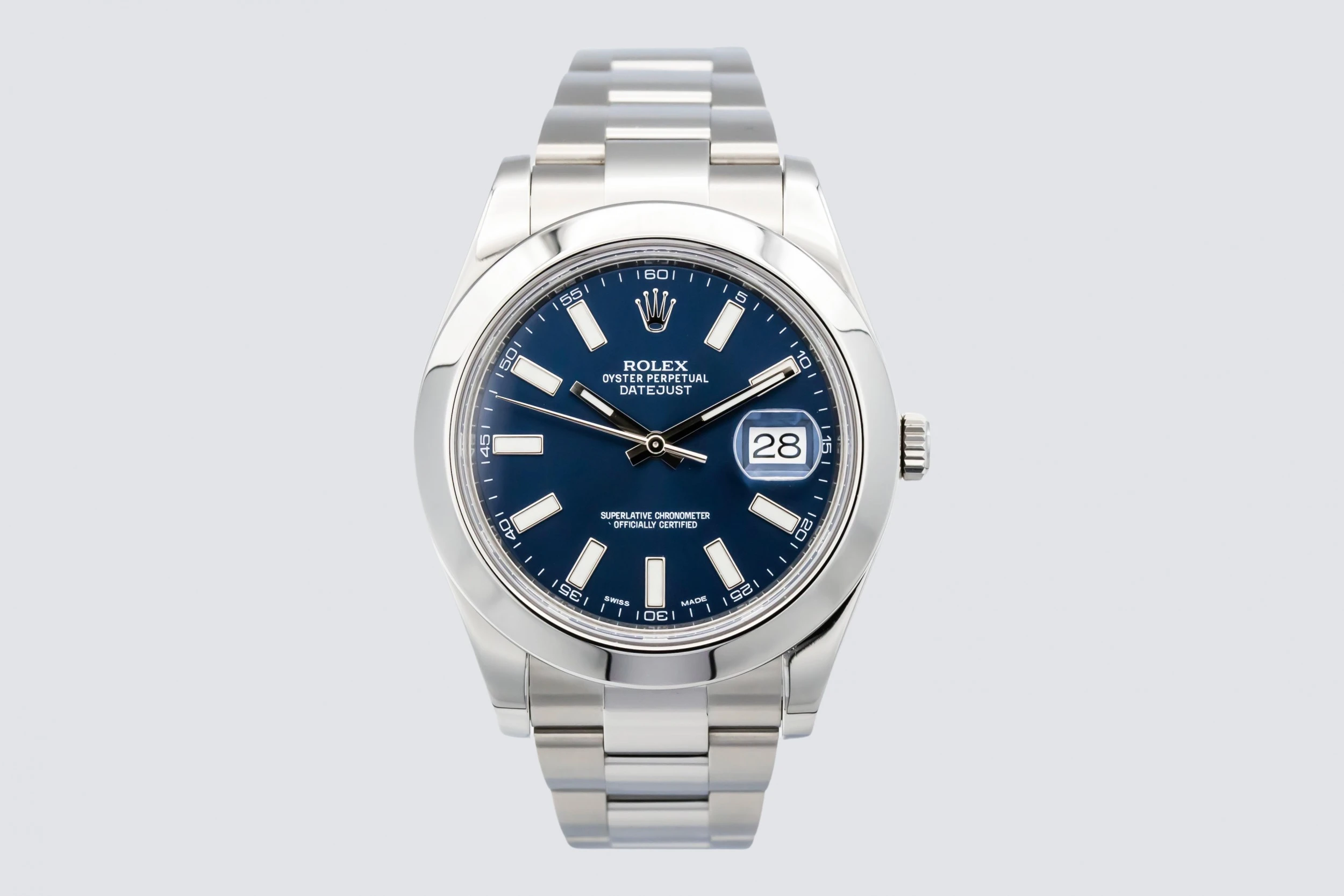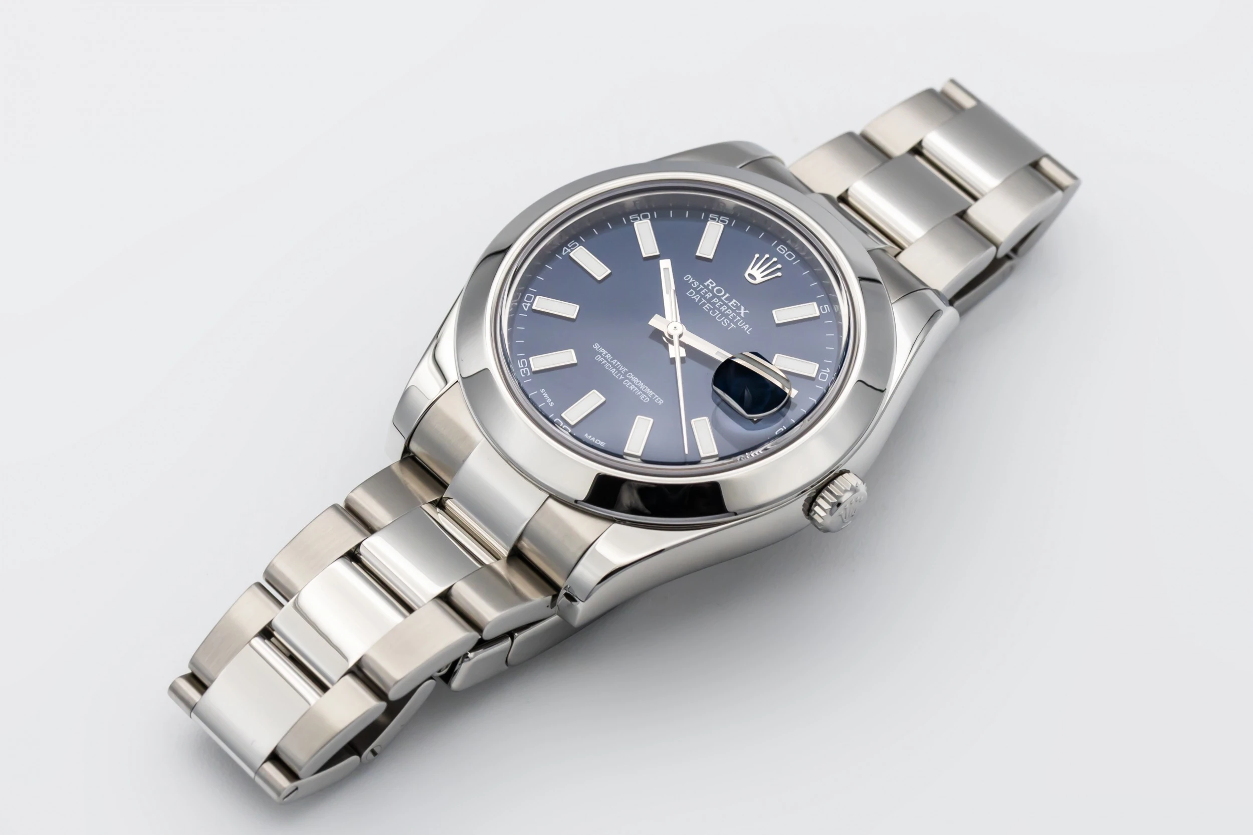 This 2013 Rolex DateJust features a blue dial that displays baton hour markers and polished hands with the signature date window at 3 o’clock, complete with a Cyclops lens for enhanced legibility. The smooth bezel and oystersteel bracelet complements the watch’s understated yet refined styling, making it suitable for both daily wear and formal occasions.