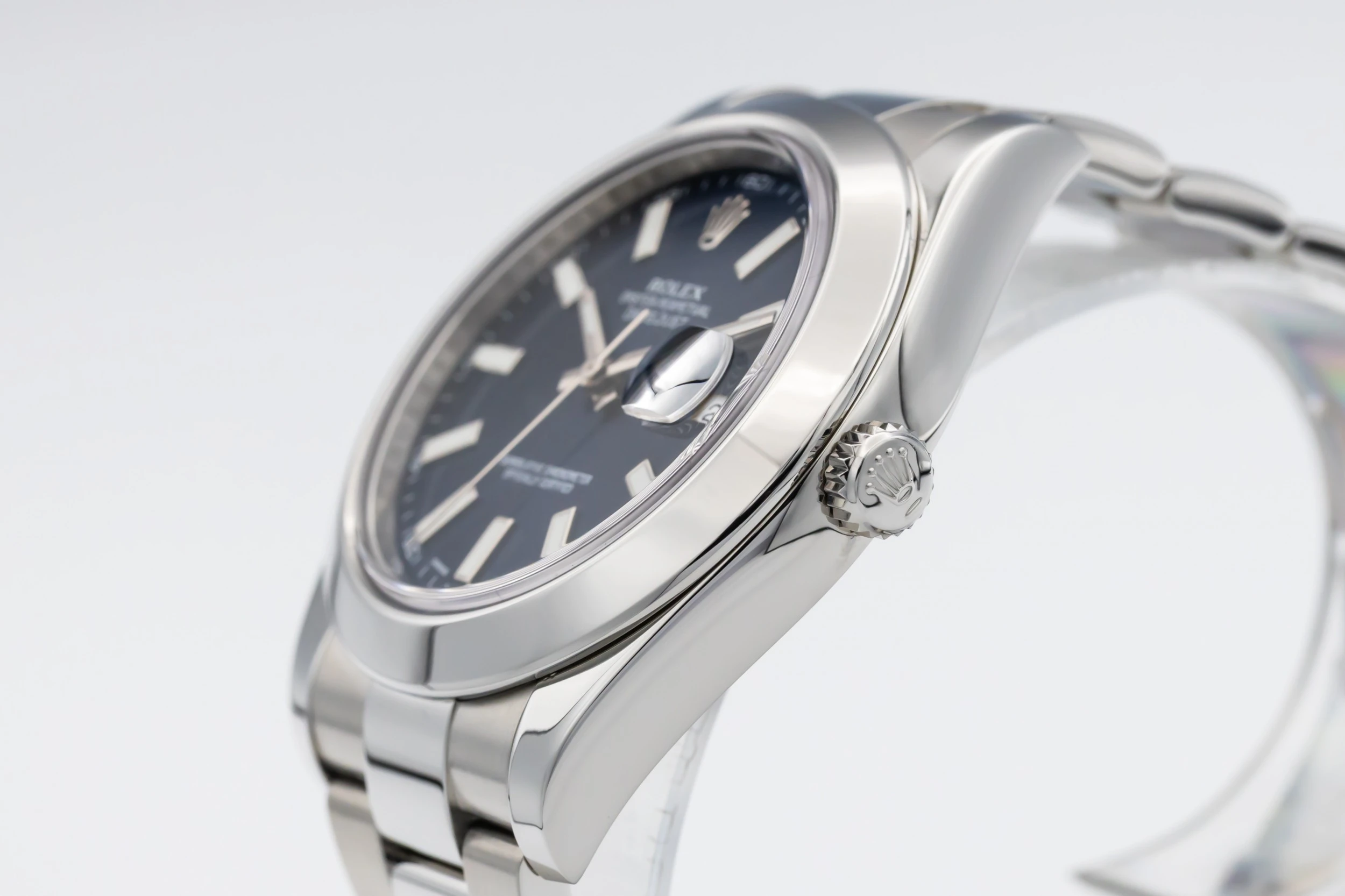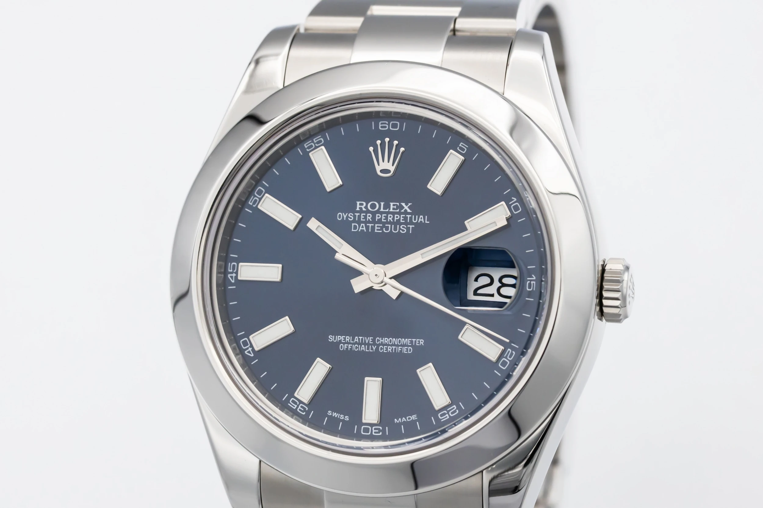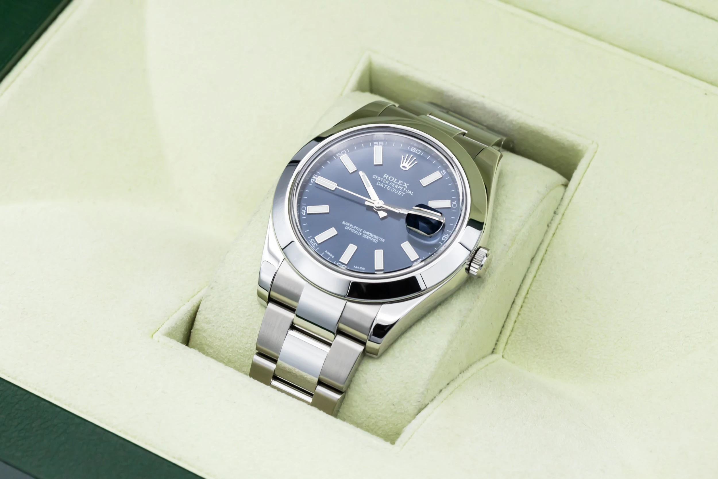 This 2013 Rolex DateJust features a blue dial that displays baton hour markers and polished hands with the signature date window at 3 o’clock, complete with a Cyclops lens for enhanced legibility. The smooth bezel and oystersteel bracelet complements the watch’s understated yet refined styling, making it suitable for both daily wear and formal occasions.