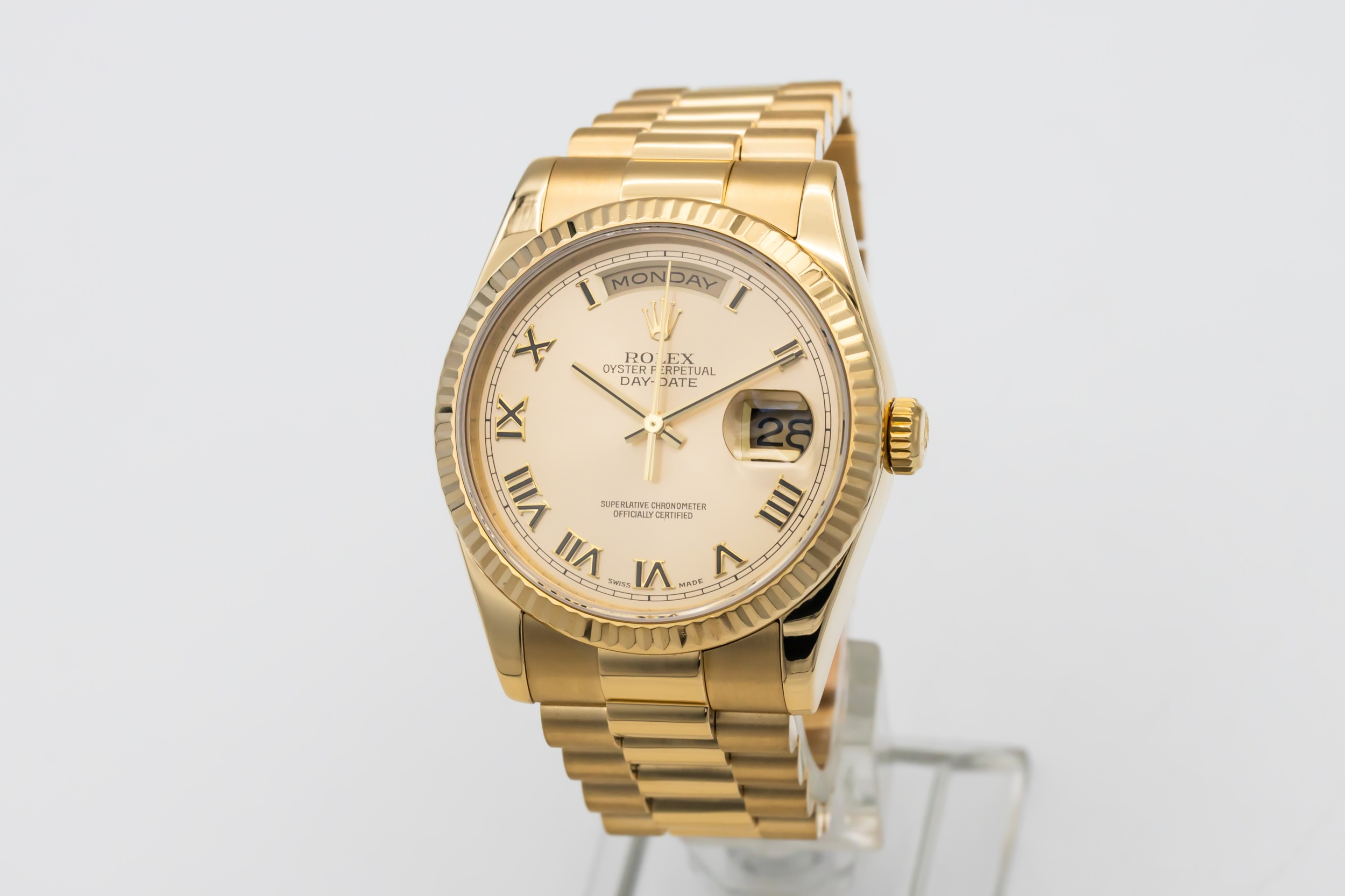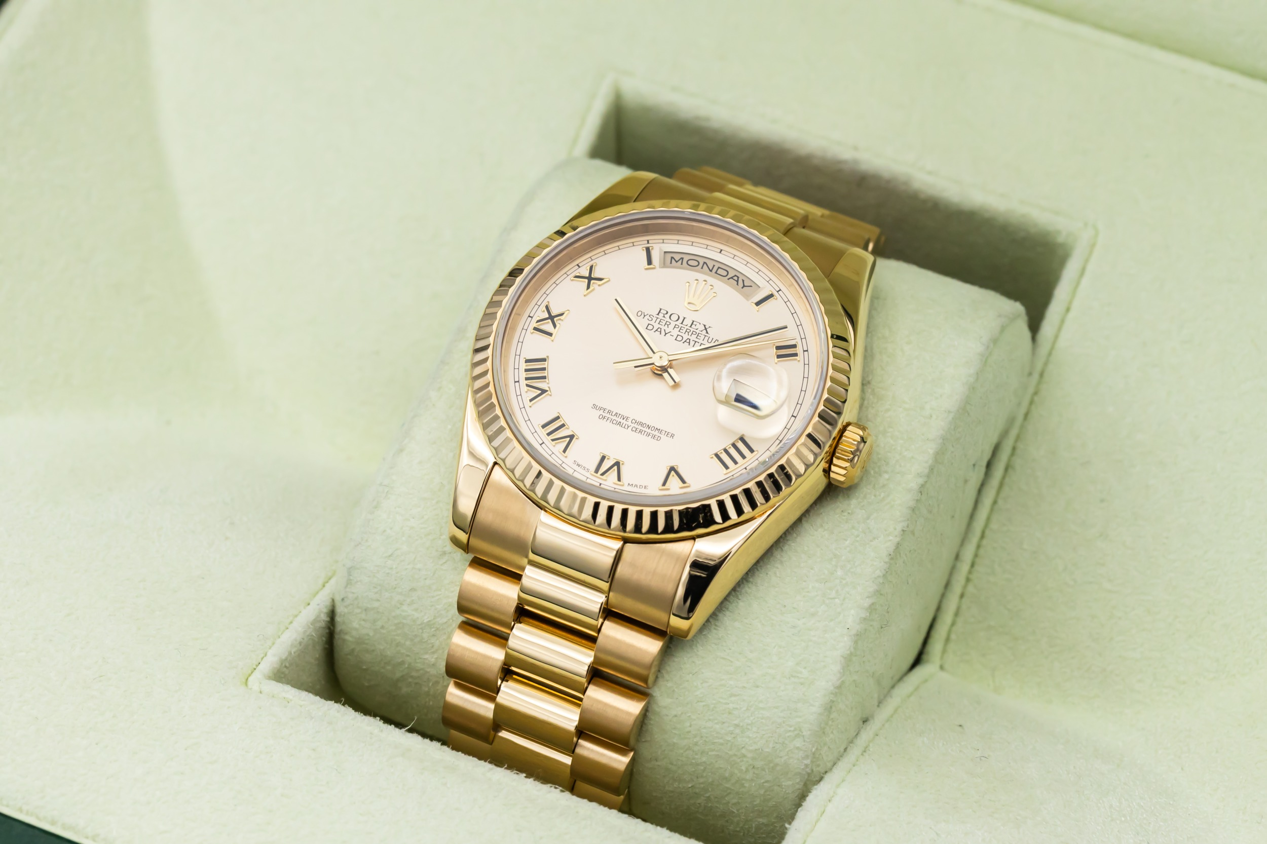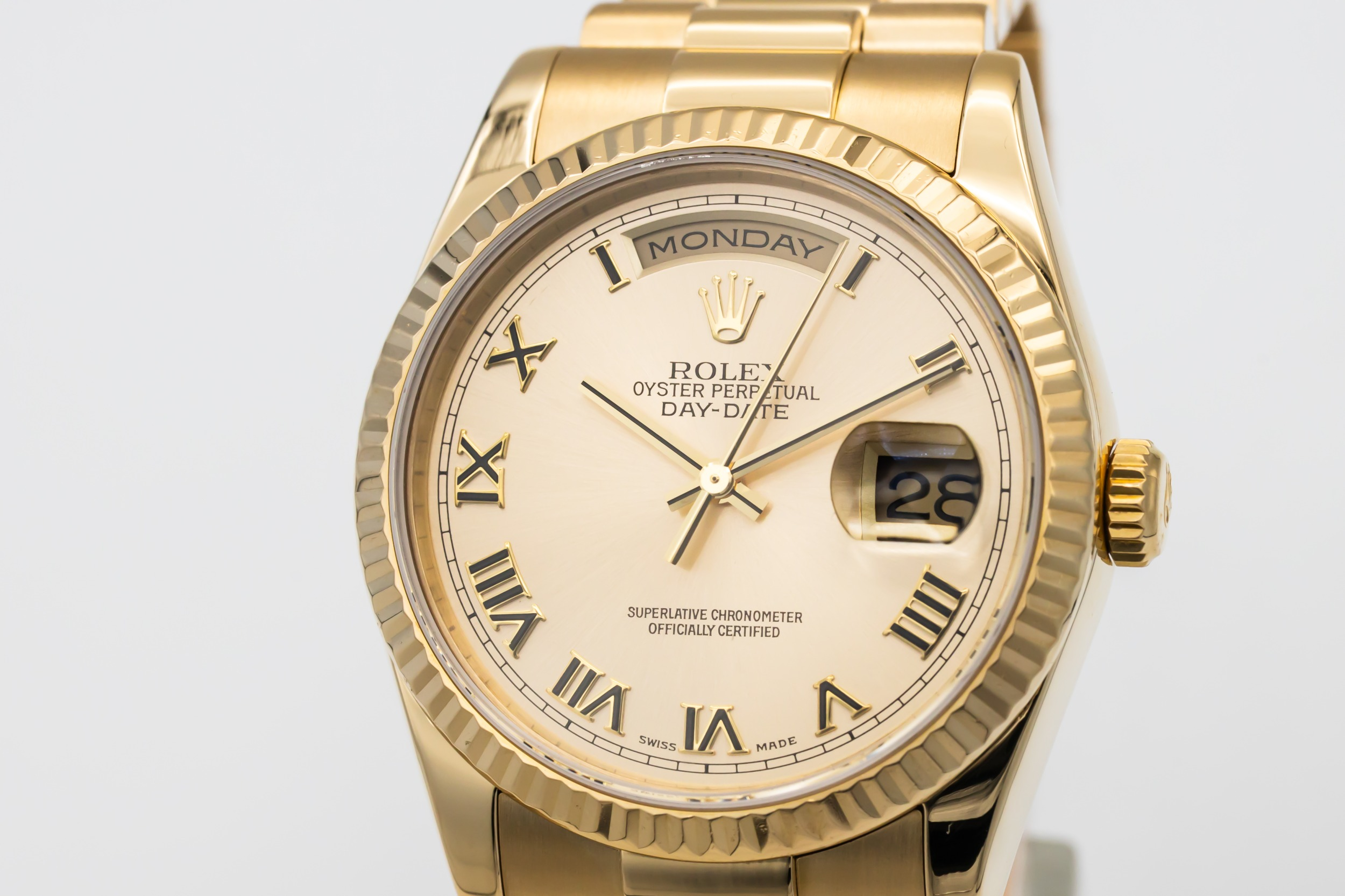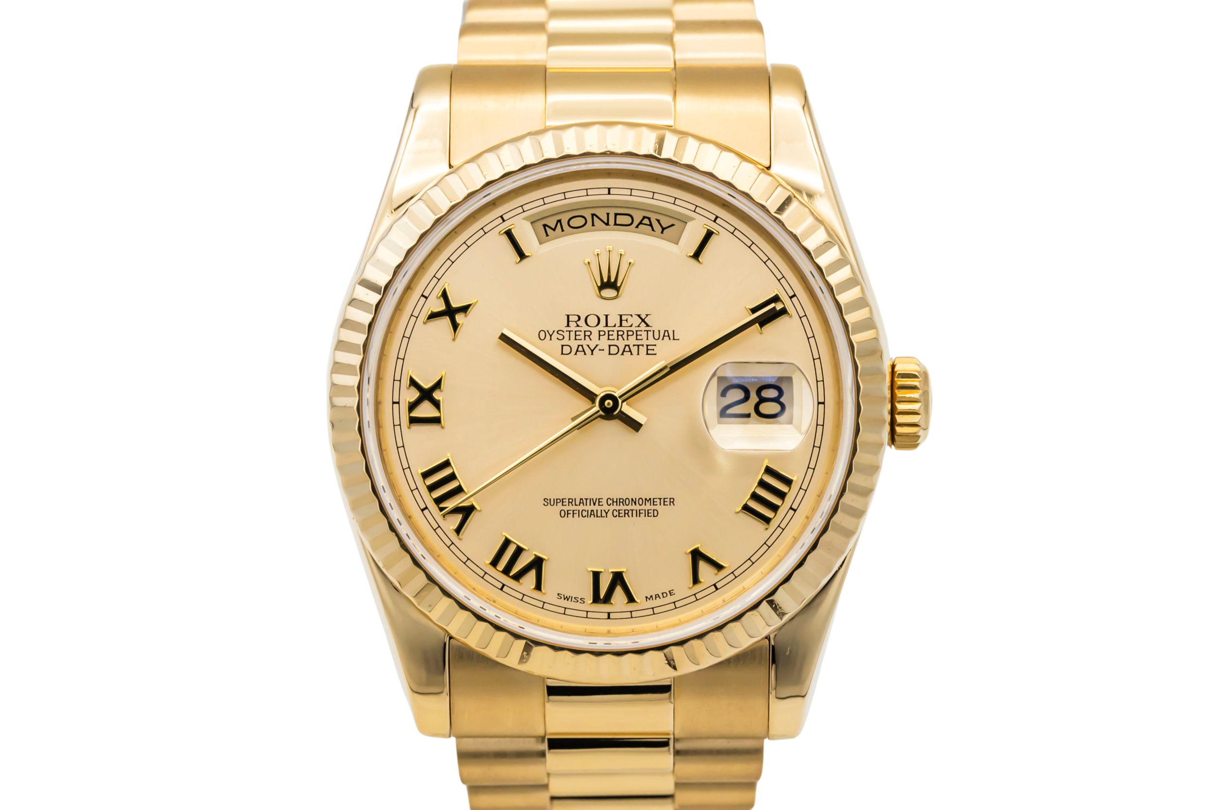 This 2000 Rolex Day-Date 36mm in solid 18ct yellow gold showcases the timeless prestige of the iconic “President” line. This reference, 118238 features the classic fluted bezel, a sundust roman numeral dial with day and date display, and the distinguished Presidential bracelet—renowned for its comfort and unmistakable luxury.