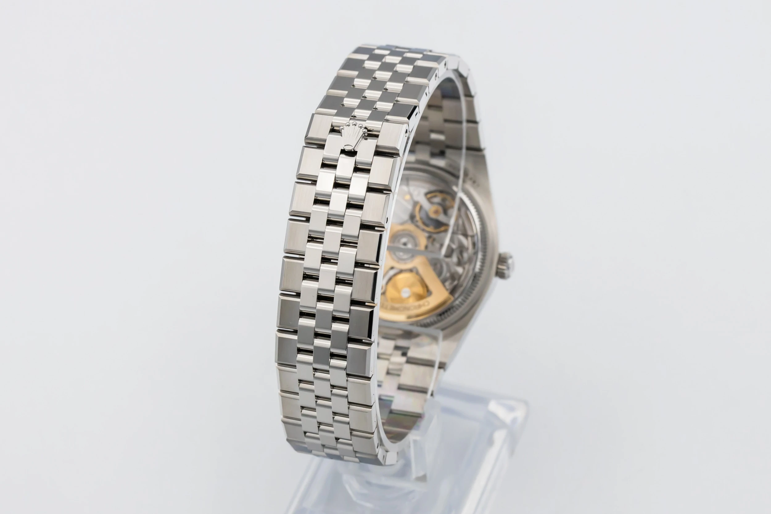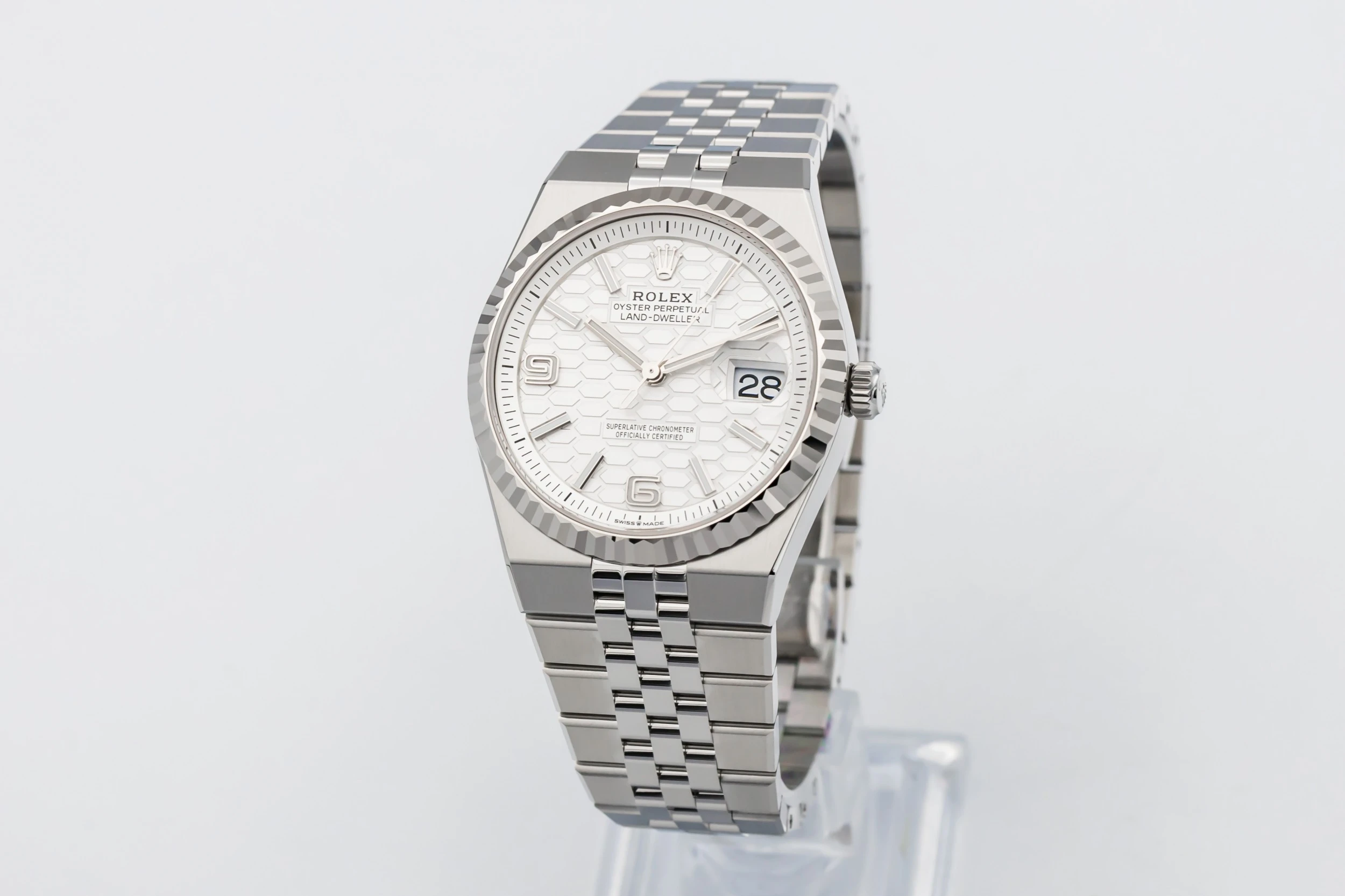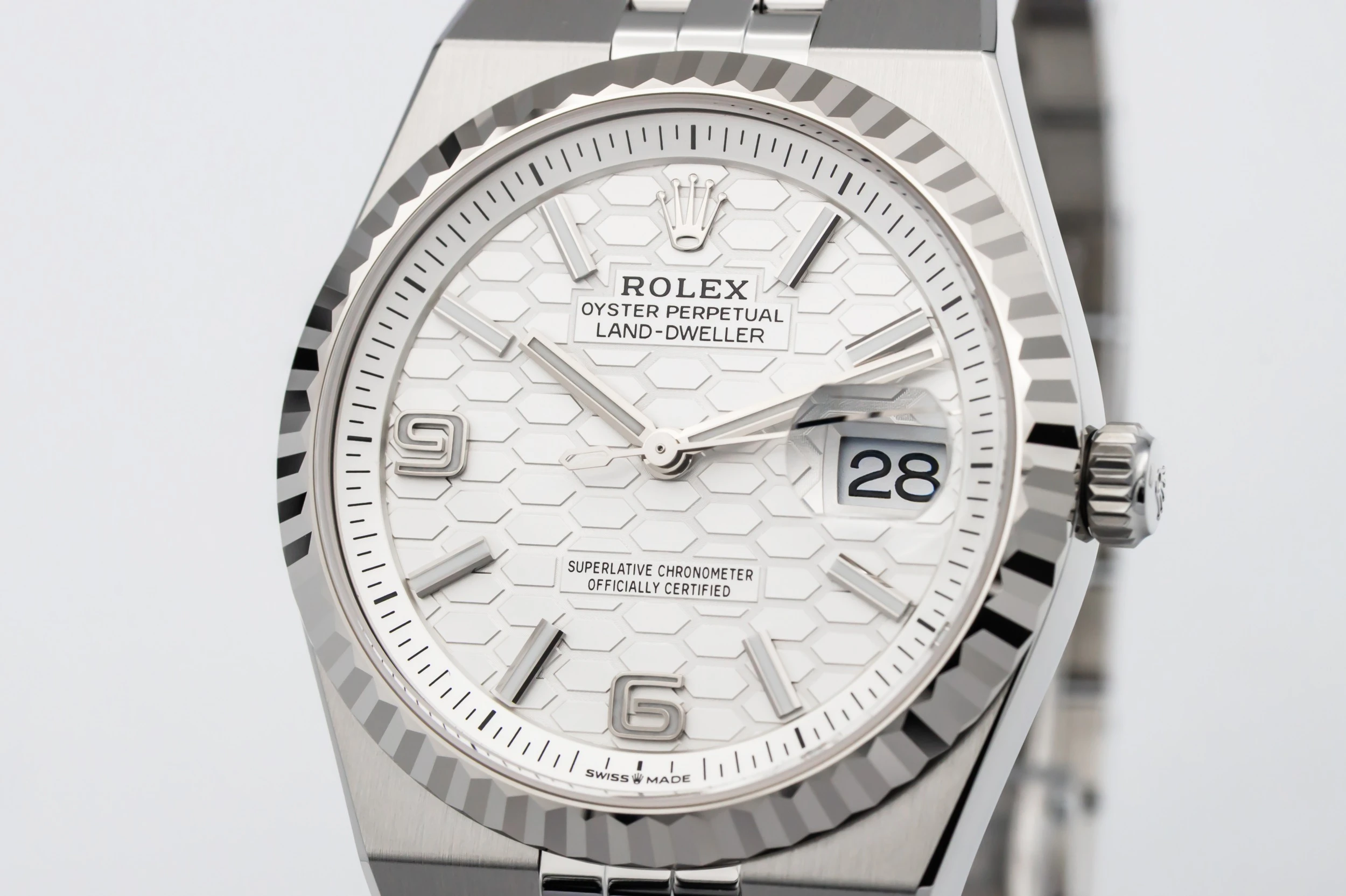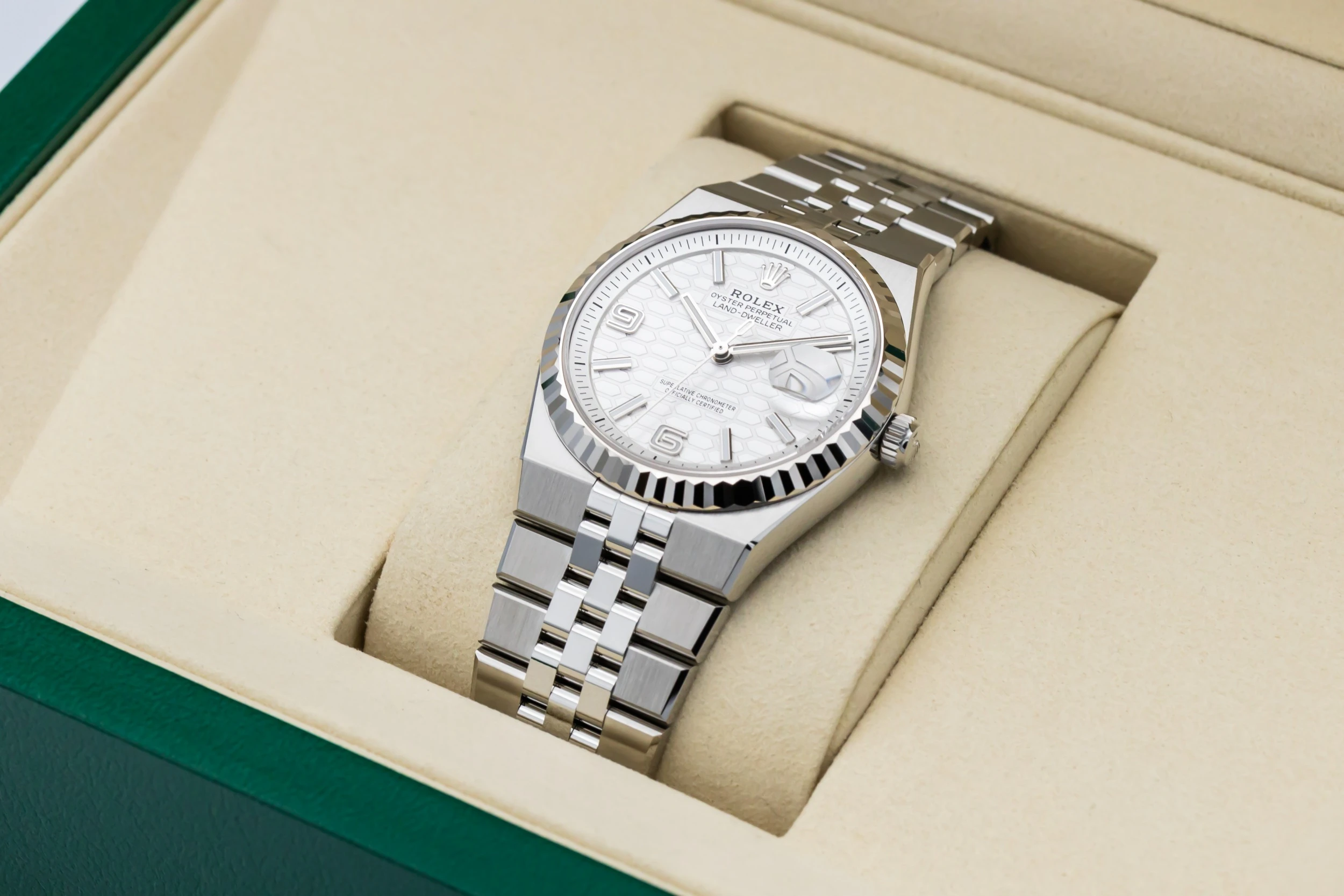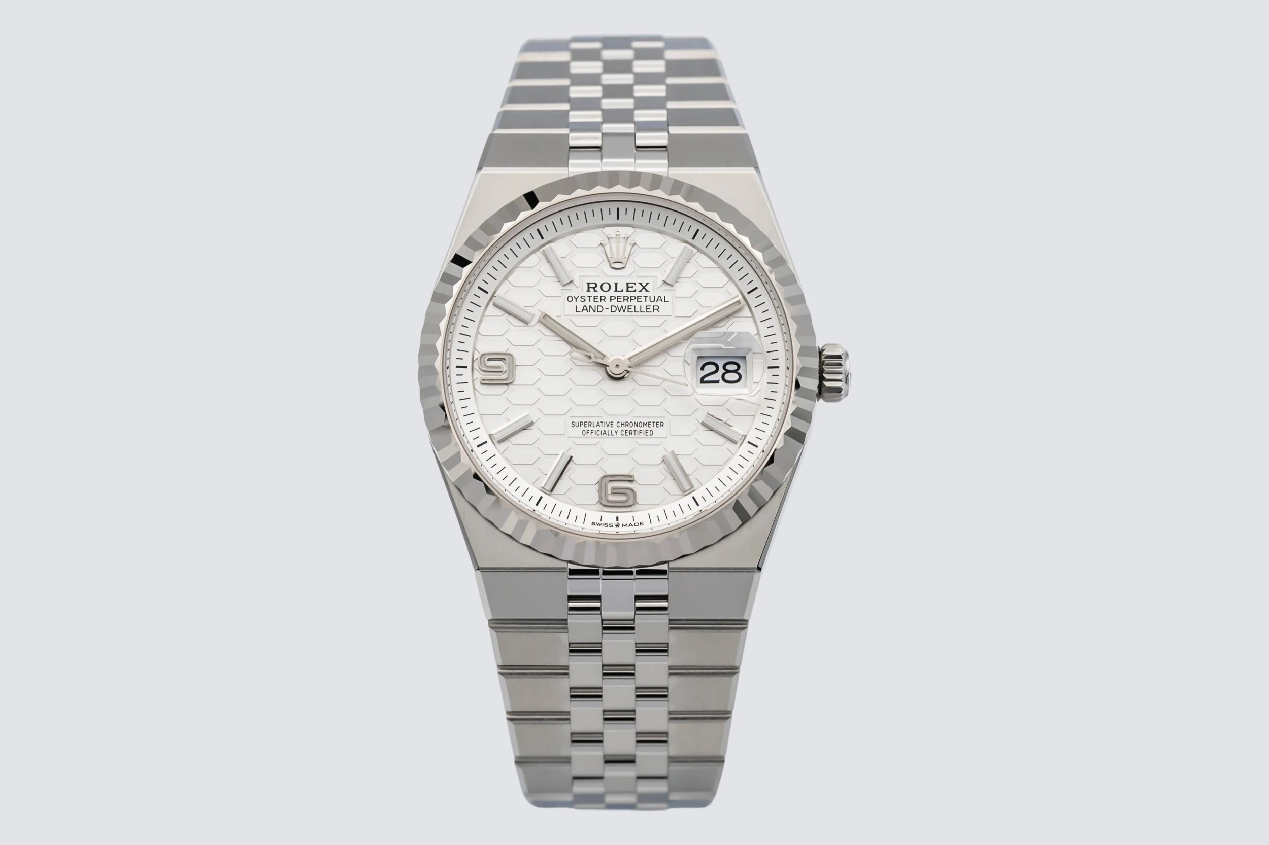 The 2025 Rolex Land-Dweller 36mm features a white dial with luminous baton hour markers, polished hands, and a date window at 3 o’clock framed by the Cyclops lens for enhanced legibility. At 36mm, the case delivers balanced proportions, while the Flat Jubilee bracelet enhances comfort and aesthetic fluidity, making the piece suitable for both everyday wear and travel.
