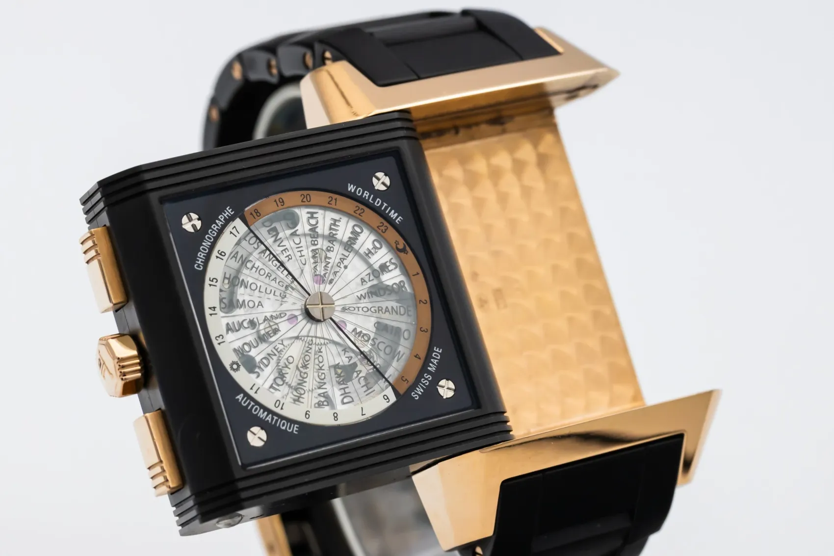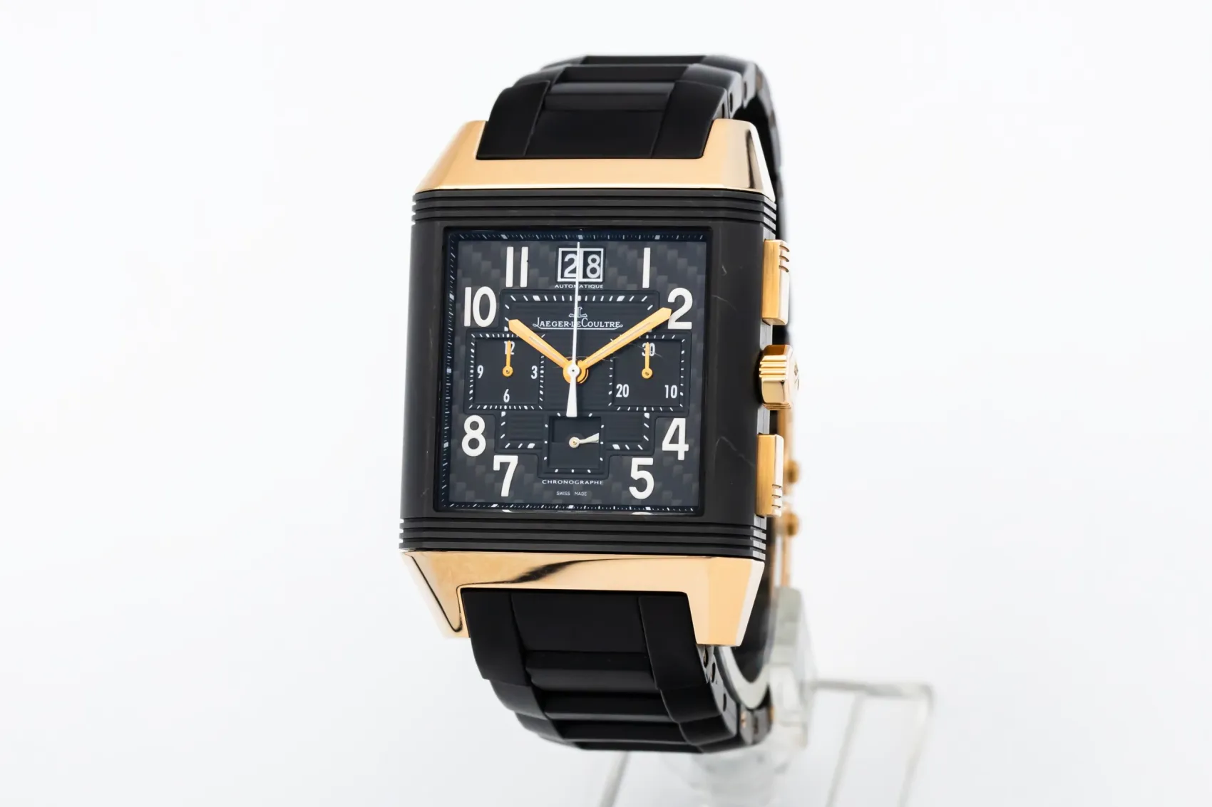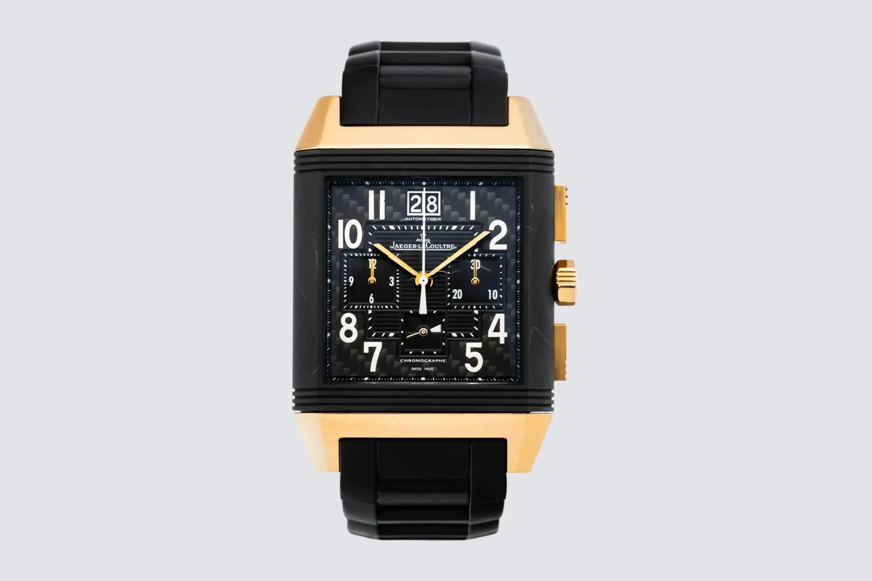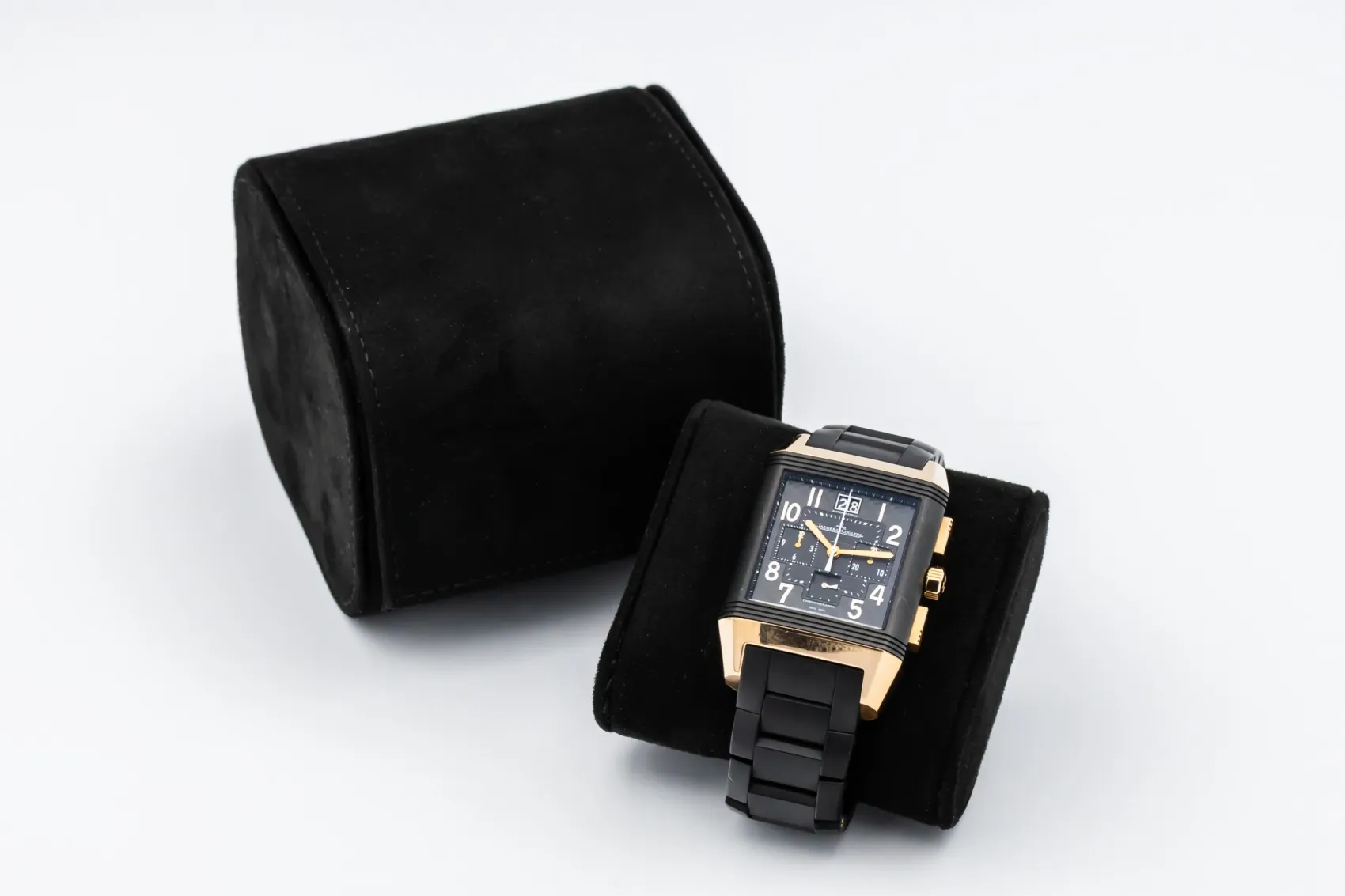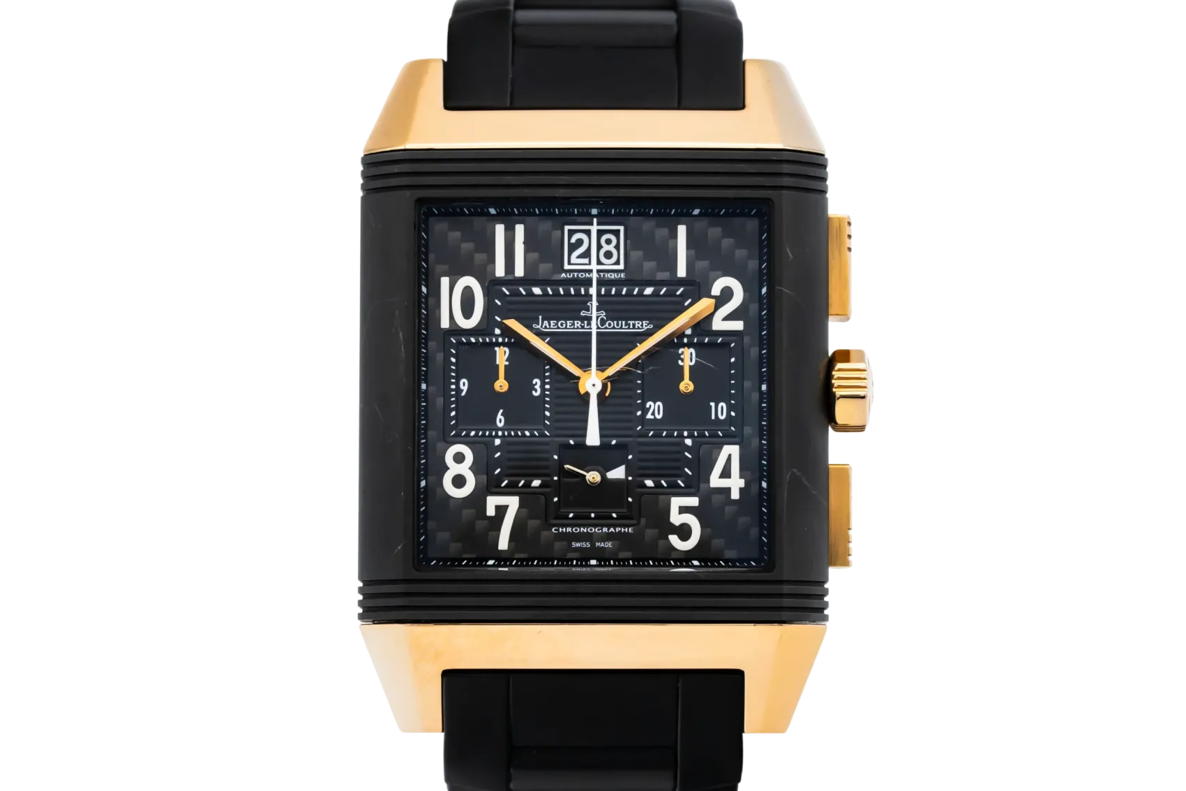 finance this from £281.41 p/m call the shop Read about our Limited Lifetime WarrantyThis circa 2000s Jaeger-LeCoultre Reverso Squadra Chronograph GMT 36mm features a robust stainless steel case paired with a sporty black rubber strap. The reversible case reveals a finely detailed dial with dual time-zone display, chronograph sub-dials, and a small seconds indicator — all finished with luminous hands and arabic markers for enhanced legibility.