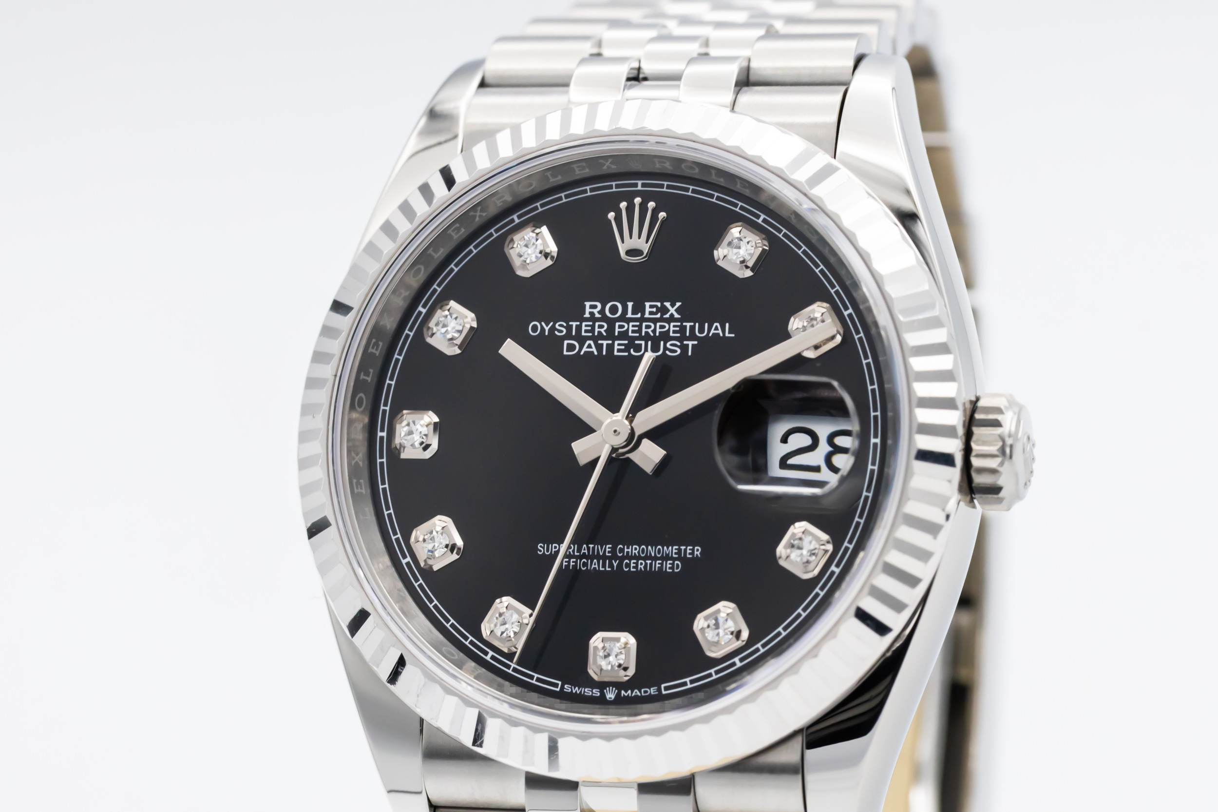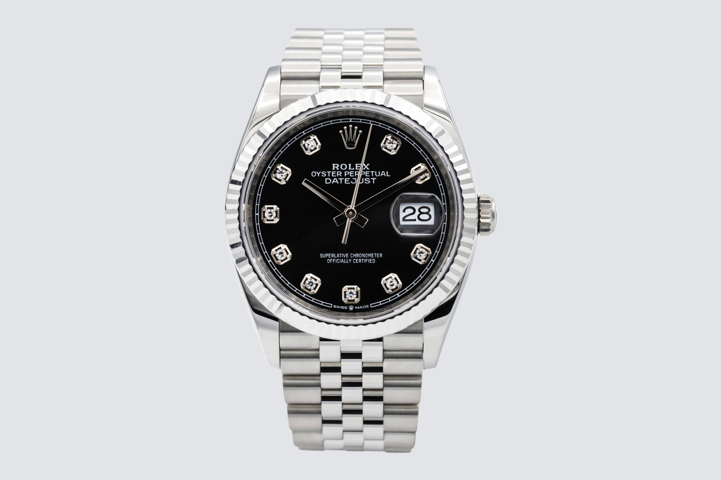 This 2021 Rolex DateJust 36mm features a black dial that is complemented by diamond hour markers, offering excellent legibility and a refined look. A signature fluted white gold bezel frames the dial beautifully, while the iconic Jubilee bracelet adds comfort and sophistication with its five-piece link design.