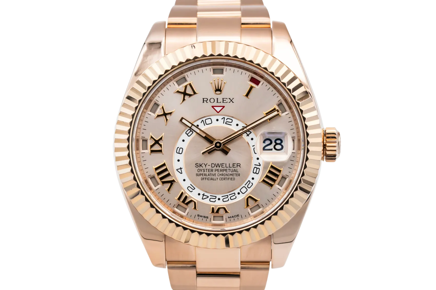 finance this from £402.09 p/m call the shop Read about our Limited Lifetime WarrantyThe 2017 Rolex Sky-Dweller 42mm is a commanding luxury timepiece crafted from 18ct rose gold featuring a bold 42mm Oyster case. The sundust dial is clean and highly legible, displaying applied baton hour markers alongside Rolex’s signature off-centre 24-hour disc for dual time tracking. Completed with a 18ct rose gold oyster bracelet and secure Oysterclasp, this Sky-Dweller perfectly balances contemporary design with classic Rolex sports-luxury appeal.