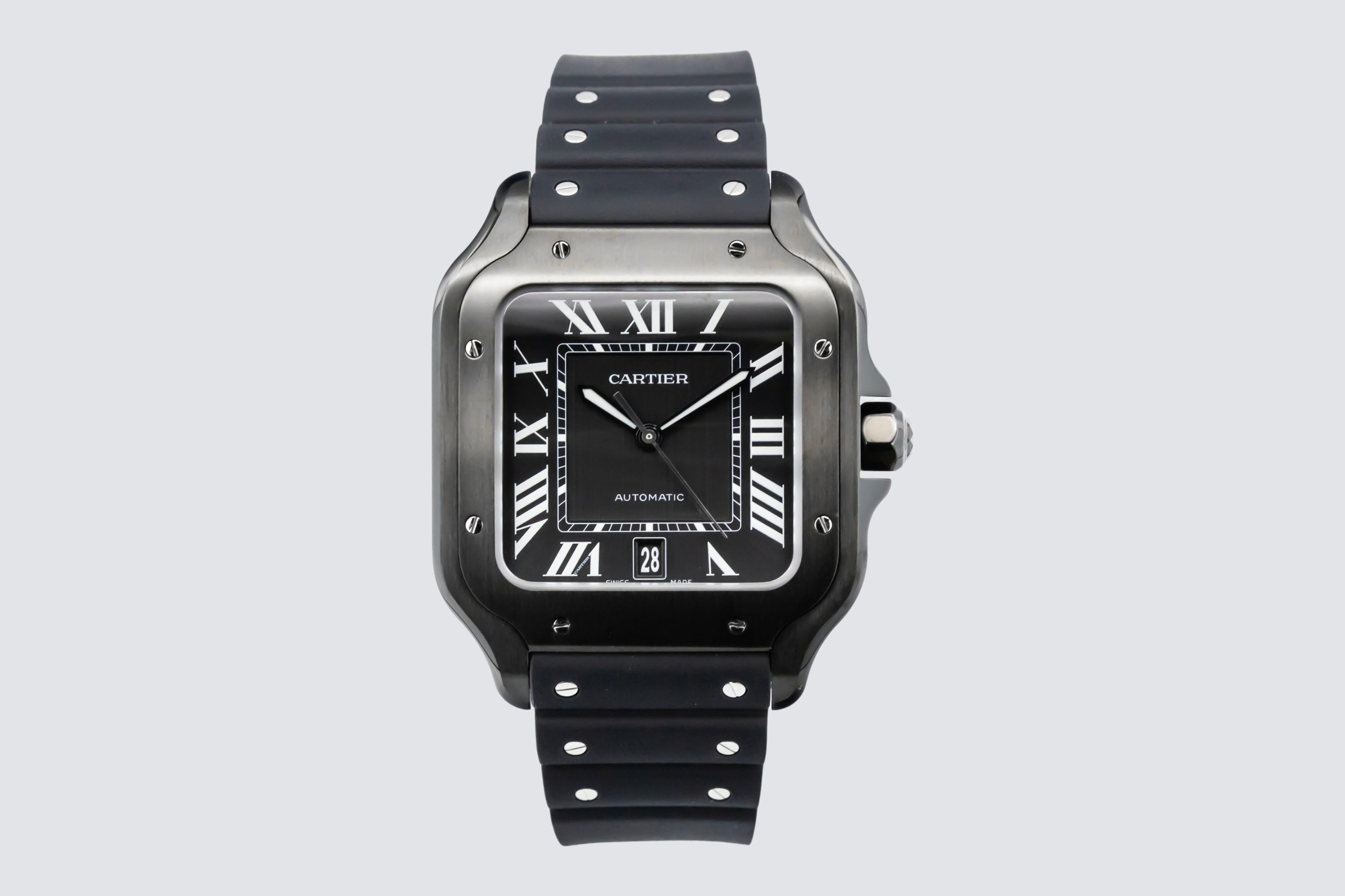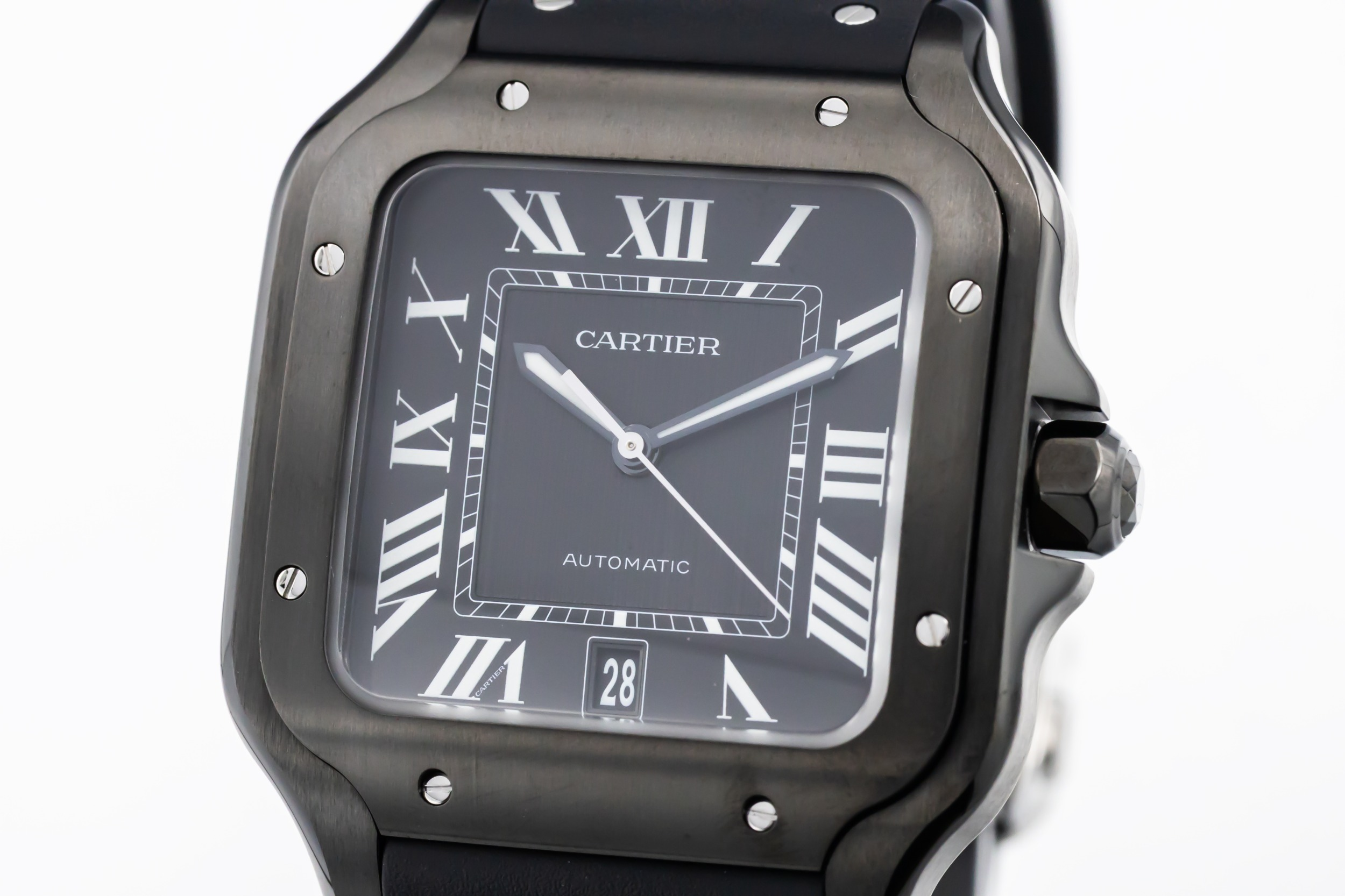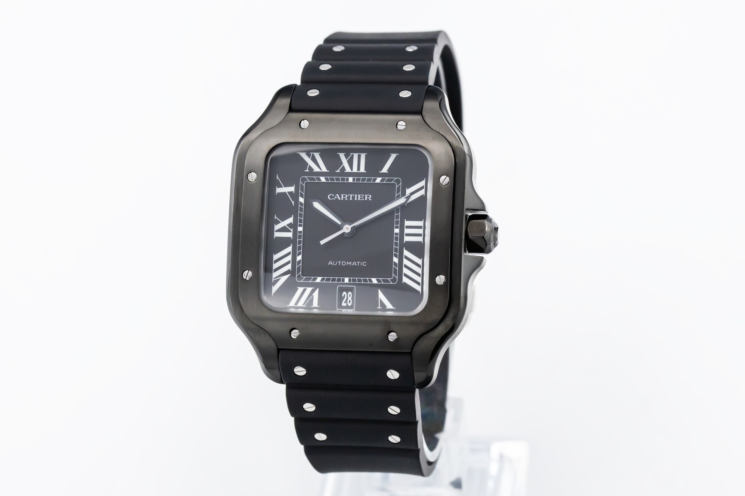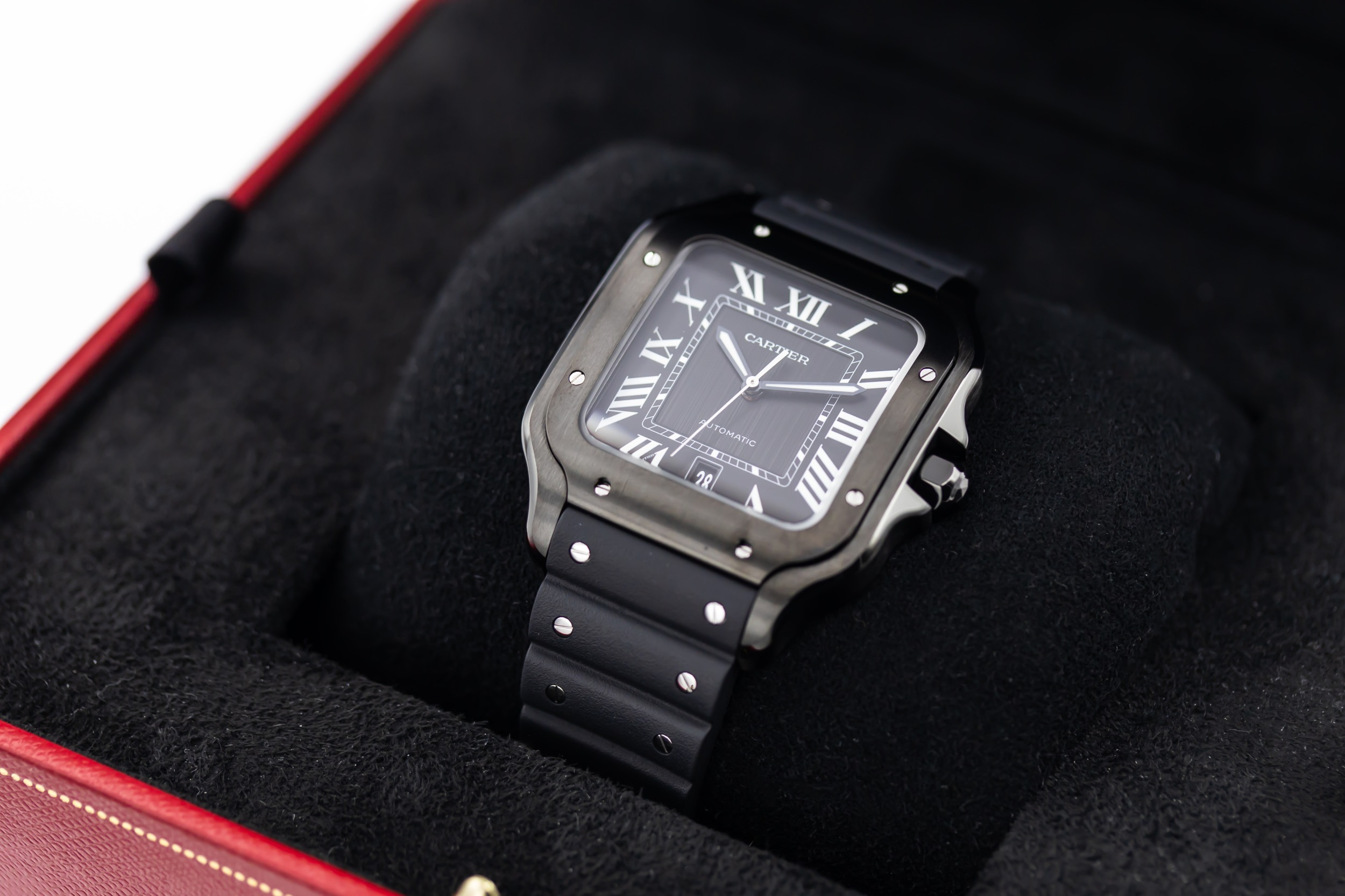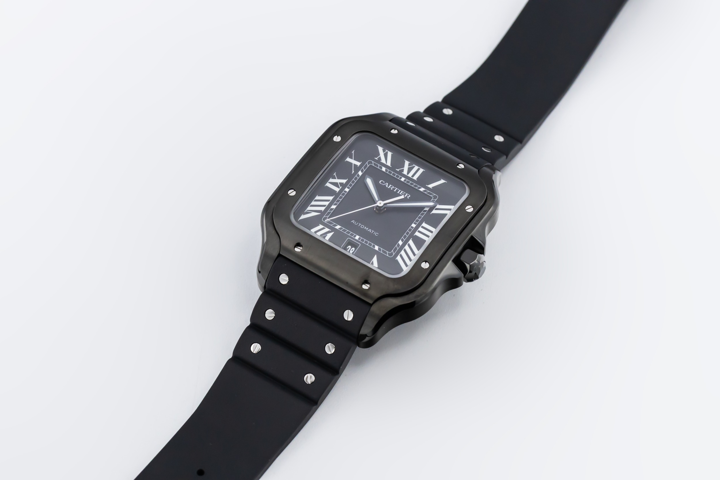 The 2025 Cartier De Santos ADLC 39.8mm features a bold black opaline dial is set with Cartier’s signature Roman numerals and polished sword-shaped hands, all framed by the square bezel with exposed screws — a hallmark of the Santos family. The ADLC-coated stainless steel case enhances durability and scratch resistance.