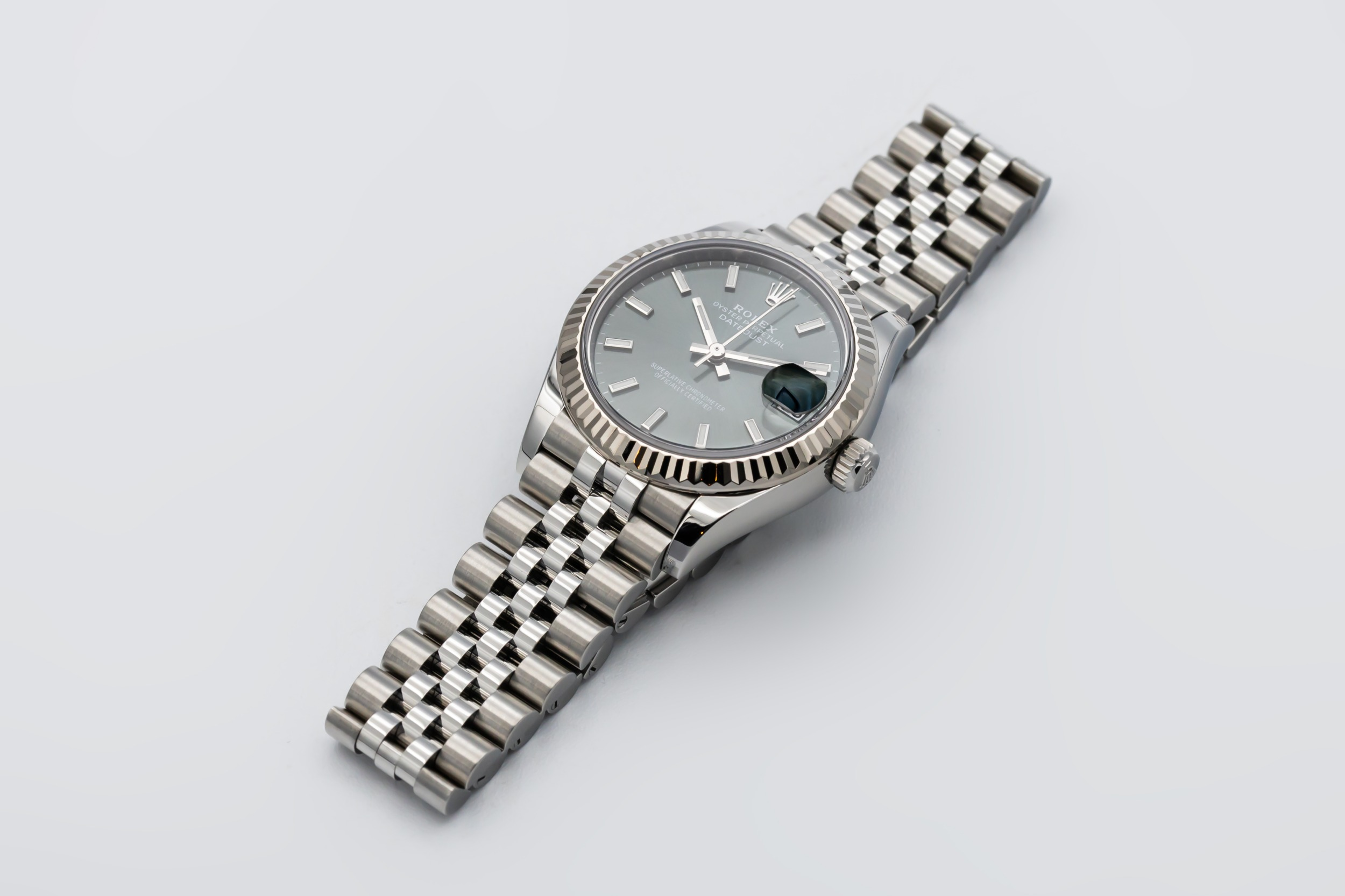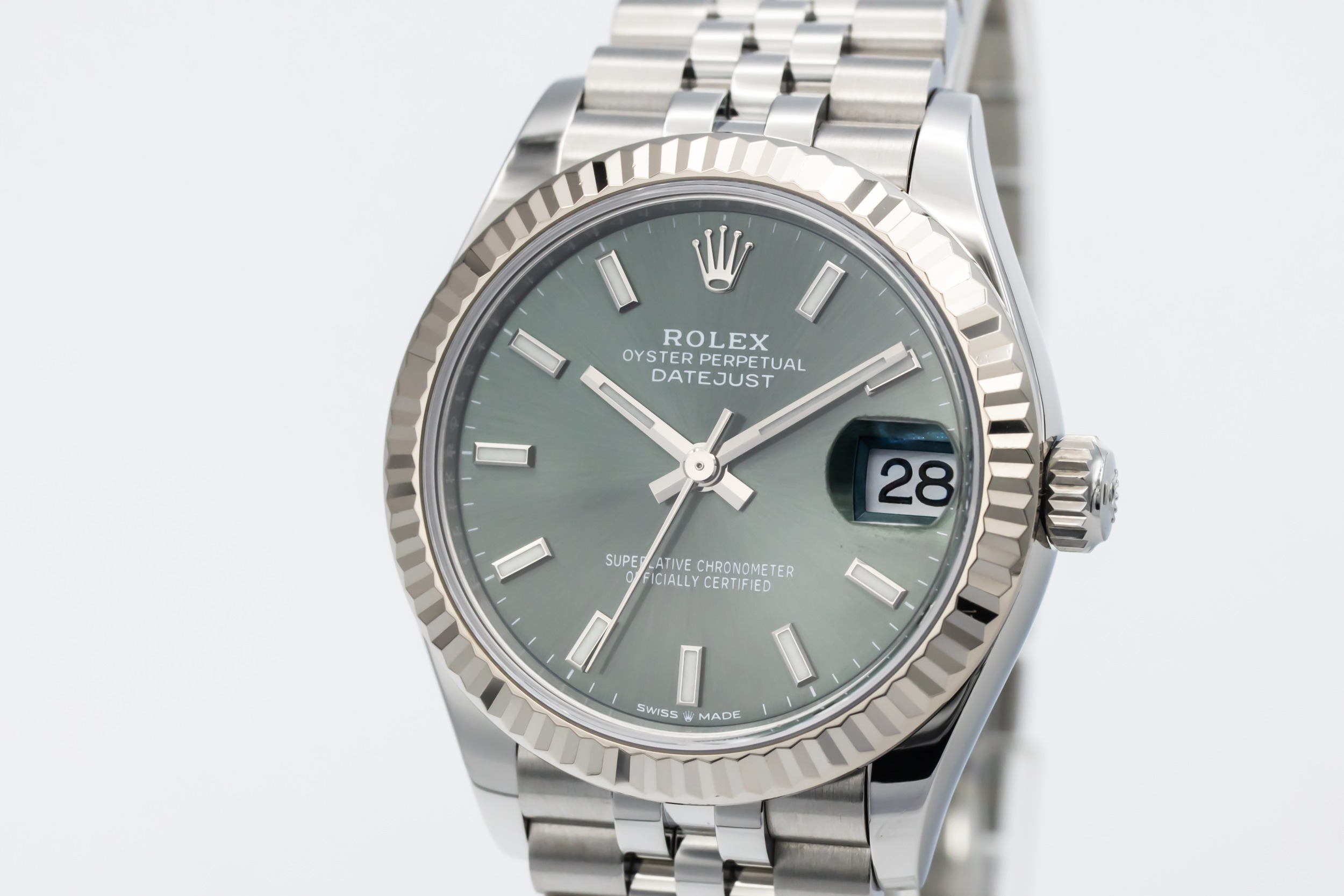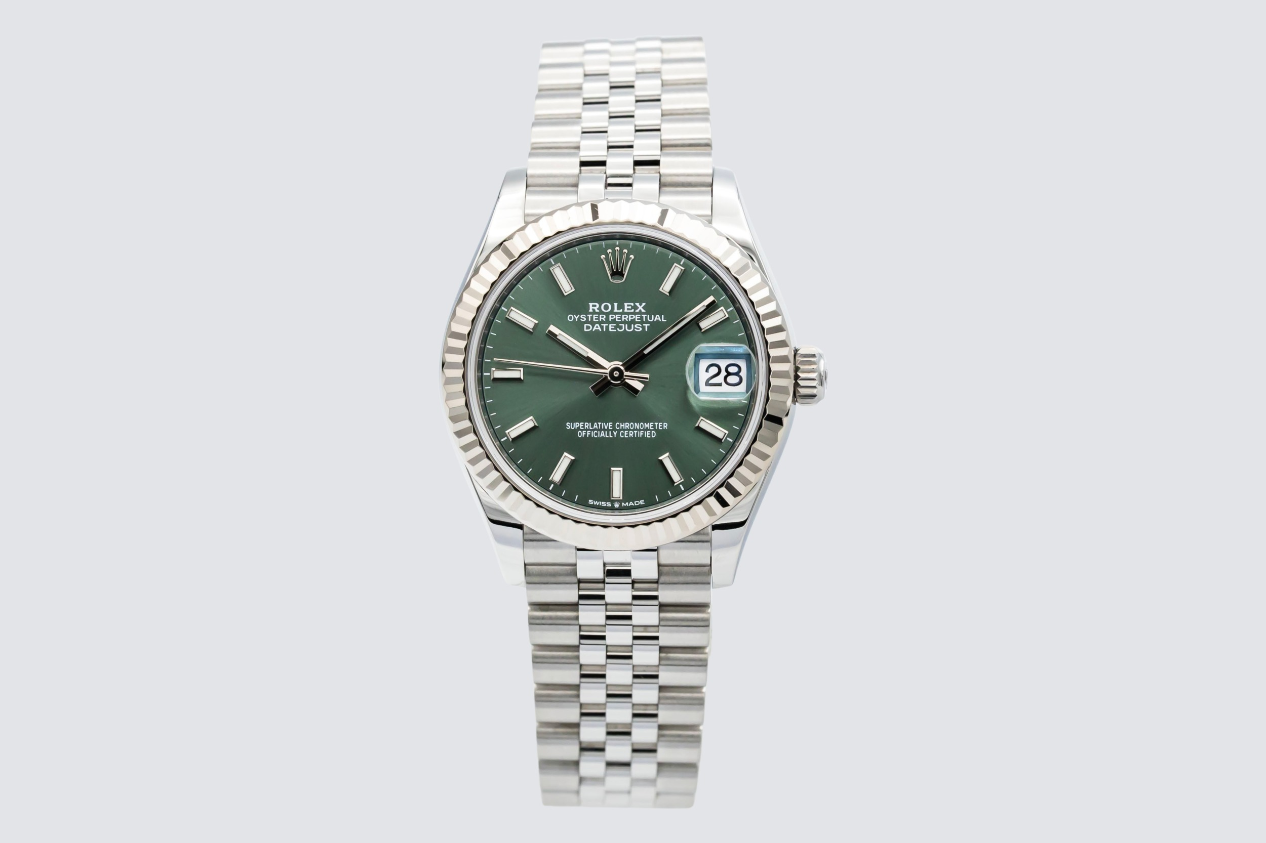 This 2021 Rolex DateJust 31mm features a mint green dial, detailed with sleek baton hour markers and polished hands that enhance legibility and visual appeal. The 18ct white gold bezel frames the dial beautifully, and the classic date window at 3 o’clock is magnified by Rolex’s signature Cyclops lens for clear, everyday usability. Paired with a stainless steel jubilee bracelet.