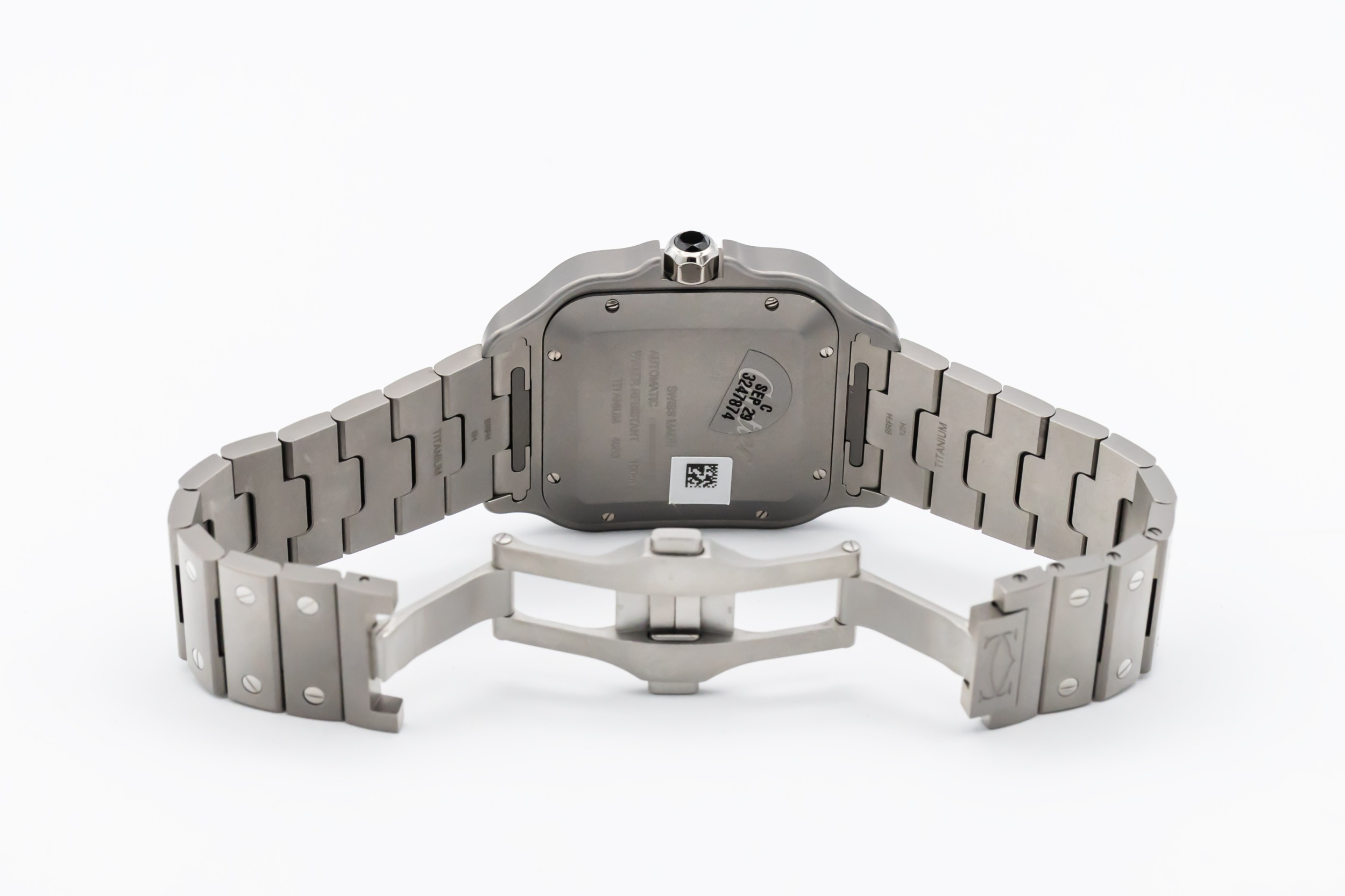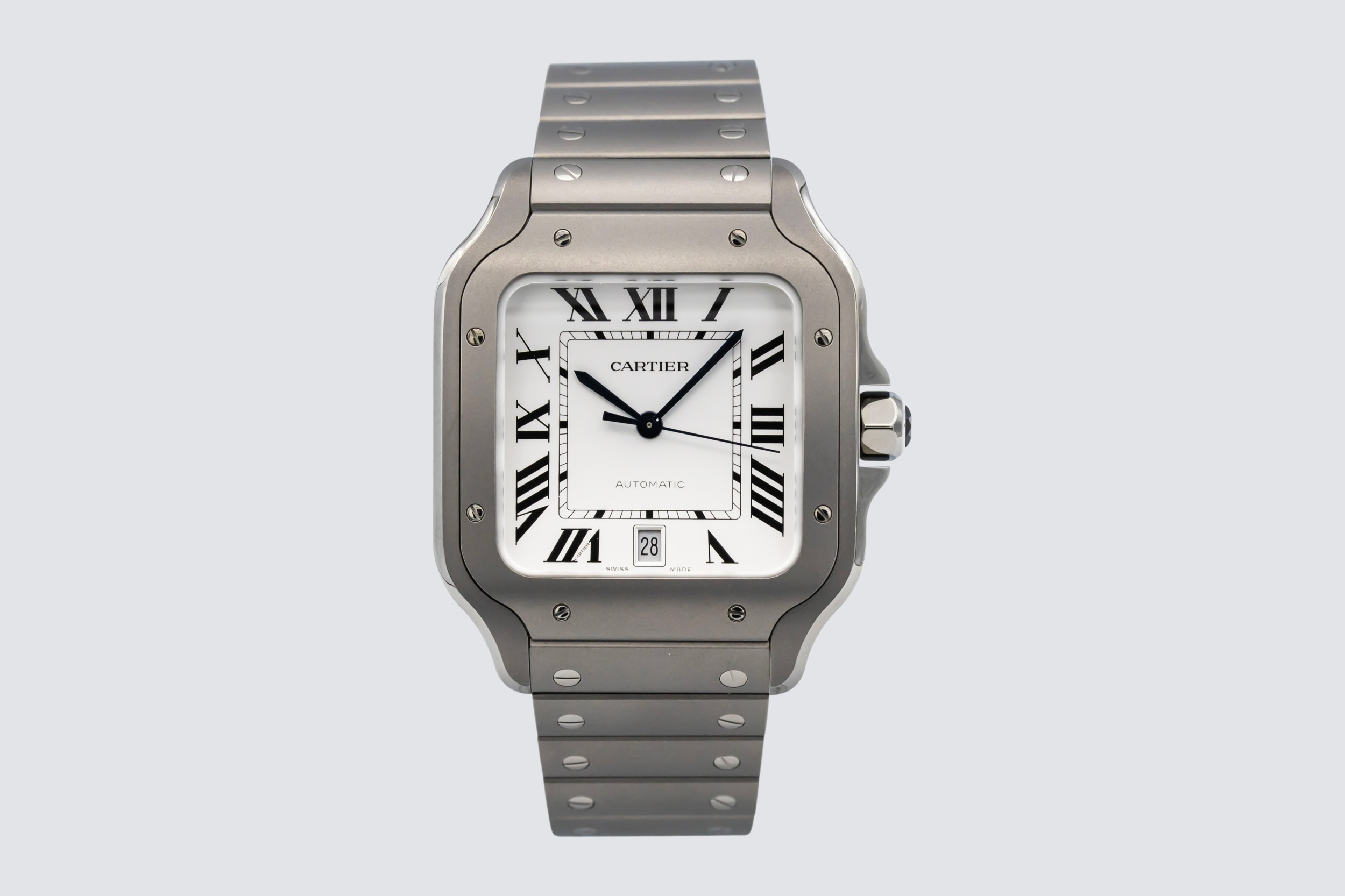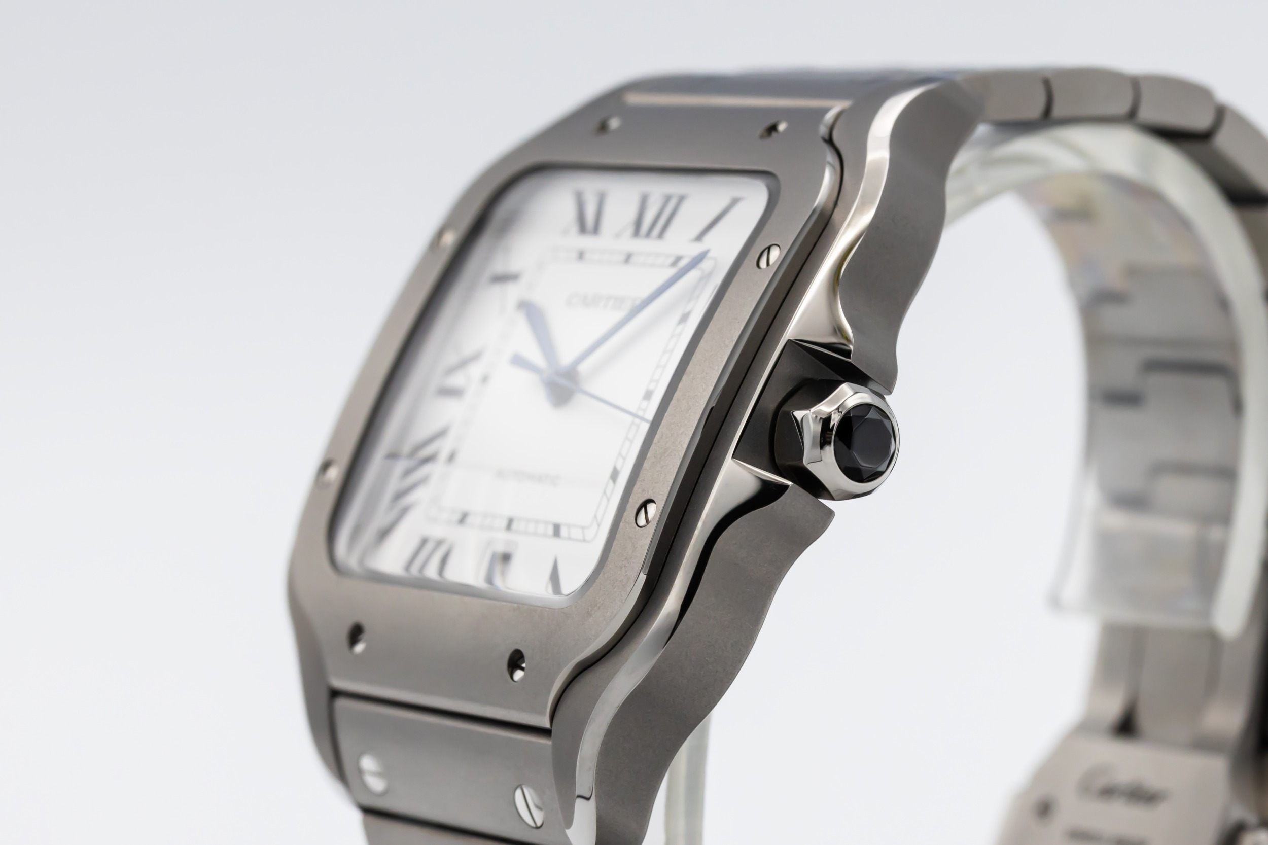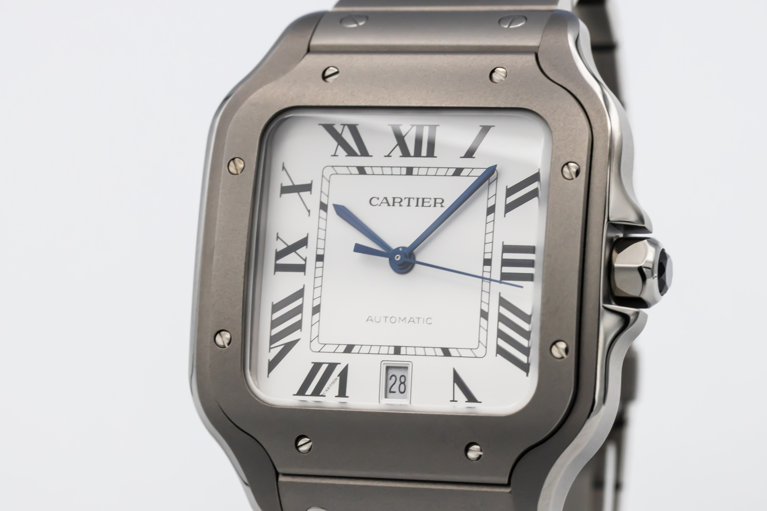 This 2025 Cartier Santos de Cartier 39.8mm features a silver opaline dial with bold black Roman numerals, elegant Cartier sword hands, and a date window at 6 o’clock. Fitted on a titanium strap — often presented with Cartier’s QuickSwitch system for easy interchangeability — this Santos strikes the perfect balance between contemporary sportiness and timeless elegance.