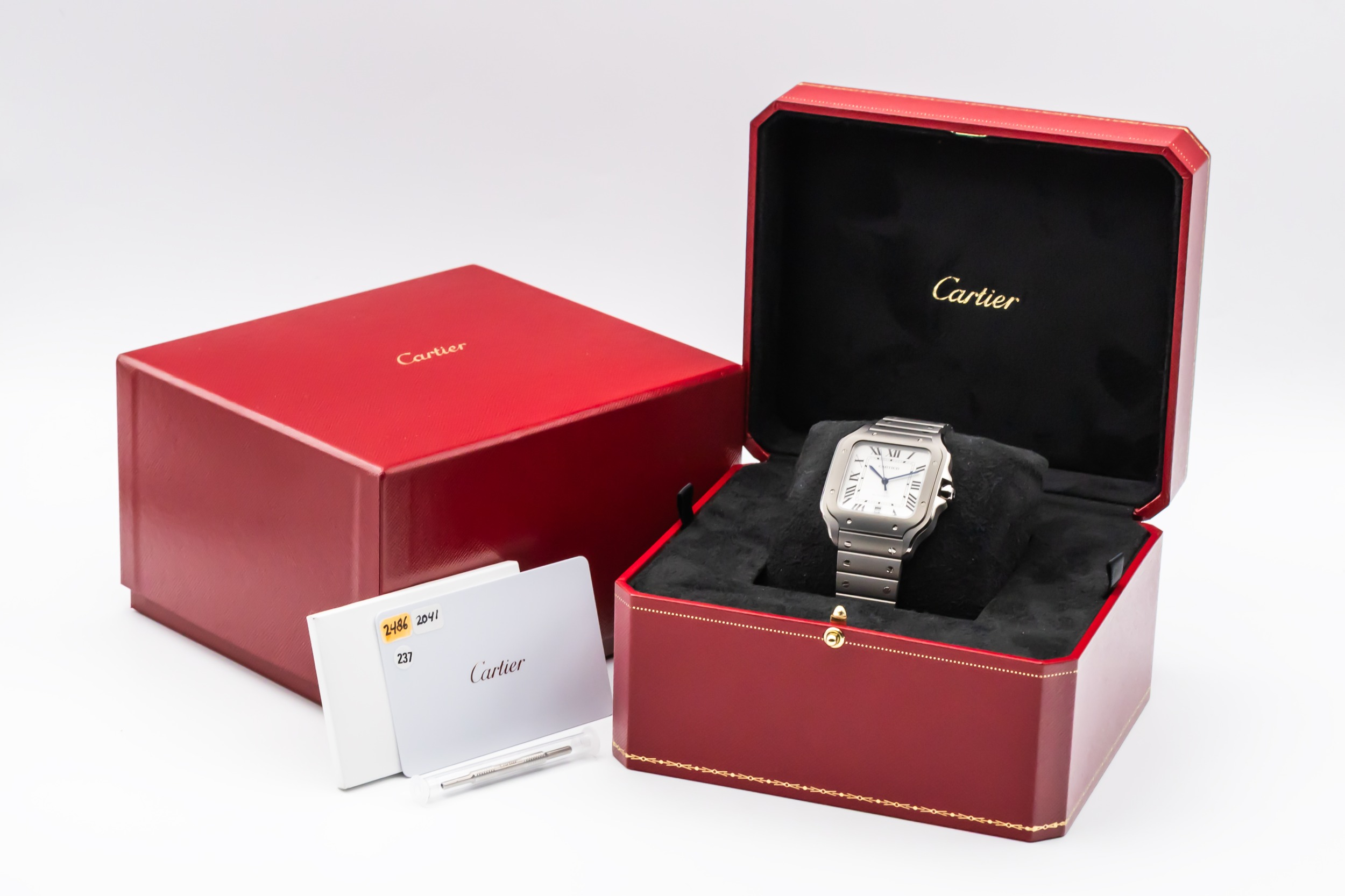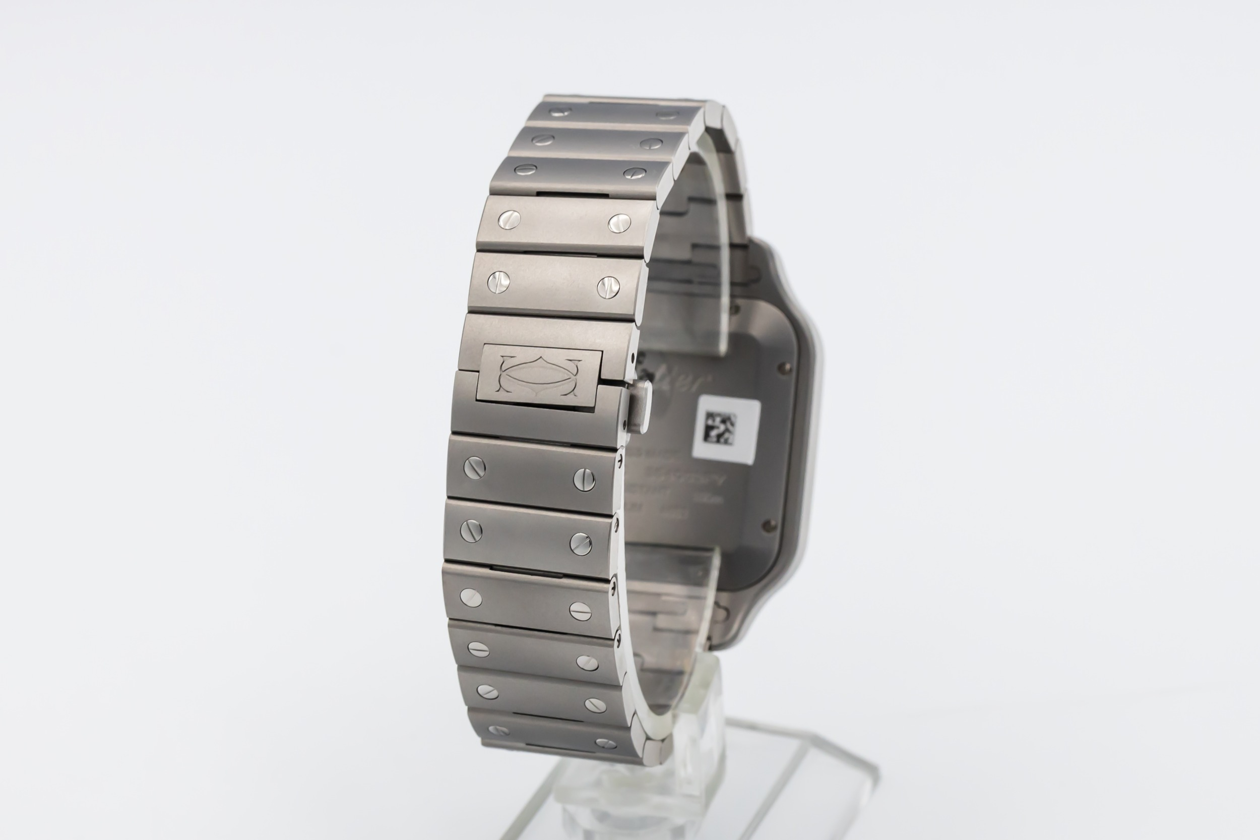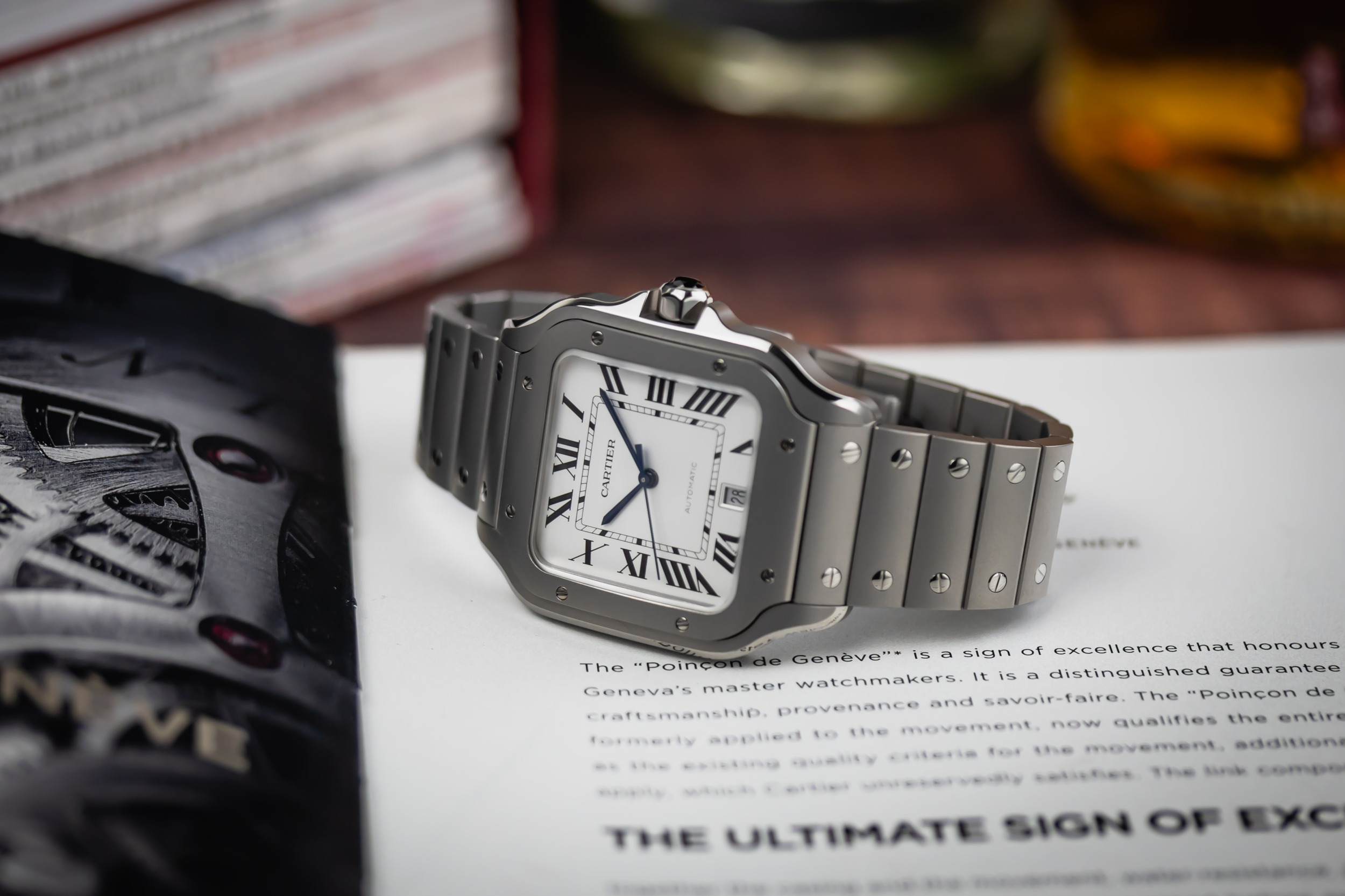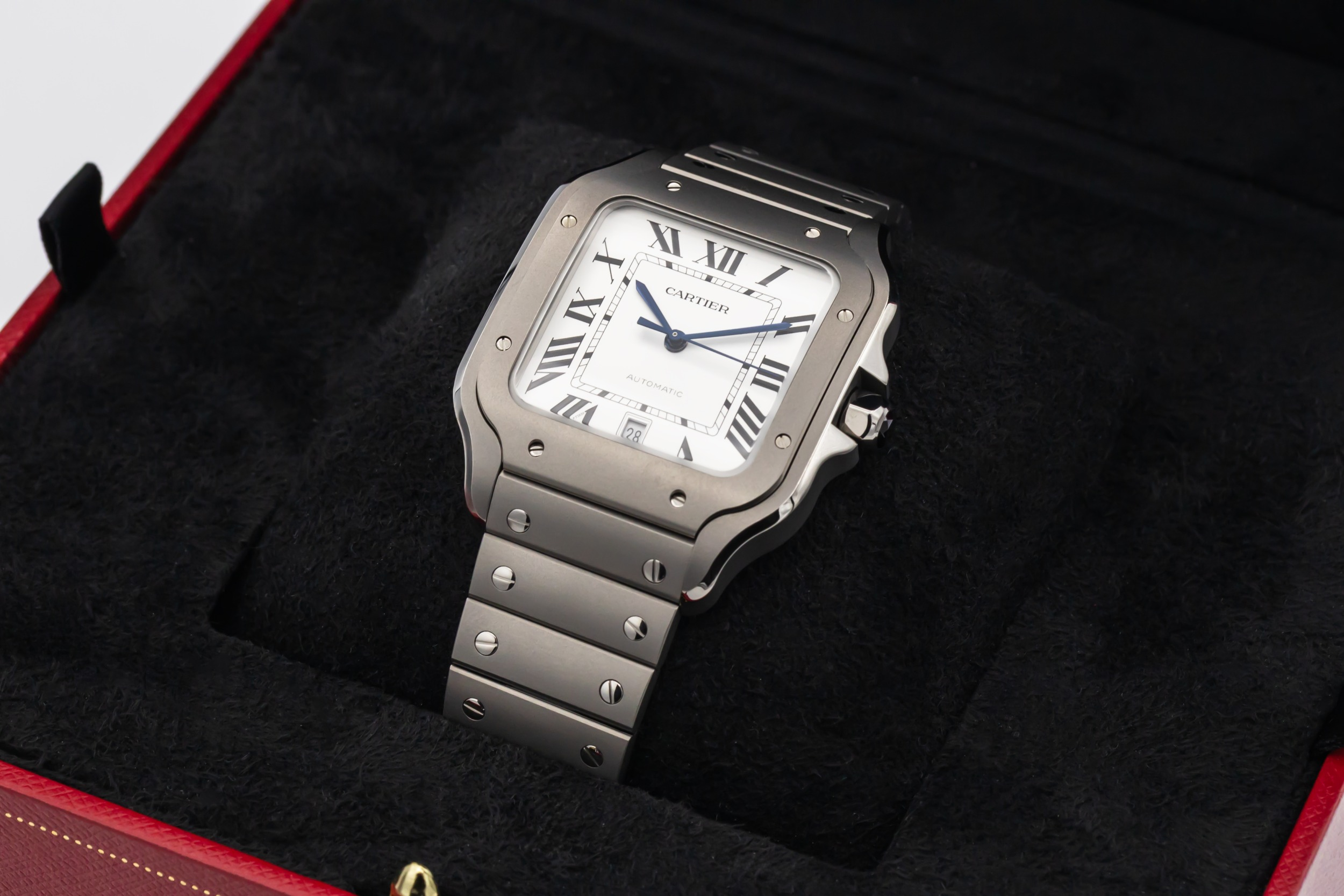This 2025 Cartier Santos de Cartier 39.8mm features a silver opaline dial with bold black Roman numerals, elegant Cartier sword hands, and a date window at 6 o’clock. Fitted on a titanium strap — often presented with Cartier’s QuickSwitch system for easy interchangeability — this Santos strikes the perfect balance between contemporary sportiness and timeless elegance.