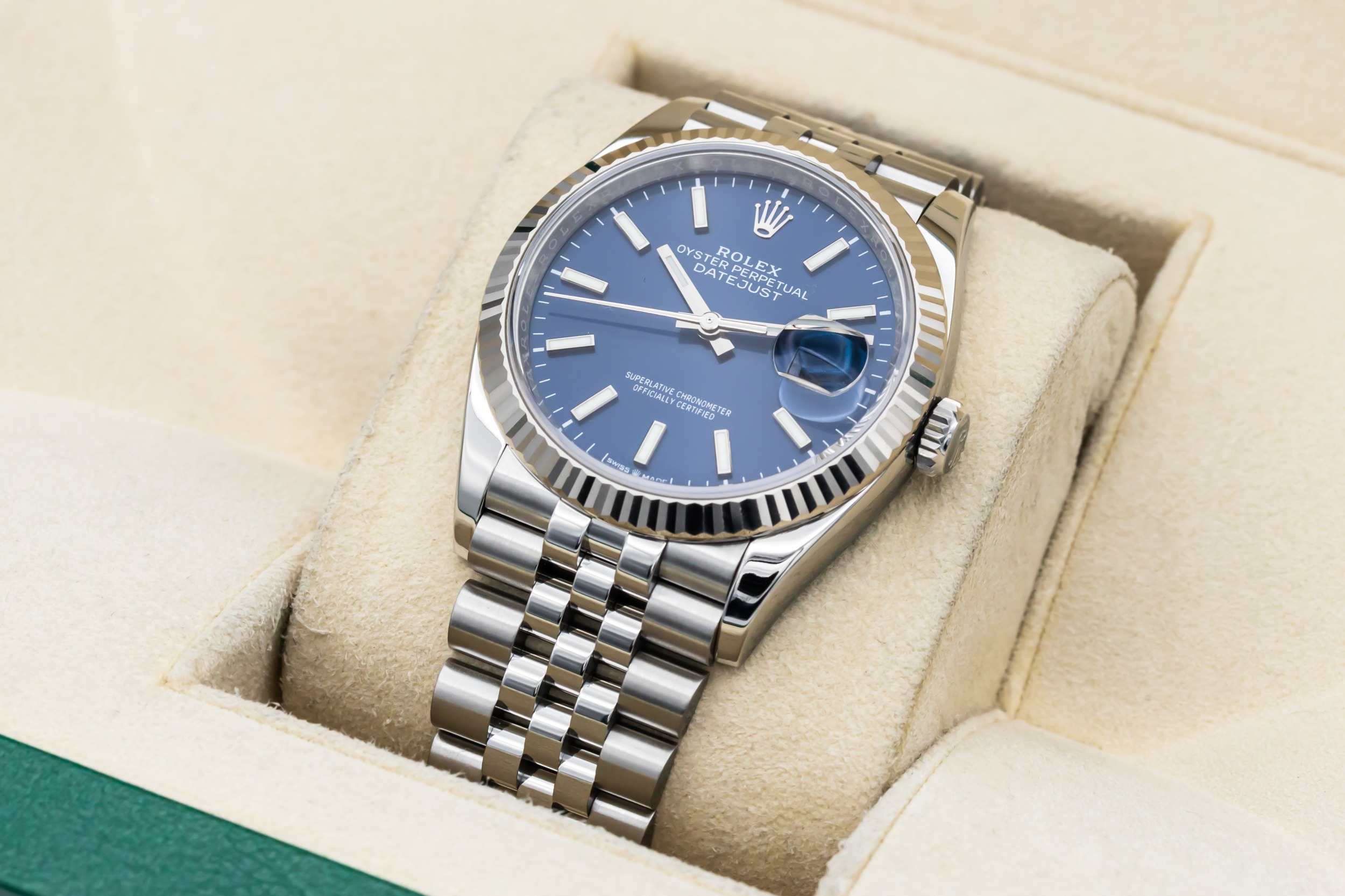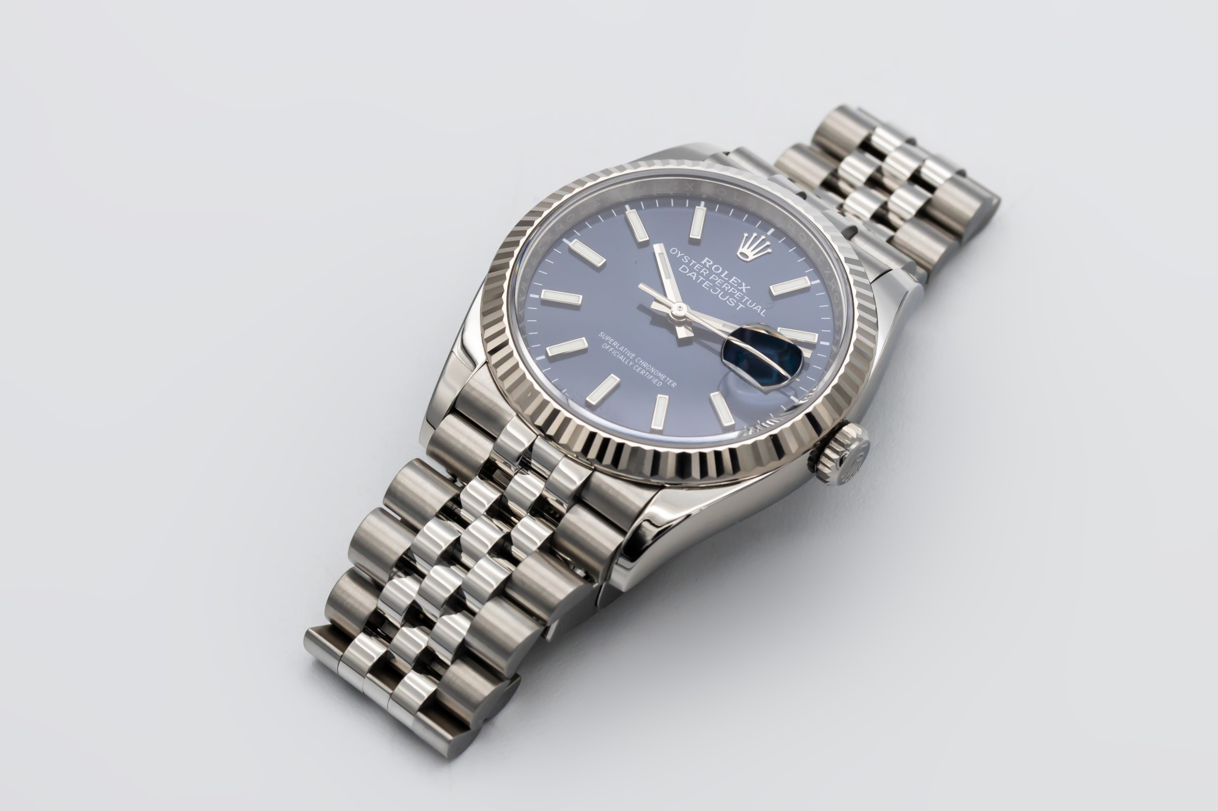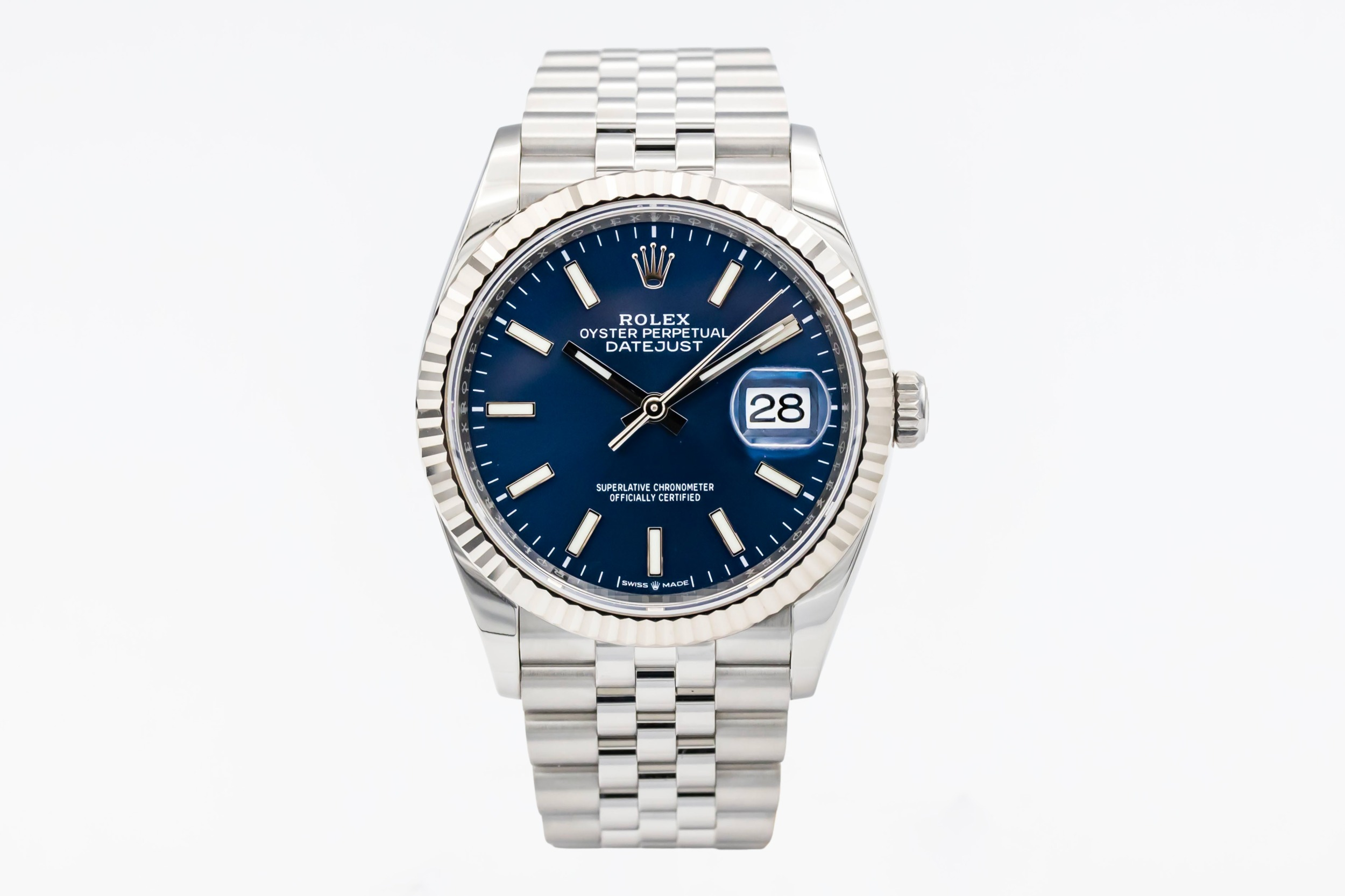 This 2022 Rolex DateJust 36mm features a blue dial that is enhanced with polished baton hour markers, offering a clean, elegant look with excellent legibility. A refined fluted bezel frames the dial with subtle sophistication, while the Jubilee bracelet adds comfort and a dressy, refined profile.