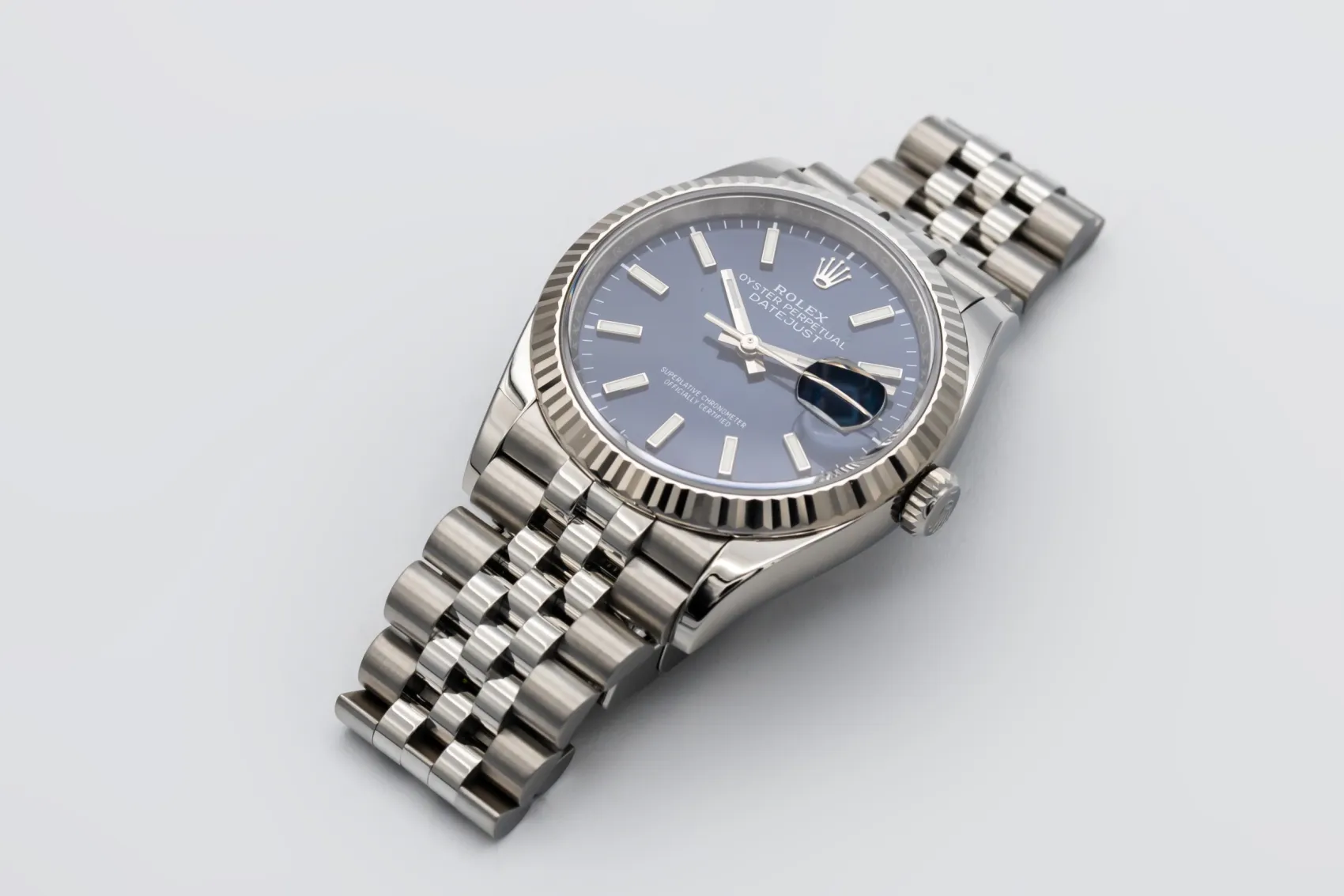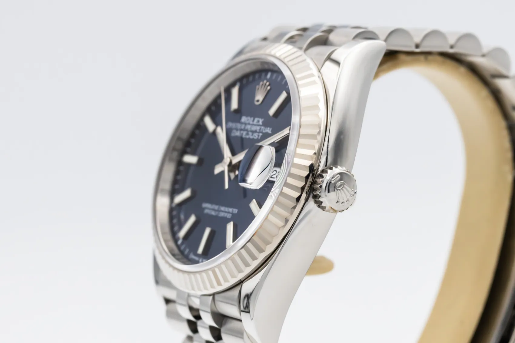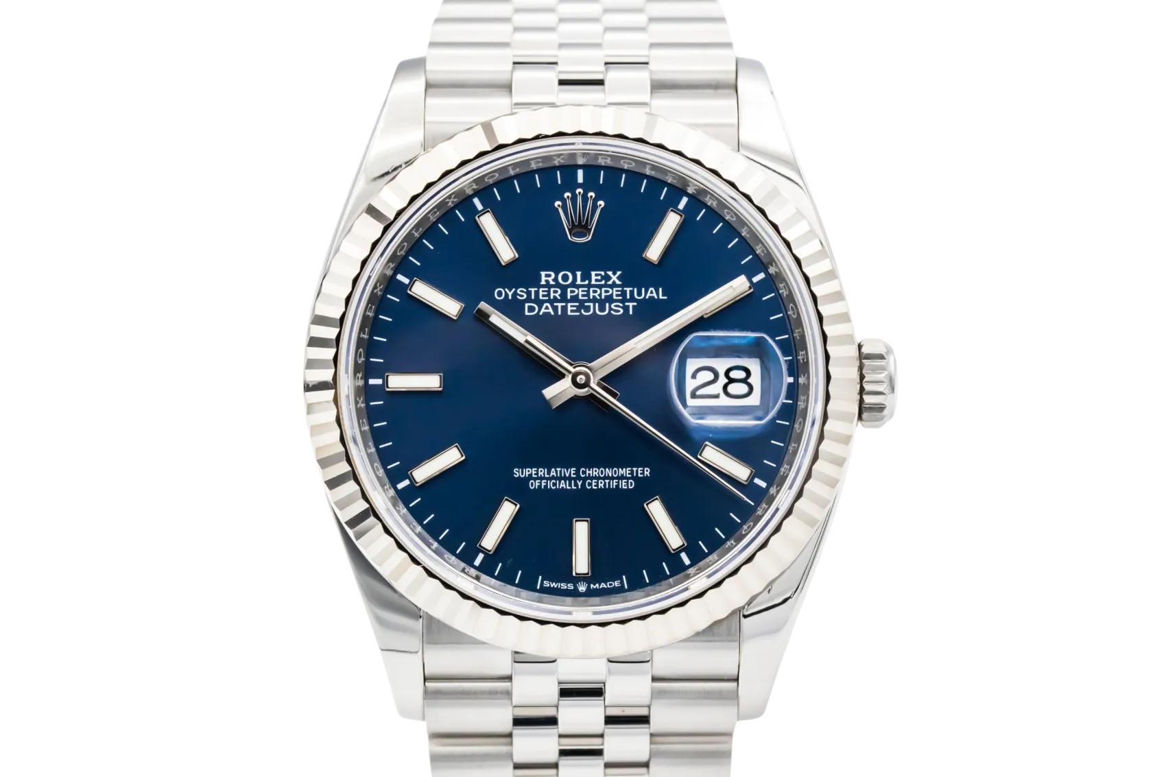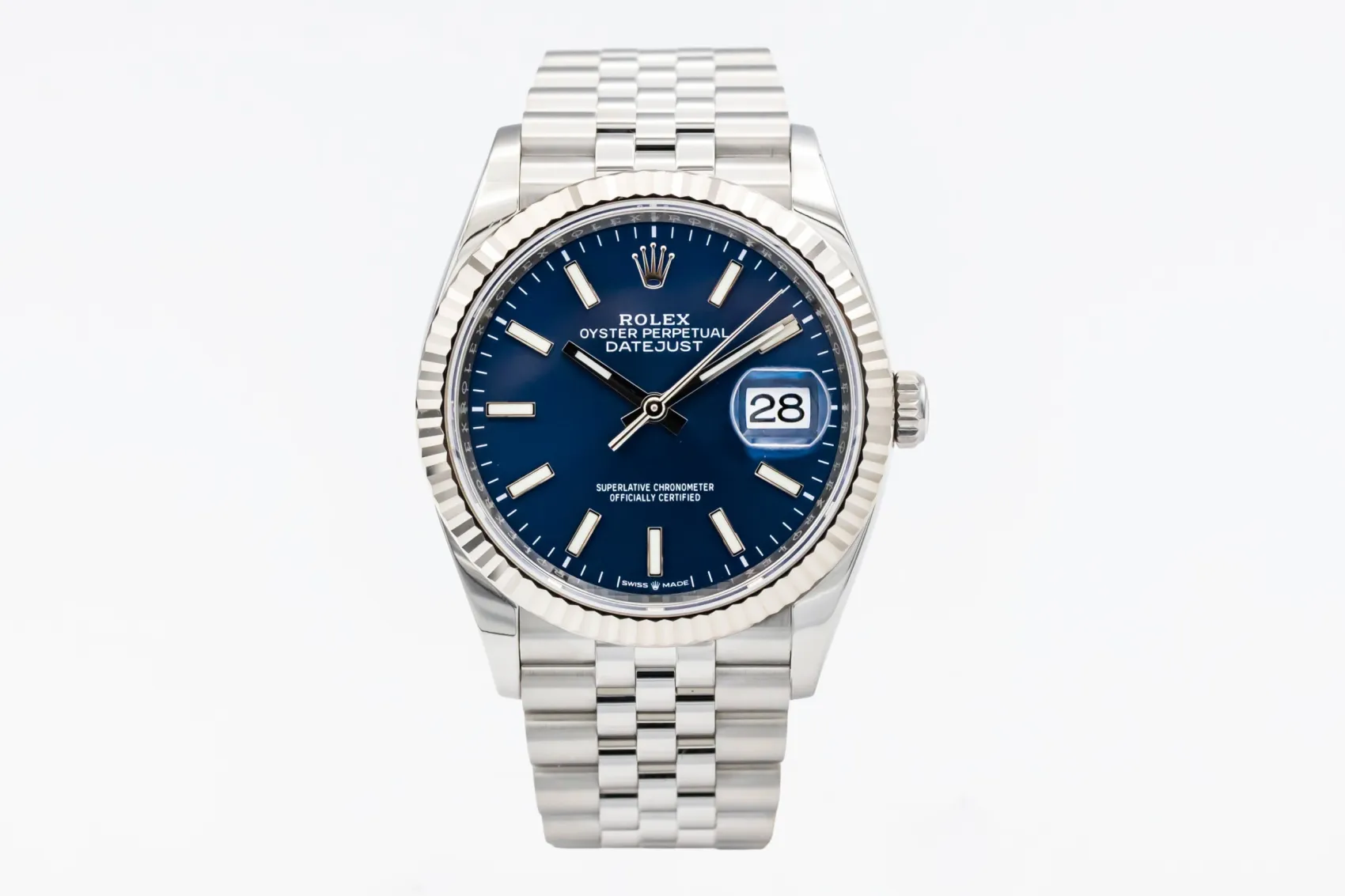 finance this from £200.98 p/m call the shop Read about our Limited Lifetime WarrantyThis 2022 Rolex DateJust 36mm features a blue dial that is enhanced with polished baton hour markers, offering a clean, elegant look with excellent legibility. A refined fluted bezel frames the dial with subtle sophistication, while the Jubilee bracelet adds comfort and a dressy, refined profile.