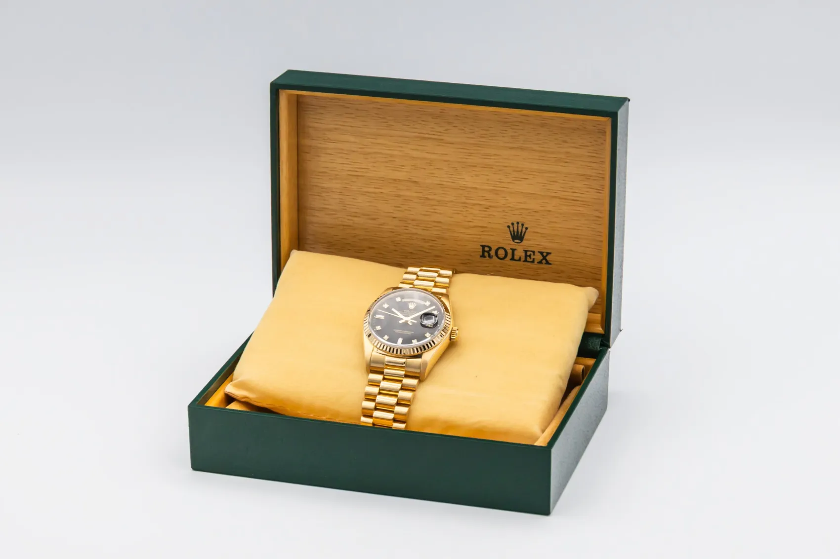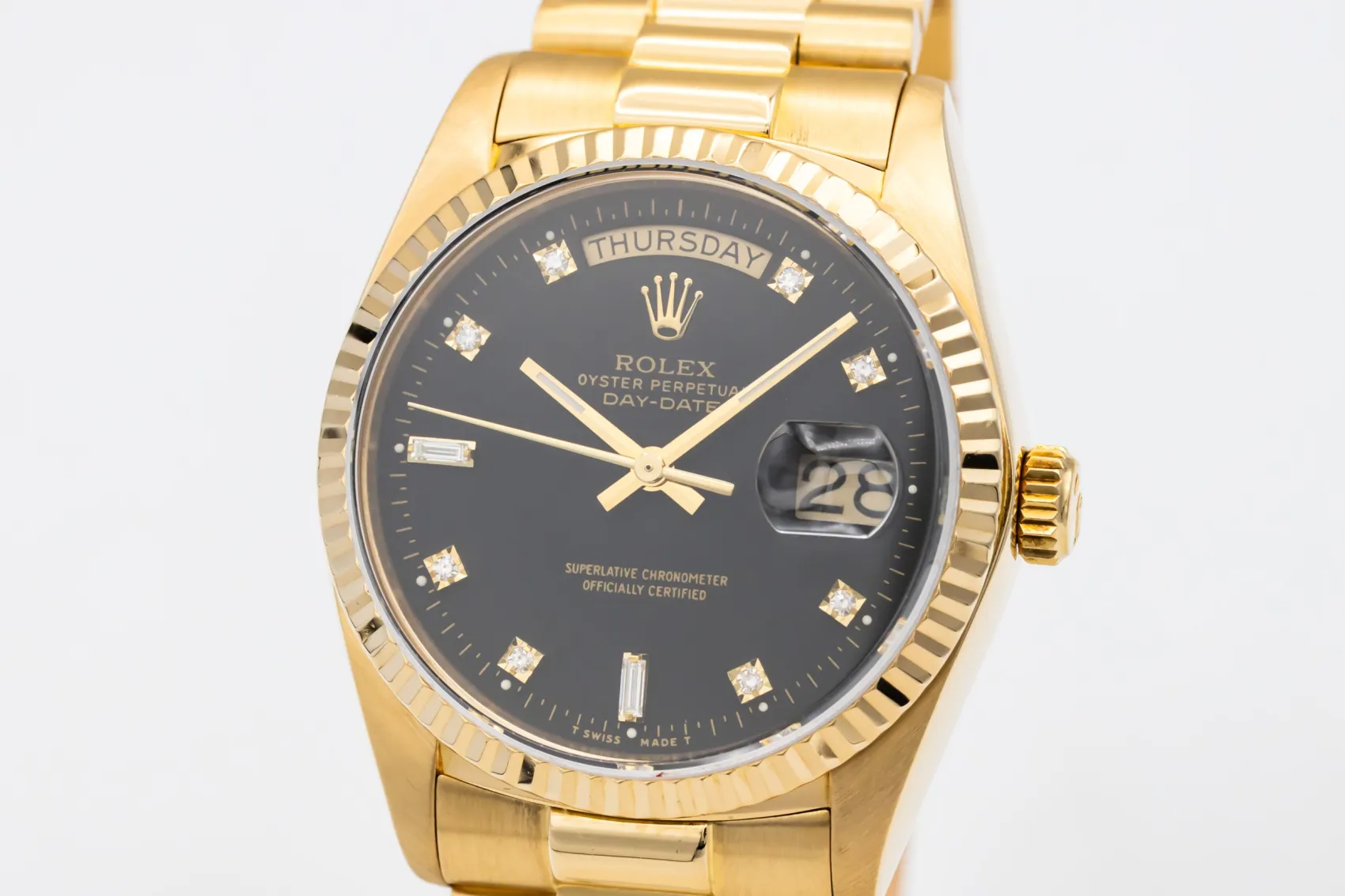 finance this from £301.52 p/m call the shop Read about our Limited Lifetime WarrantyThis 1978 Rolex Day-Date 36mm is an iconic luxury timepiece crafted in solid 18ct yellow gold. The striking black dial is set with factory diamond hour markers, complemented by the signature day display at 12 o’clock and date window at 3 o’clock. Finished with a fluted yellow gold bezel and matching gold bracelet, this Day-Date delivers unmistakable presence and timeless prestige.