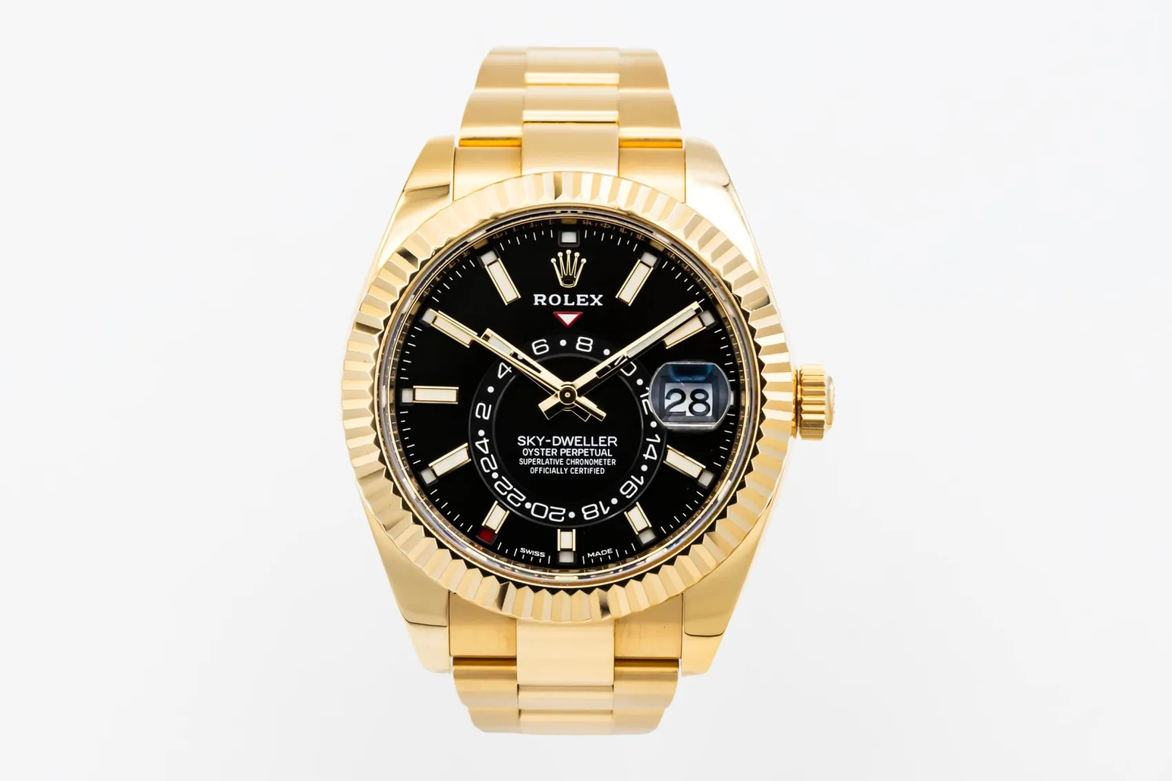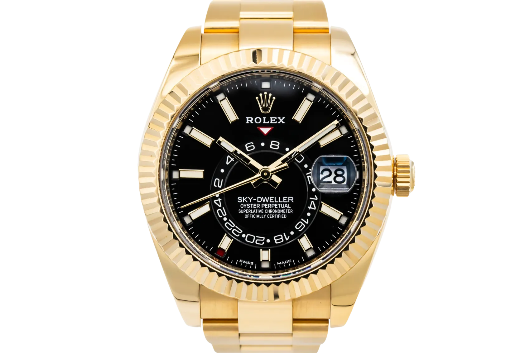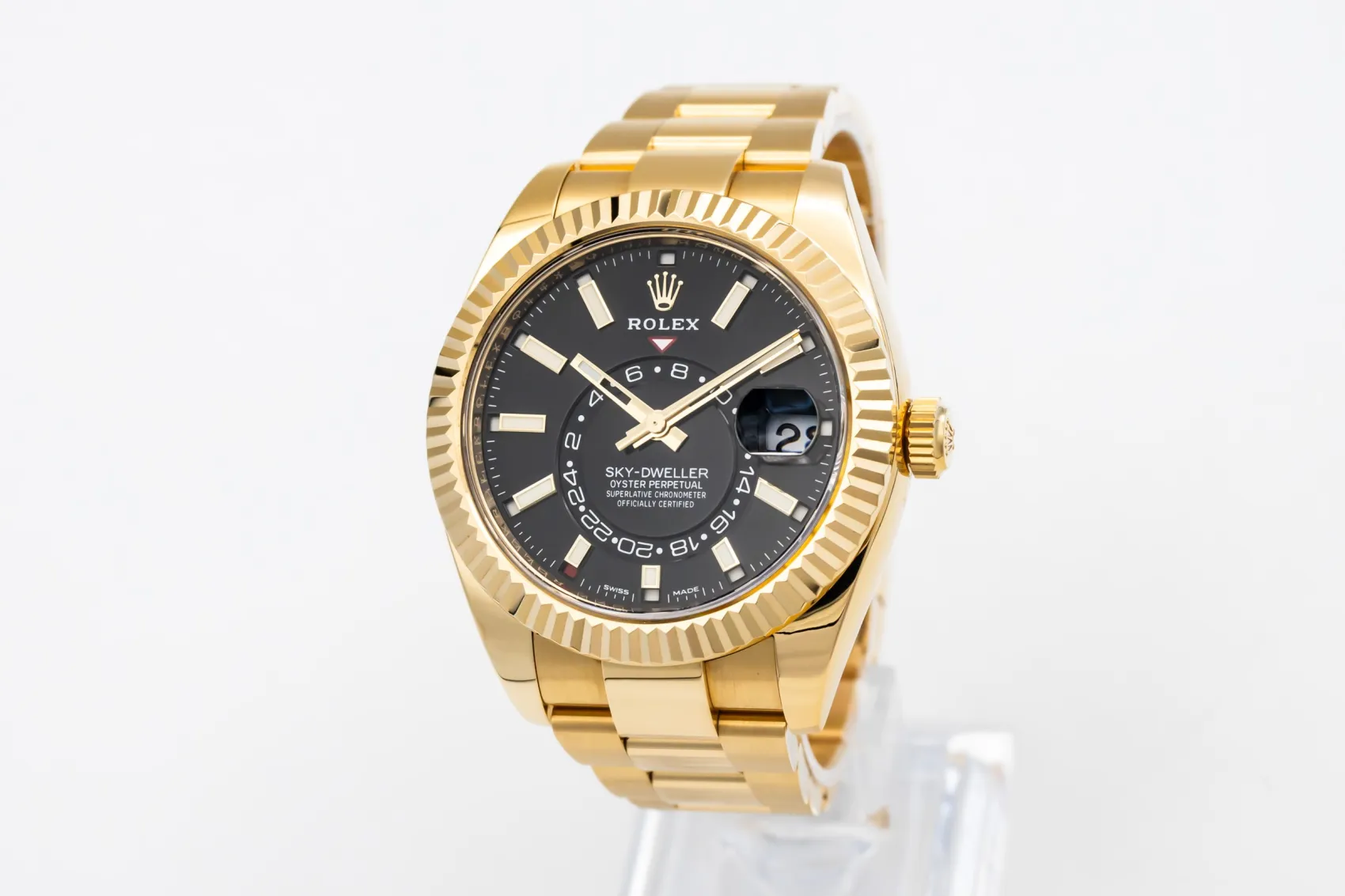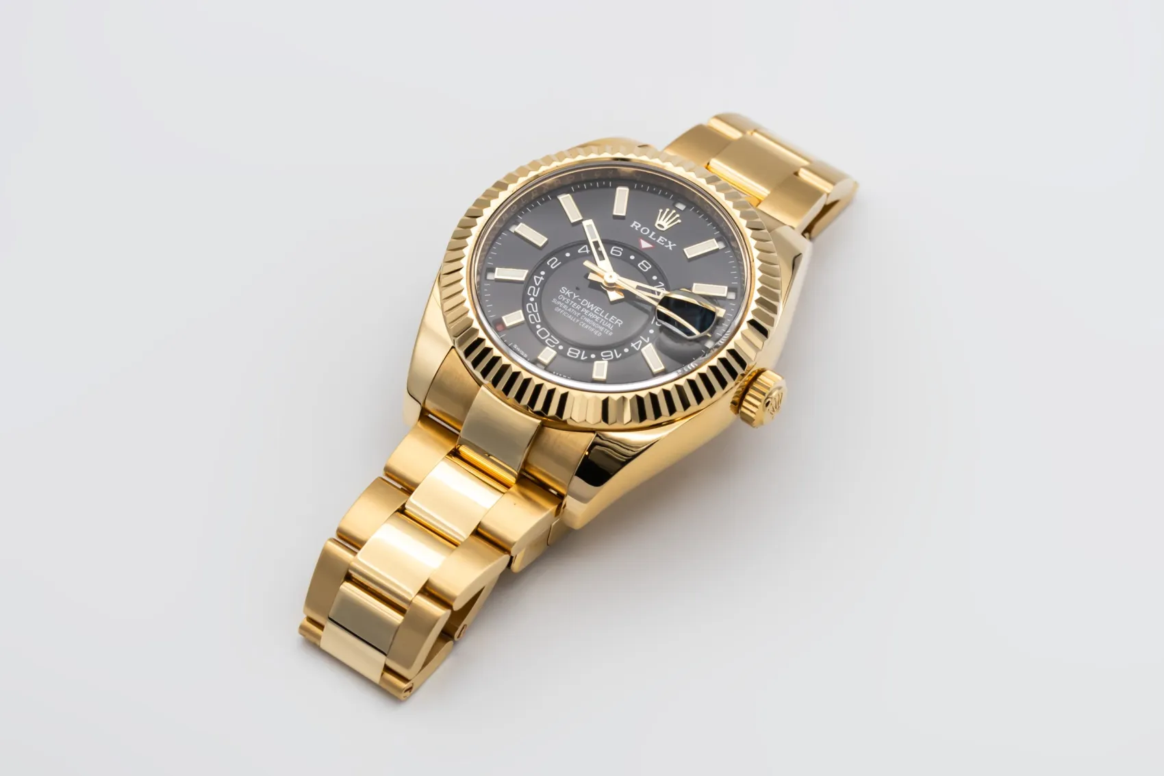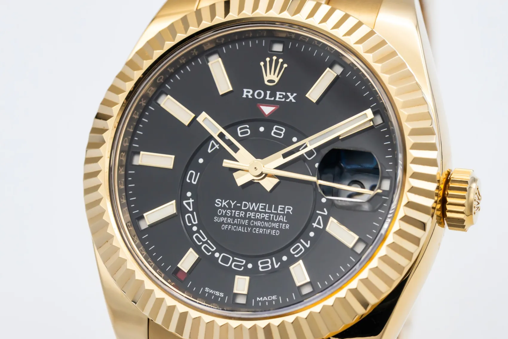 finance this from £442.3 p/m call the shop Read about our Limited Lifetime WarrantyThe 2022 Rolex Sky-Dweller 42mm is a bold and prestigious luxury watch crafted in solid 18ct yellow gold. The watch is fitted with Rolex’s signature fluted Ring Command bezel in yellow gold, seamlessly blending form and function. Its black dial is clean, balanced, and highly legible, showcasing applied baton hour markers alongside the distinctive off-centre 24-hour disc for dual time-zone display. Completed on a full 18ct yellow gold Oyster bracelet.