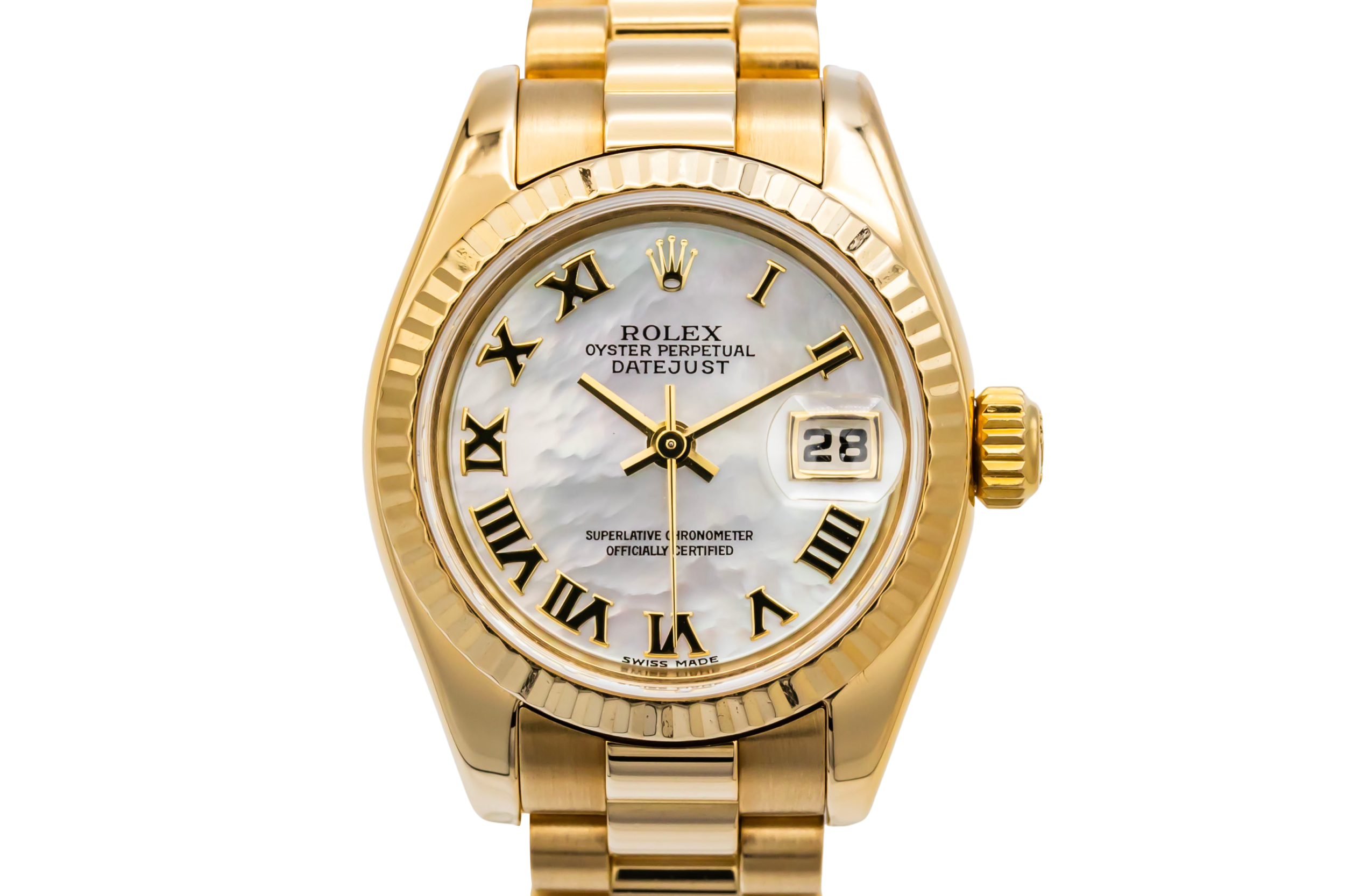 This 2001 Rolex Lady DateJust 26mm is a refined and elegant luxury timepiece crafted in solid 18ct yellow gold. The luminous mother-of-pearl dial is beautifully accented with classic Roman numeral hour markers, creating a timeless and feminine aesthetic. Finished with a fluted yellow gold bezel and the prestigious 18ct yellow gold President bracelet, this Lady DateJust offers understated sophistication with unmistakable Rolex prestige.