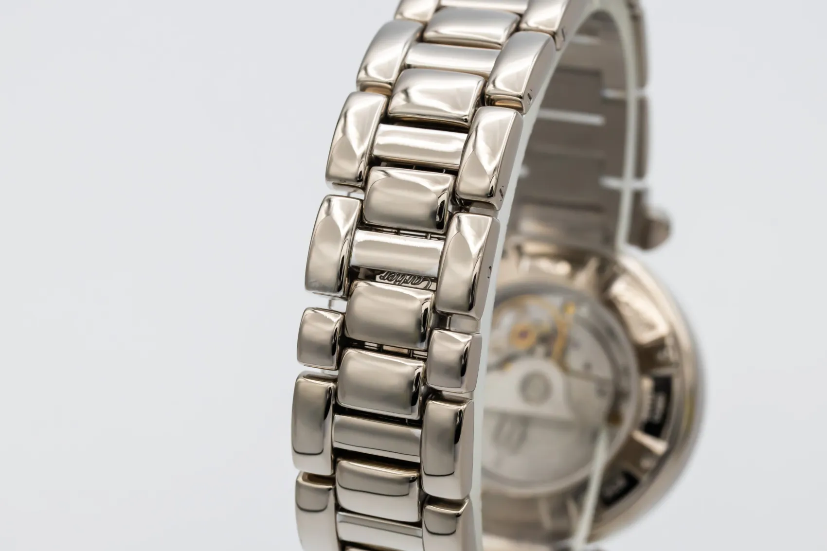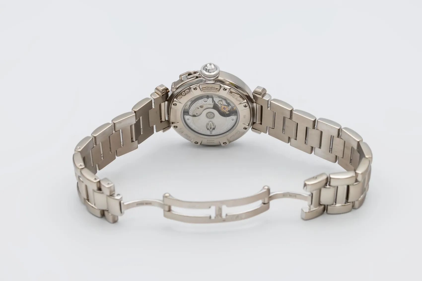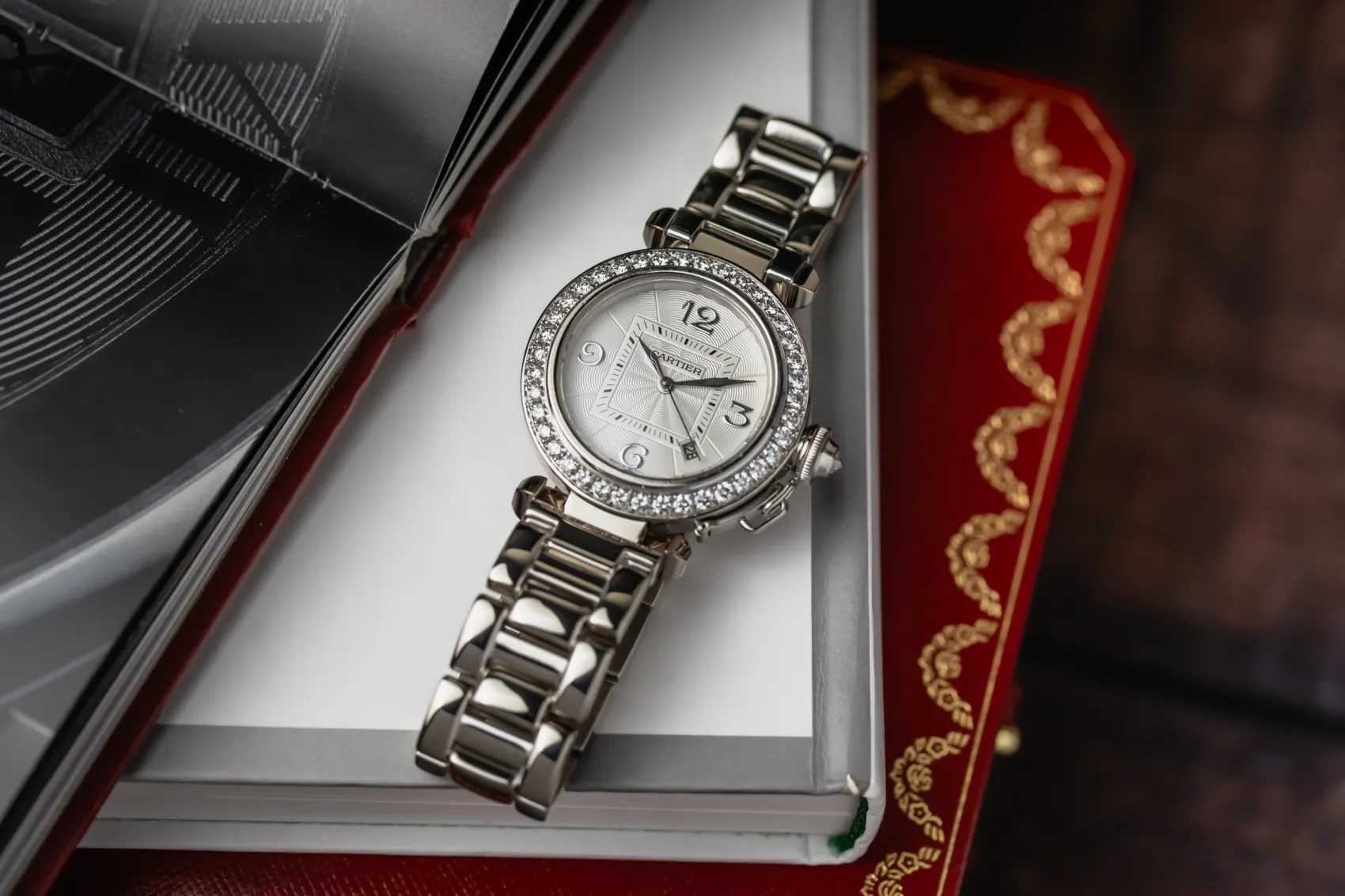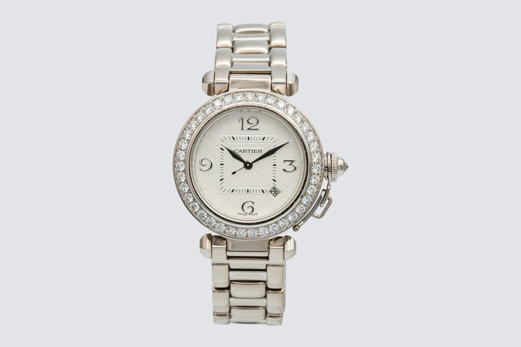 The Pasha 32mm was later introduced as a refined interpretation, retaining the hallmark crown guard, round case, and Arabic numerals, while offering a more elegant size suited to collectors seeking timeless luxury with unmistakable Cartier identity.