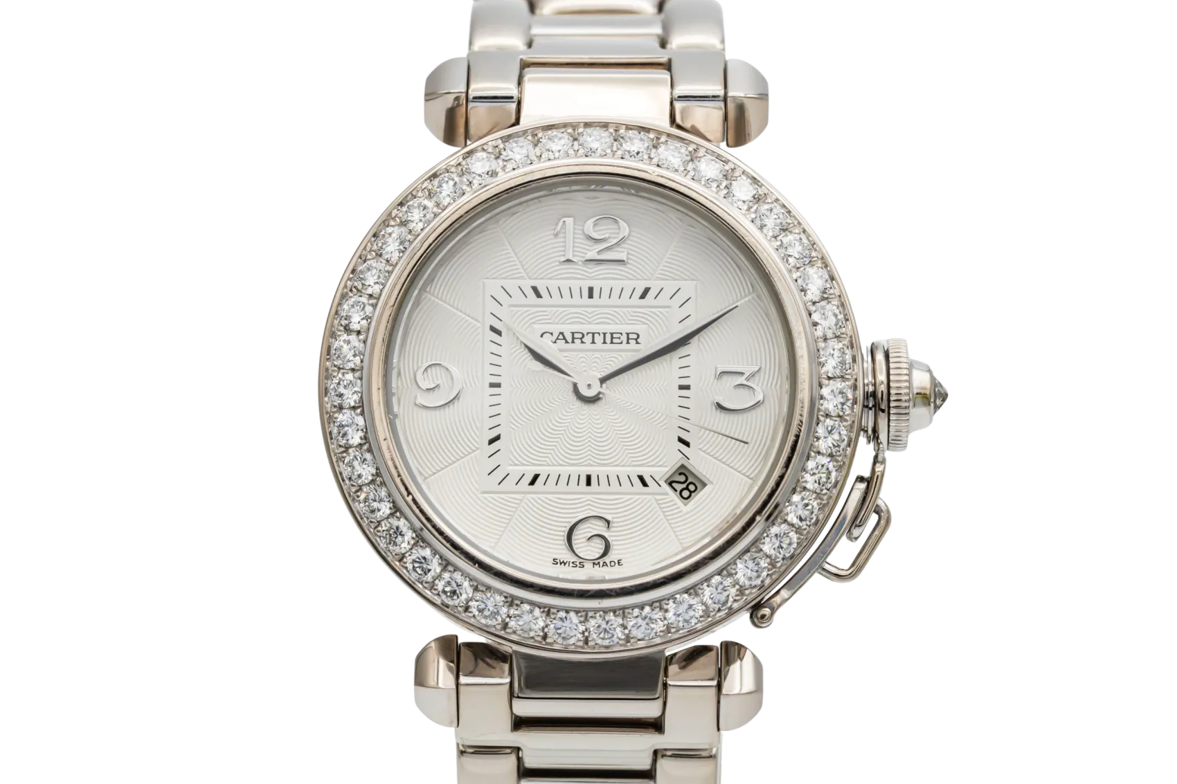 finance this from £341.73 p/m call the shop Read about our Limited Lifetime WarrantyThis Cartier Pasha 32mm features a silver guilloché dial that is beautifully detailed, showcasing applied Arabic numerals at 12, 3, 6, and 9, blued steel hands, and a discreet date window positioned at 4:30. Completed with the signature screw-down crown cap secured by a delicate chain and fitted to an 18ct white gold bracelet, this Pasha balances jewellery-level luxury with classic watchmaking heritage.