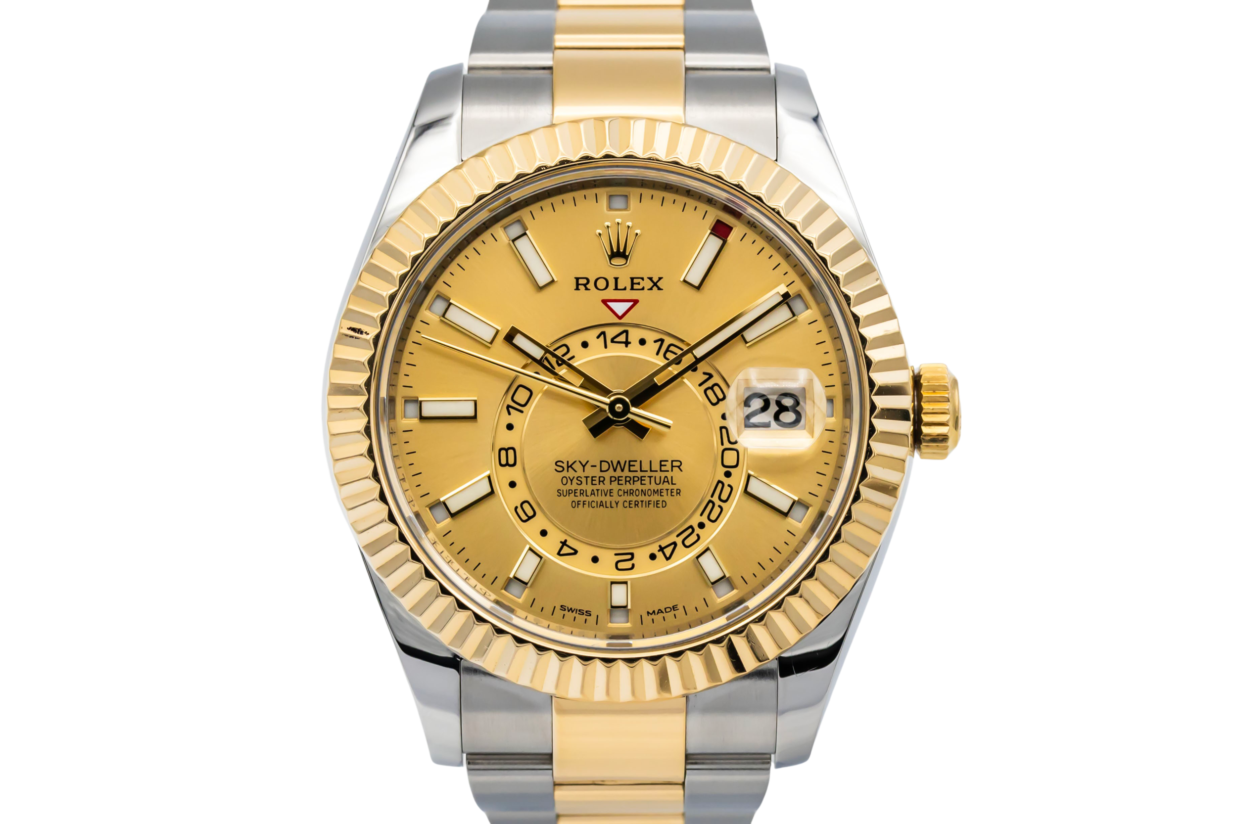 This circa 2020 Rolex Sky-Dweller 42mm is a striking luxury timepiece crafted in stainless steel and 18ct yellow gold. The champagne dial is clean and highly legible, featuring applied baton hour markers, the distinctive off-centre 24-hour disc, and the innovative annual calendar display. Finished with a fluted yellow gold Ring Command bezel and a steel and yellow gold Oyster bracelet.