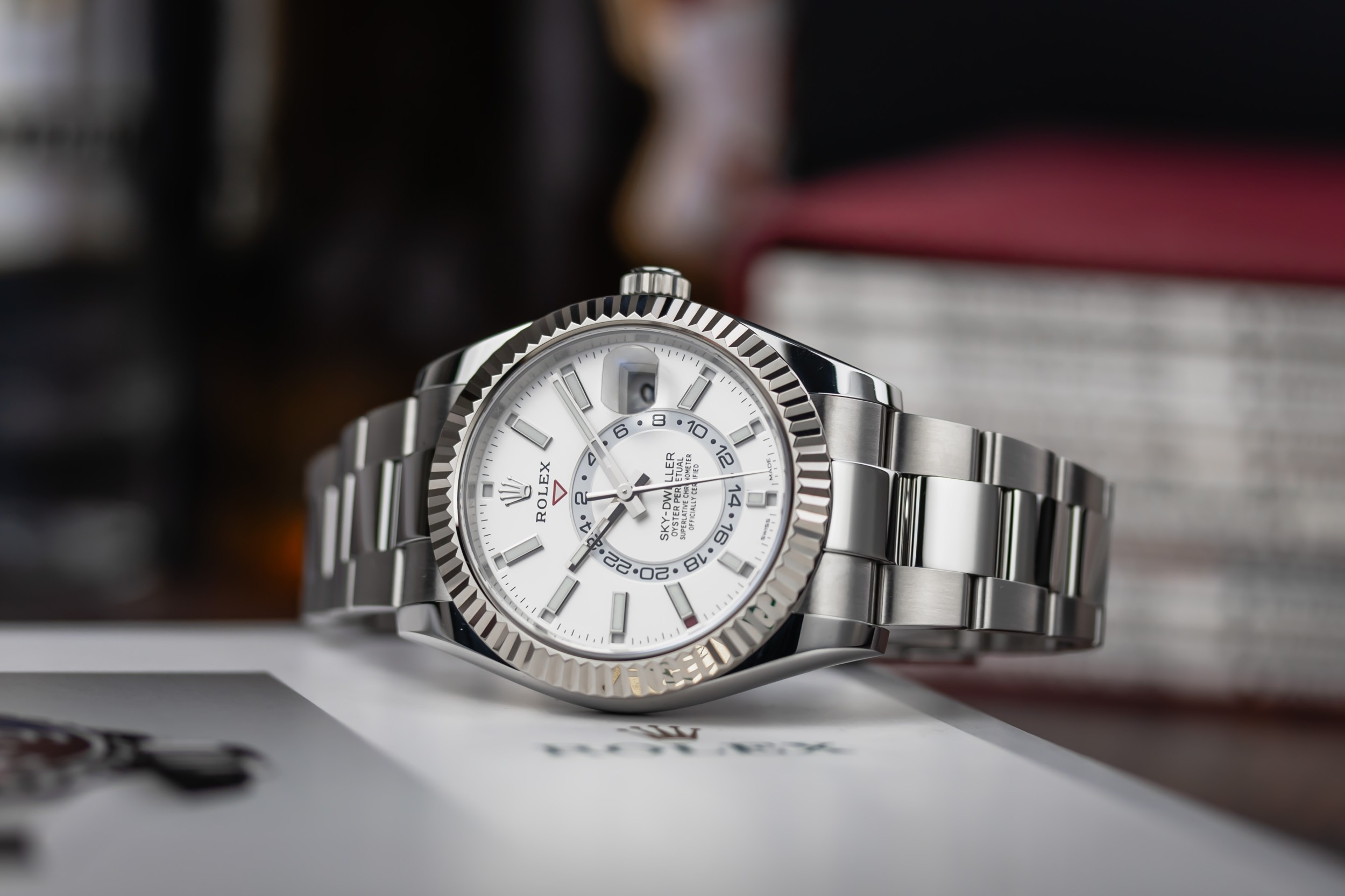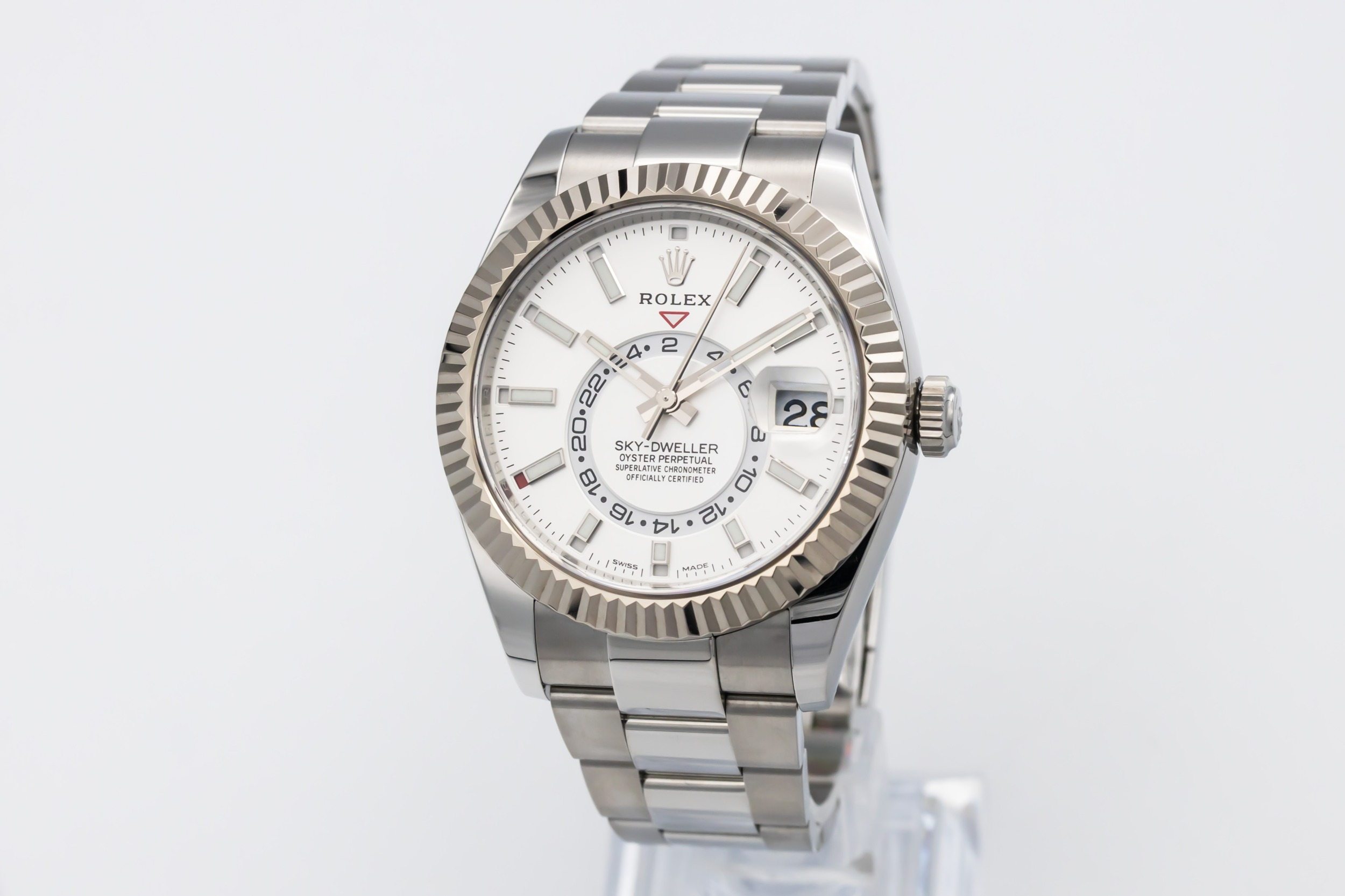 The 2022 Rolex Sky-Dweller 42mm is a commanding luxury timepiece crafted from stainless steel, featuring a bold 42mm Oyster case. The white dial is clean and highly legible, displaying applied baton hour markers alongside Rolex’s signature off-centre 24-hour disc for dual time tracking. Completed with a stainless steel Oyster bracelet and secure Oysterclasp, this Sky-Dweller perfectly balances contemporary design with classic Rolex sports-luxury appeal.