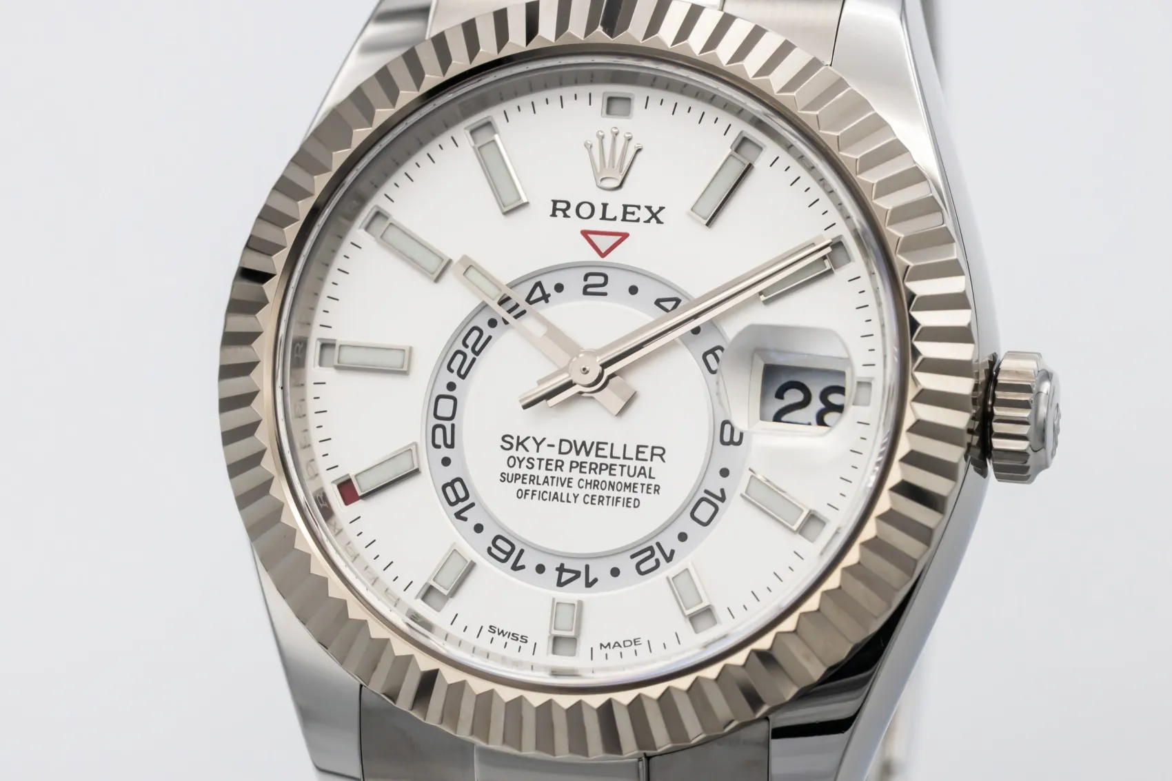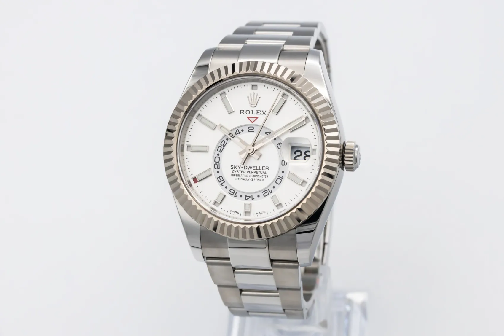 finance this from £271.35 p/m call the shop Read about our Limited Lifetime WarrantyThe 2022 Rolex Sky-Dweller 42mm is a commanding luxury timepiece crafted from stainless steel, featuring a bold 42mm Oyster case. The white dial is clean and highly legible, displaying applied baton hour markers alongside Rolex’s signature off-centre 24-hour disc for dual time tracking. Completed with a stainless steel Oyster bracelet and secure Oysterclasp, this Sky-Dweller perfectly balances contemporary design with classic Rolex sports-luxury appeal.