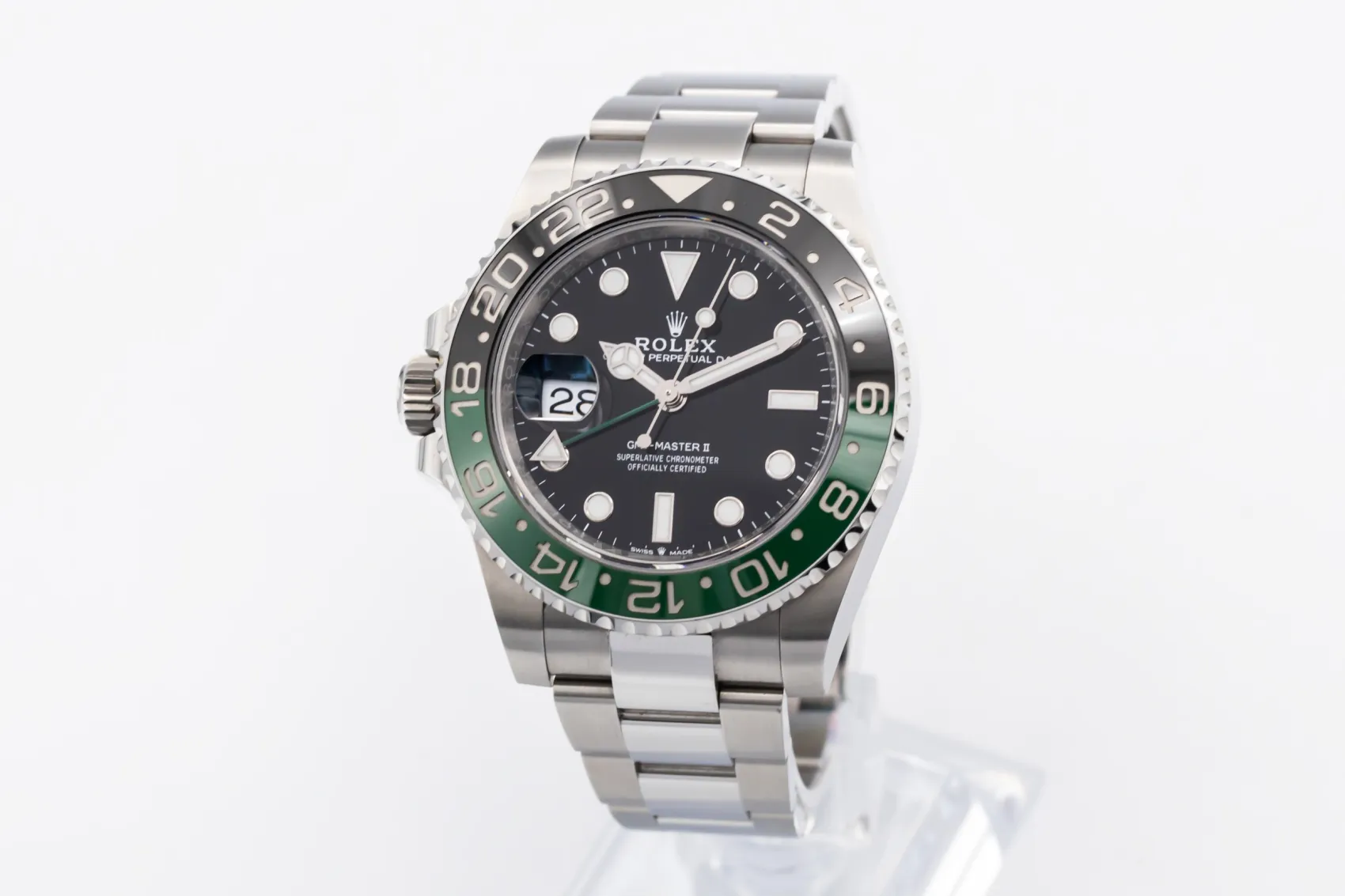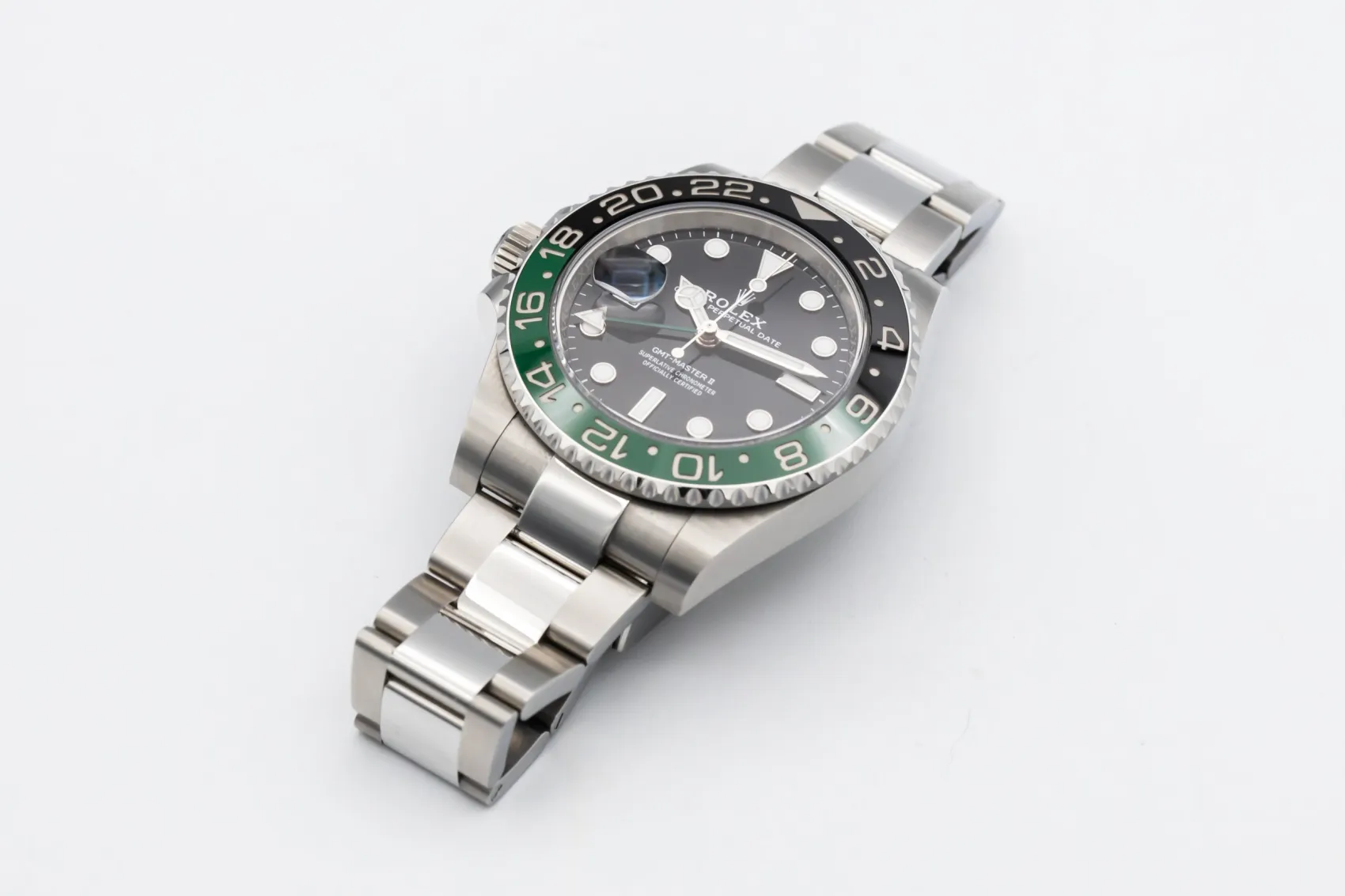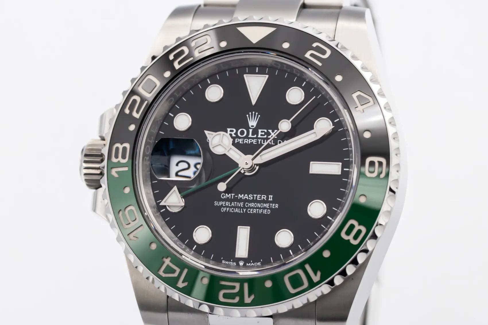 finance this from £260.4 p/m call the shop Read about our Limited Lifetime WarrantyThe 2025 Rolex GMT-Master II 40mm ‘Sprite’ is a bold and contemporary luxury sports watch featuring a robust 40mm Oyster case. The watch is distinguished by its striking green and black Cerachrom bezel, adding a modern edge to the iconic GMT design. Its black dial is fitted with luminous applied hour markers and Mercedes-style hands, ensuring excellent legibility in all conditions. Completed on a stainless steel Oyster bracelet.