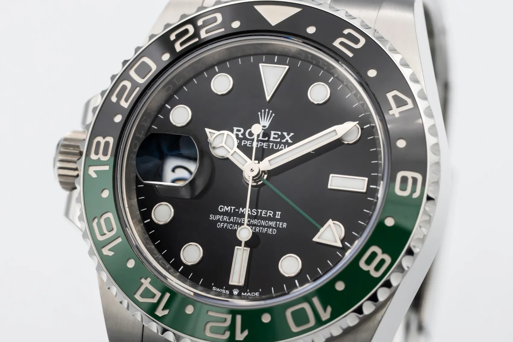 finance this from £202.53 p/m call the shop Read about our Limited Lifetime WarrantyThe 2025 Rolex GMT-Master II 40mm ‘Sprite’ is a bold and contemporary luxury sports watch featuring a robust 40mm Oyster case. The watch is distinguished by its striking green and black Cerachrom bezel, adding a modern edge to the iconic GMT design. Its black dial is fitted with luminous applied hour markers and Mercedes-style hands, ensuring excellent legibility in all conditions. Completed on a stainless steel Oyster bracelet.