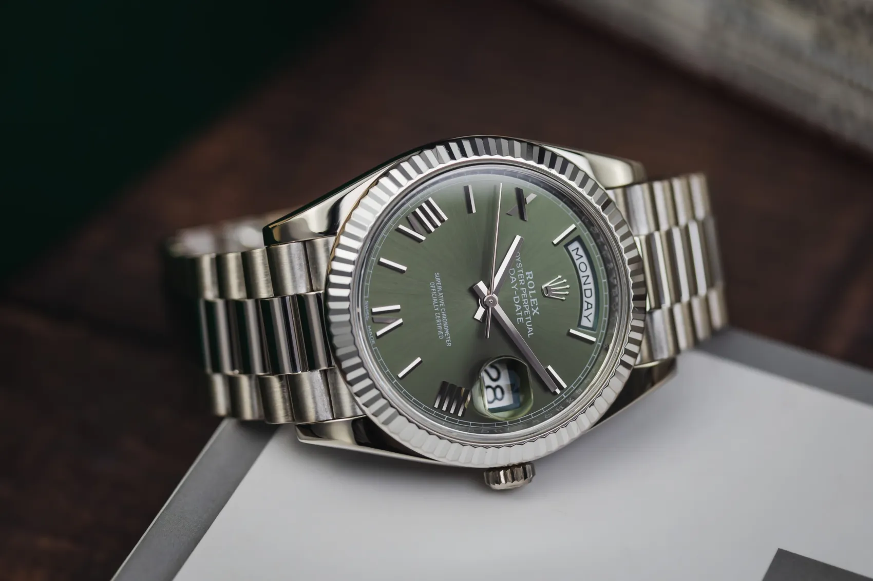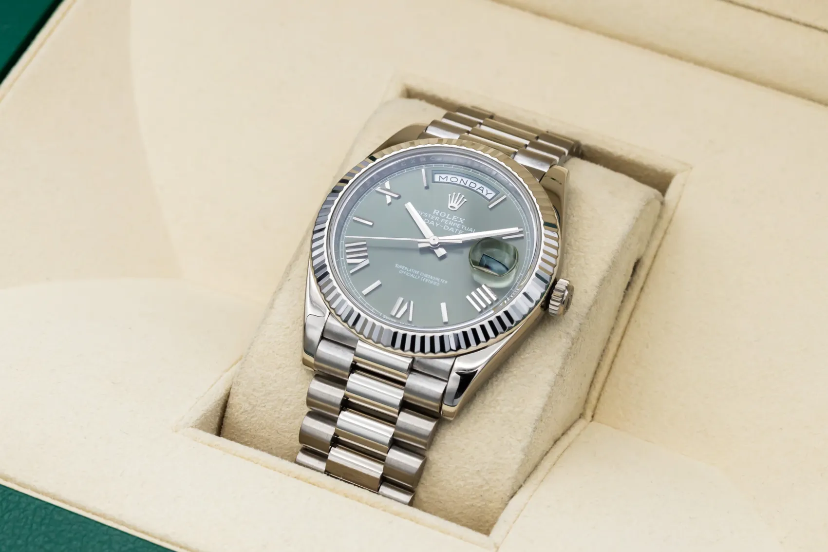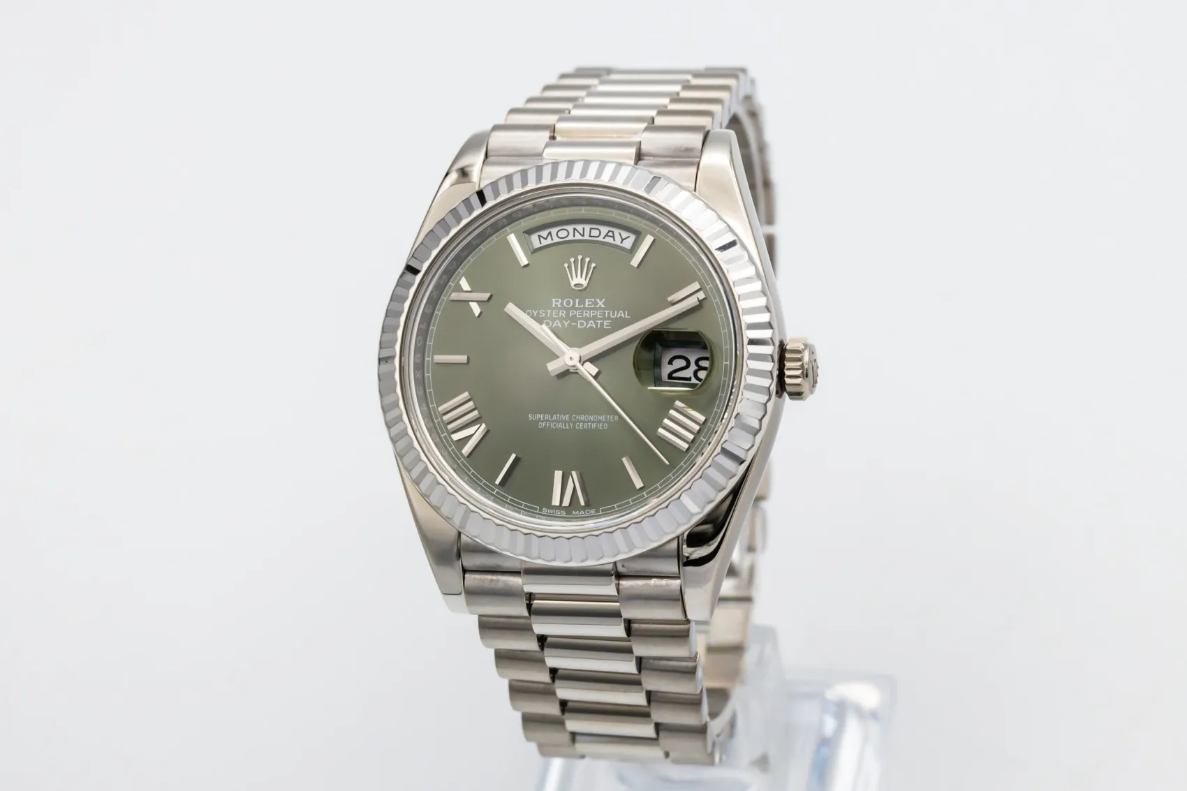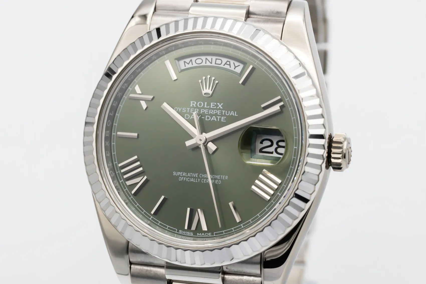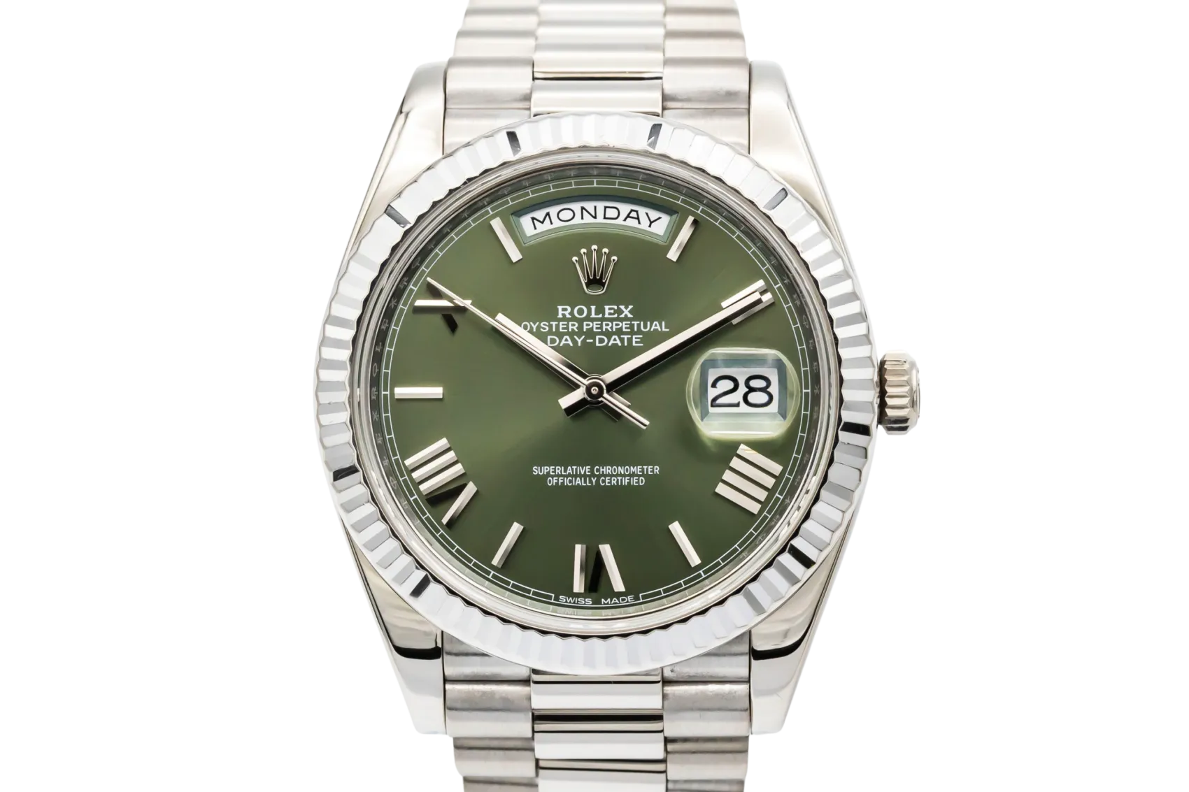 finance this from £428.97 p/m call the shop Read about our Limited Lifetime WarrantyThis 2017 Rolex Day-Date 40mm is a commanding luxury timepiece crafted in solid 18ct white gold. The iconic olive green dial is complemented by elegant Roman numeral hour markers, creating one of the most sought-after Day-Date configurations. Finished with a fluted white gold bezel and the prestigious President bracelet, this watch delivers unmistakable presence with refined sophistication.