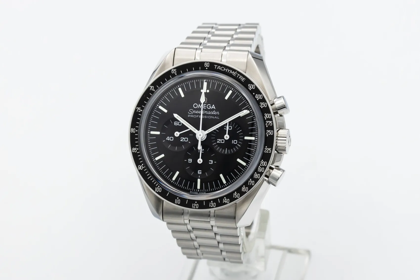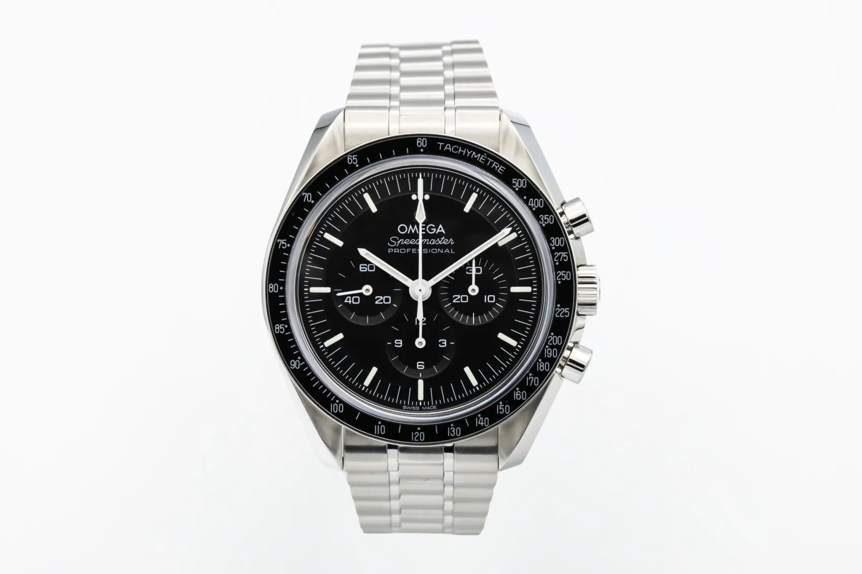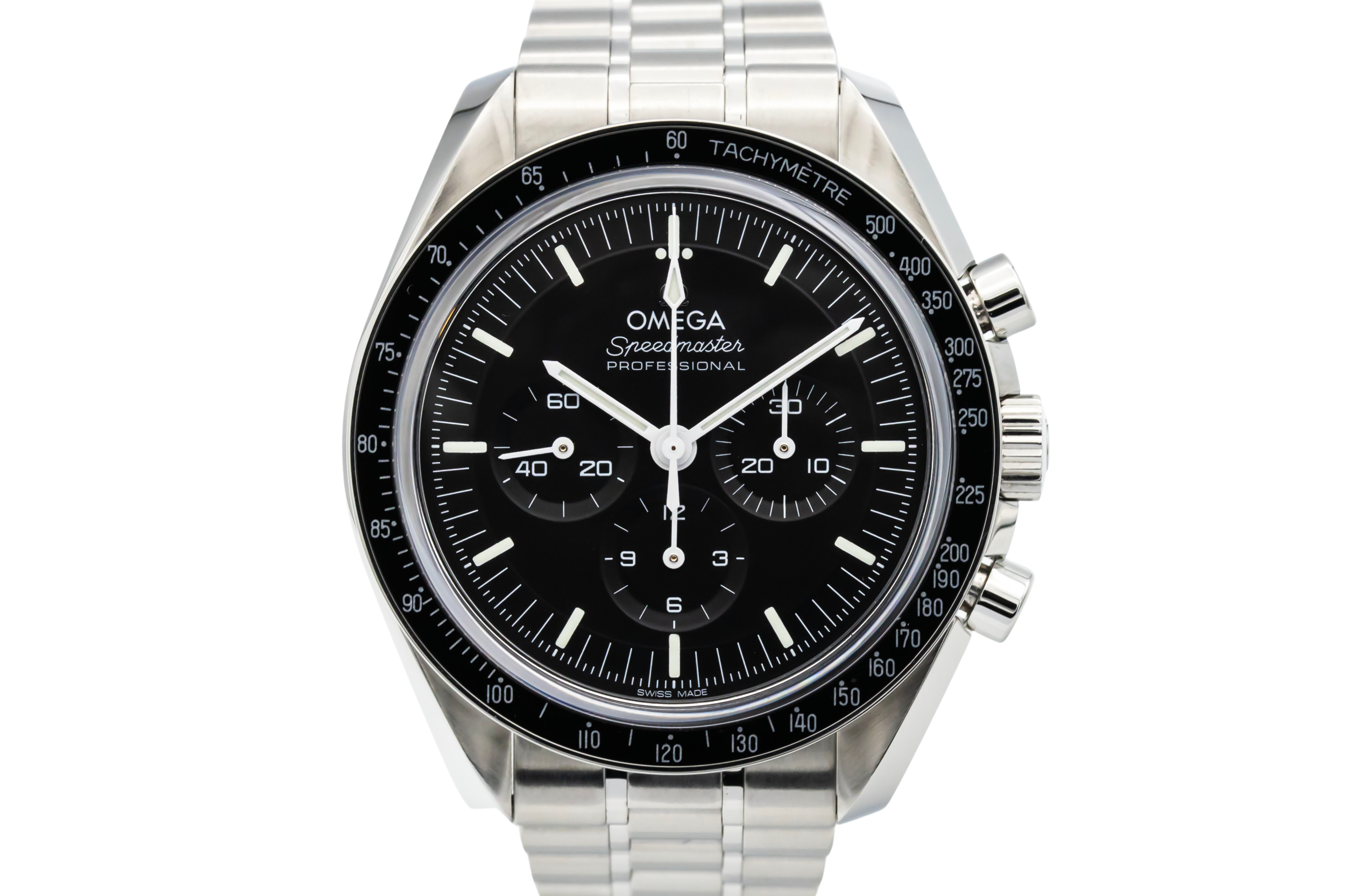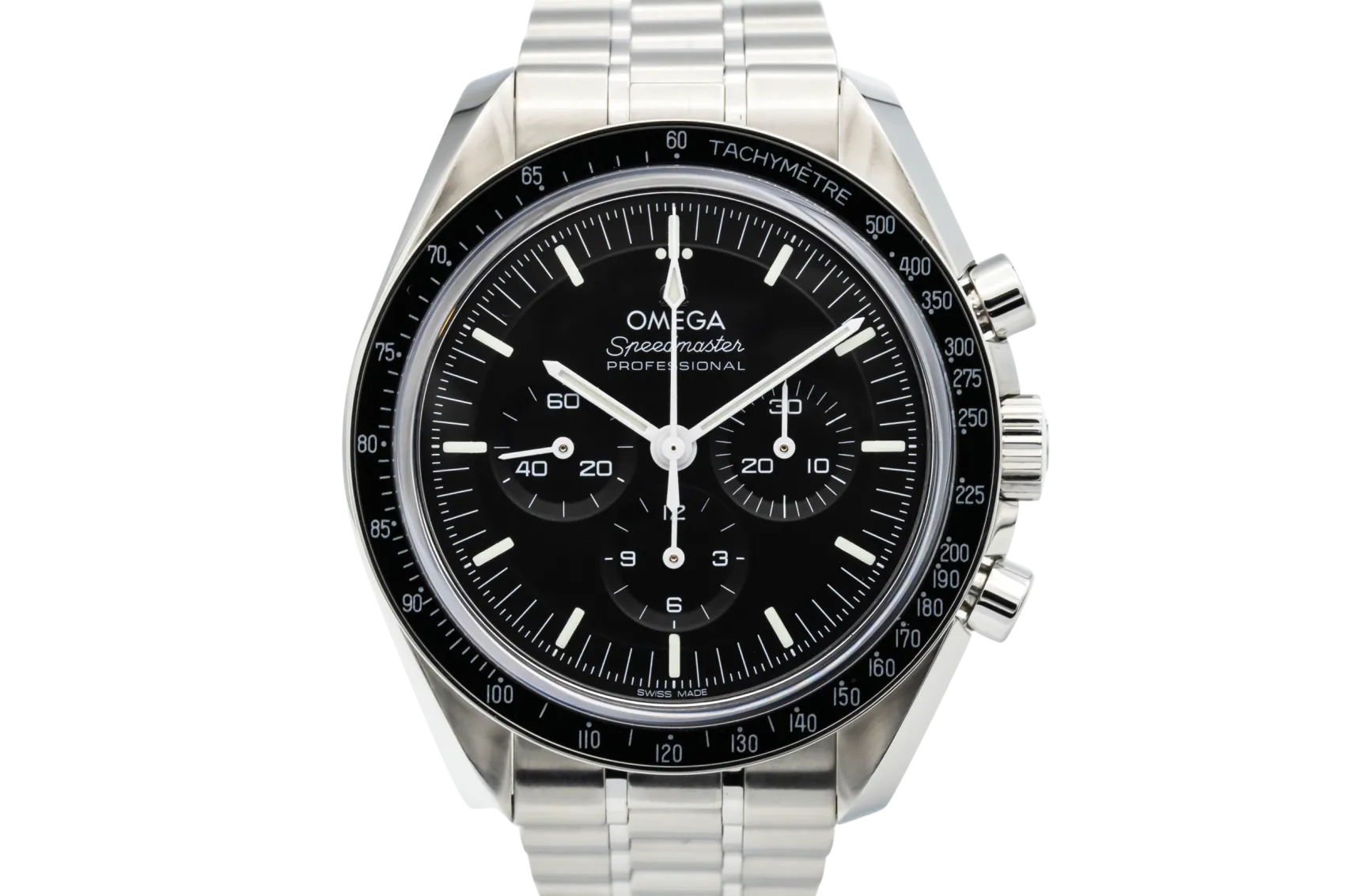 finance this from £118.54 p/m call the shop Read about our Limited Lifetime WarrantyThis 2025 OMEGA Speedmaster Moonwatch Professional “Sapphire Sandwich” 42mm is an iconic chronograph crafted in stainless steel. The black dial features luminous hour markers, white chronograph hands, and the classic tri-compax layout for superb legibility, protected by a sapphire crystal front and exhibition sapphire caseback. Finished on a stainless steel bracelet.