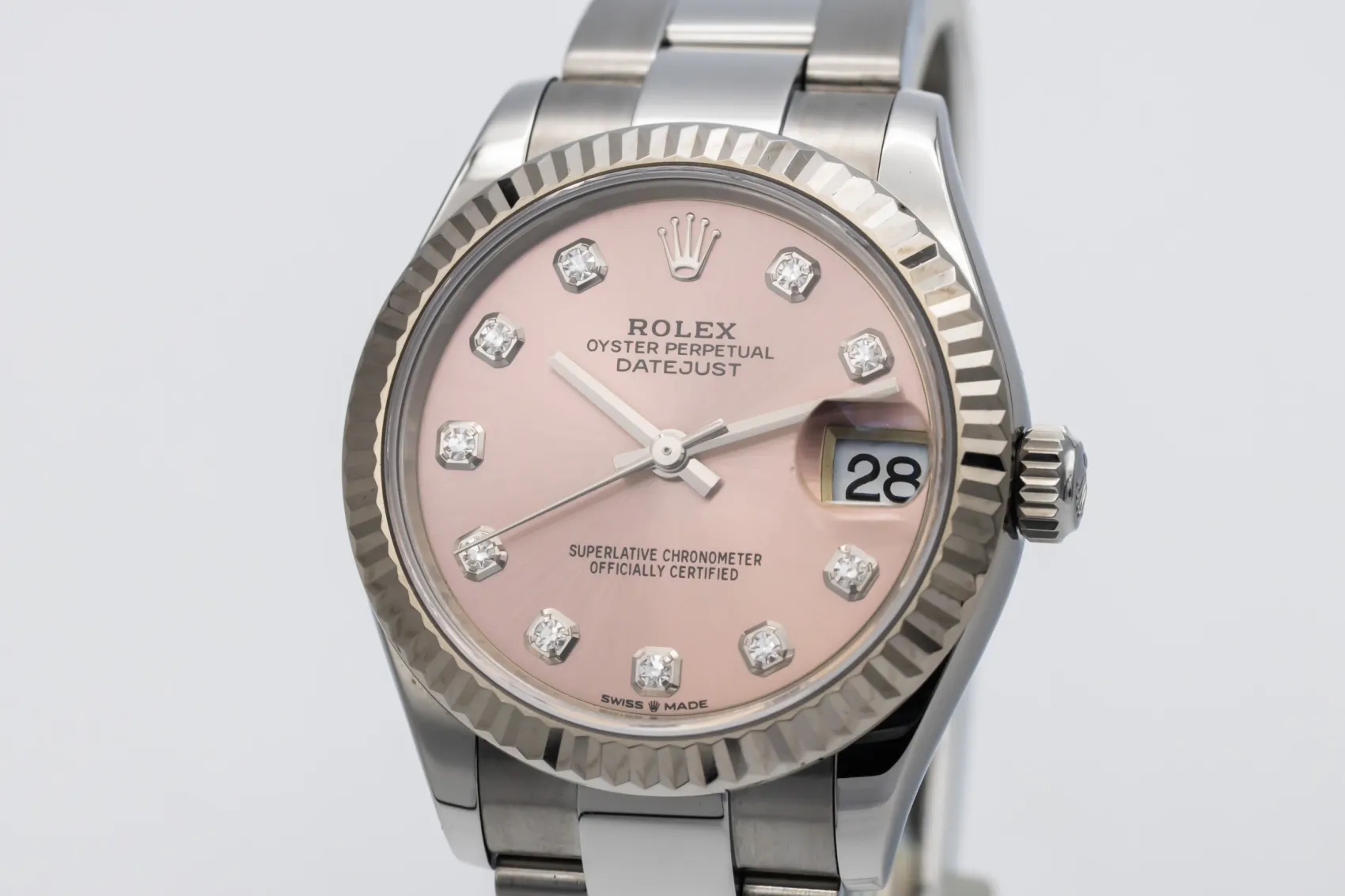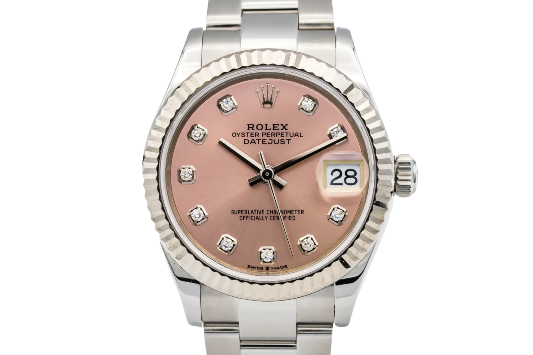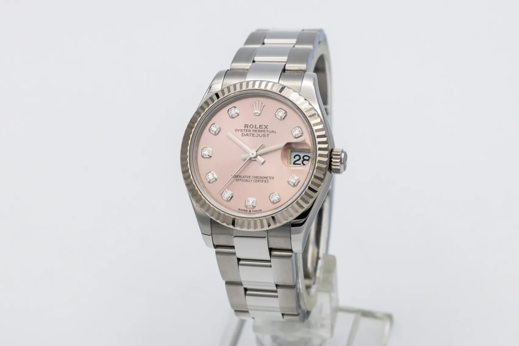 finance this from £180.87 p/m call the shop Read about our Limited Lifetime WarrantyThis 2021 Rolex DateJust 31mm is a refined luxury timepiece crafted in stainless steel. The clean, elegant pink dial is complemented by diamond hour markers and framed by a fluted white gold bezel, adding classic Rolex distinction. Finished on a stainless steel Oyster bracelet with a secure Oysterclasp.