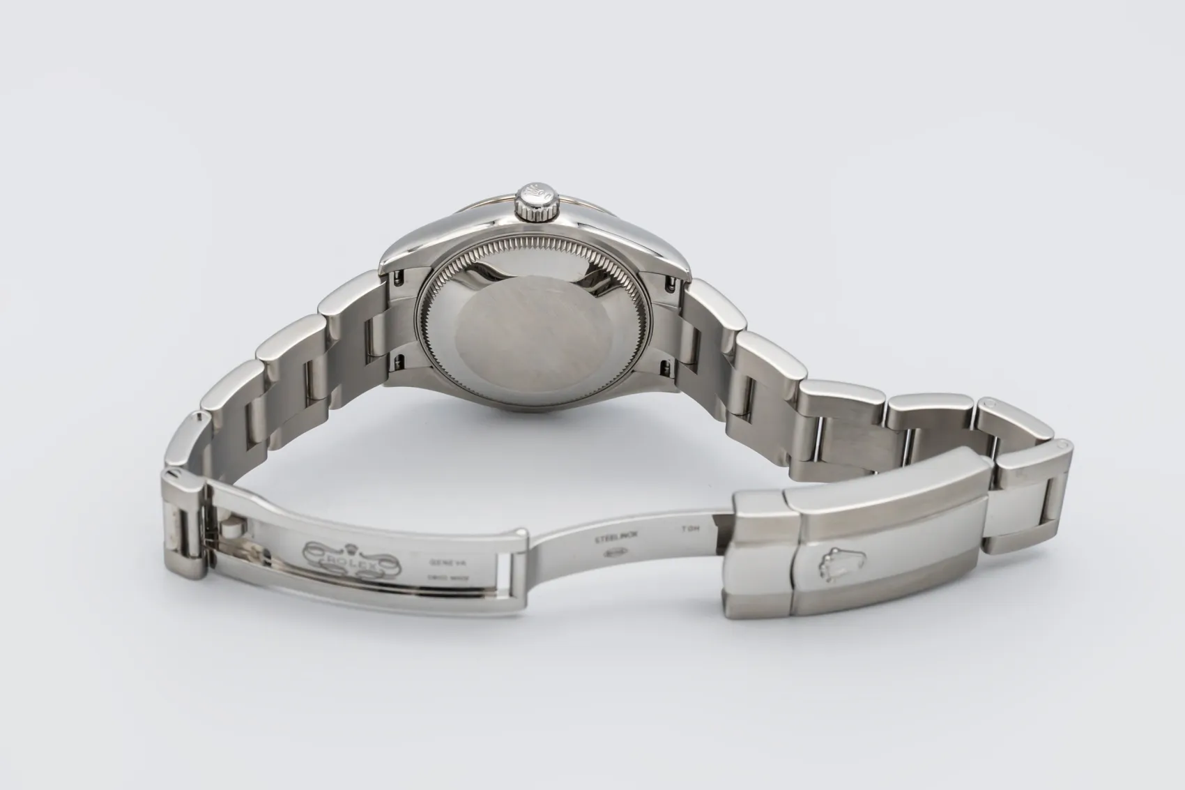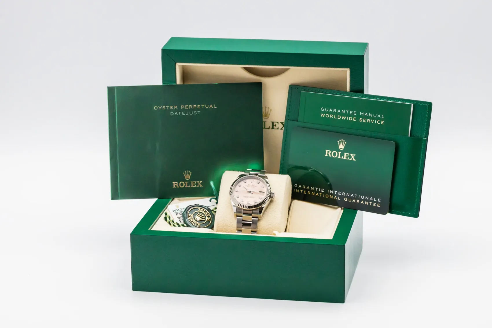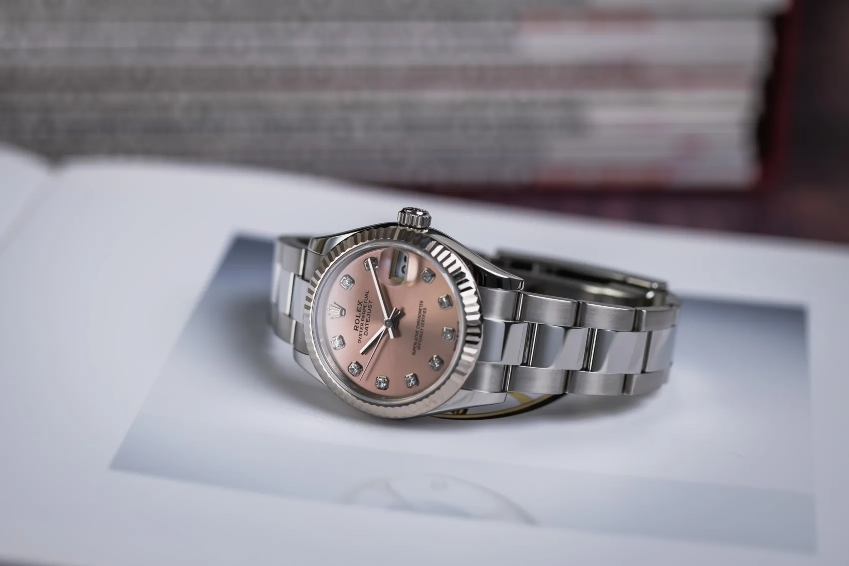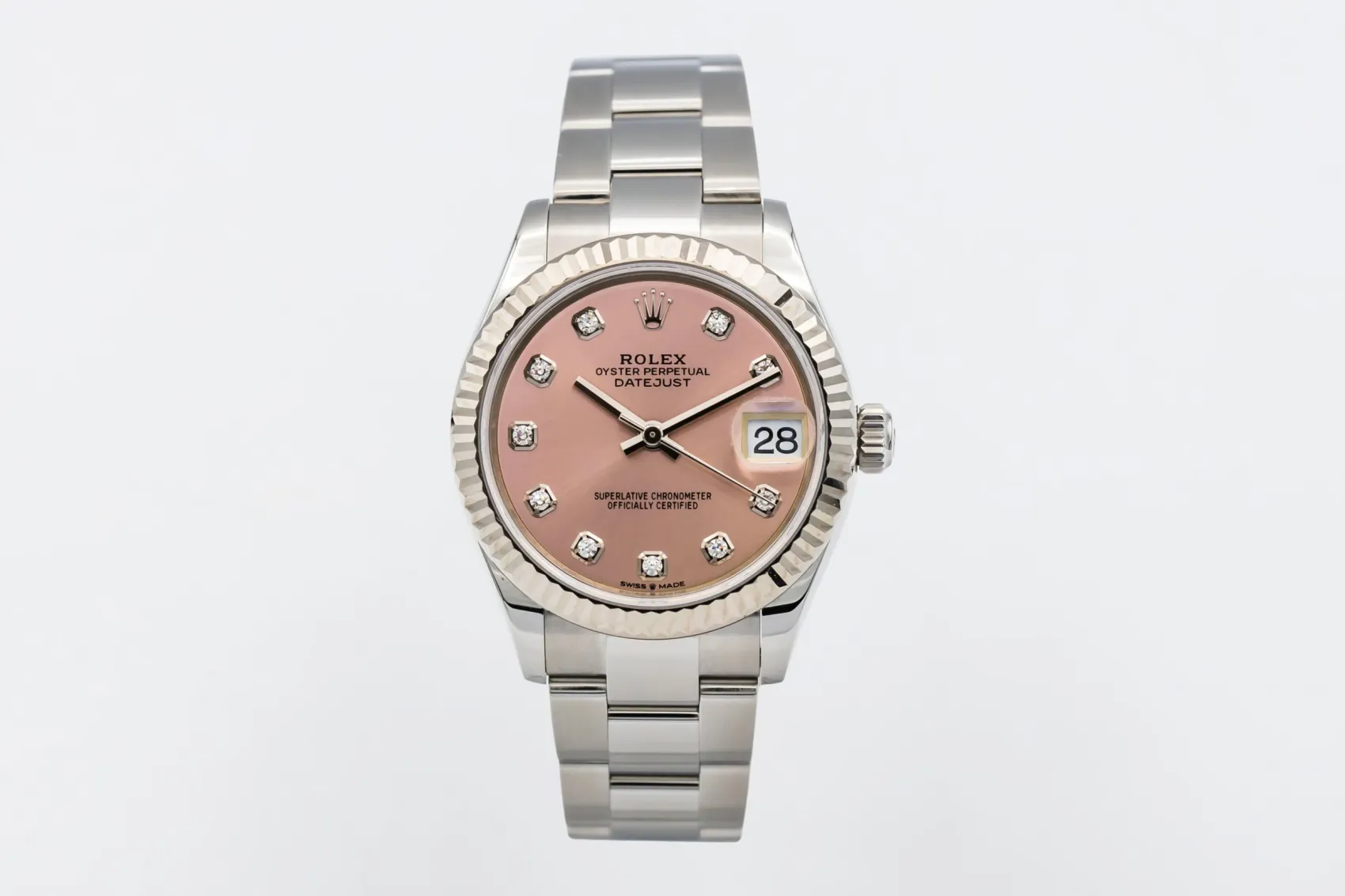 finance this from £180.87 p/m call the shop Read about our Limited Lifetime WarrantyThis 2021 Rolex DateJust 31mm is a refined luxury timepiece crafted in stainless steel. The clean, elegant pink dial is complemented by diamond hour markers and framed by a fluted white gold bezel, adding classic Rolex distinction. Finished on a stainless steel Oyster bracelet with a secure Oysterclasp.