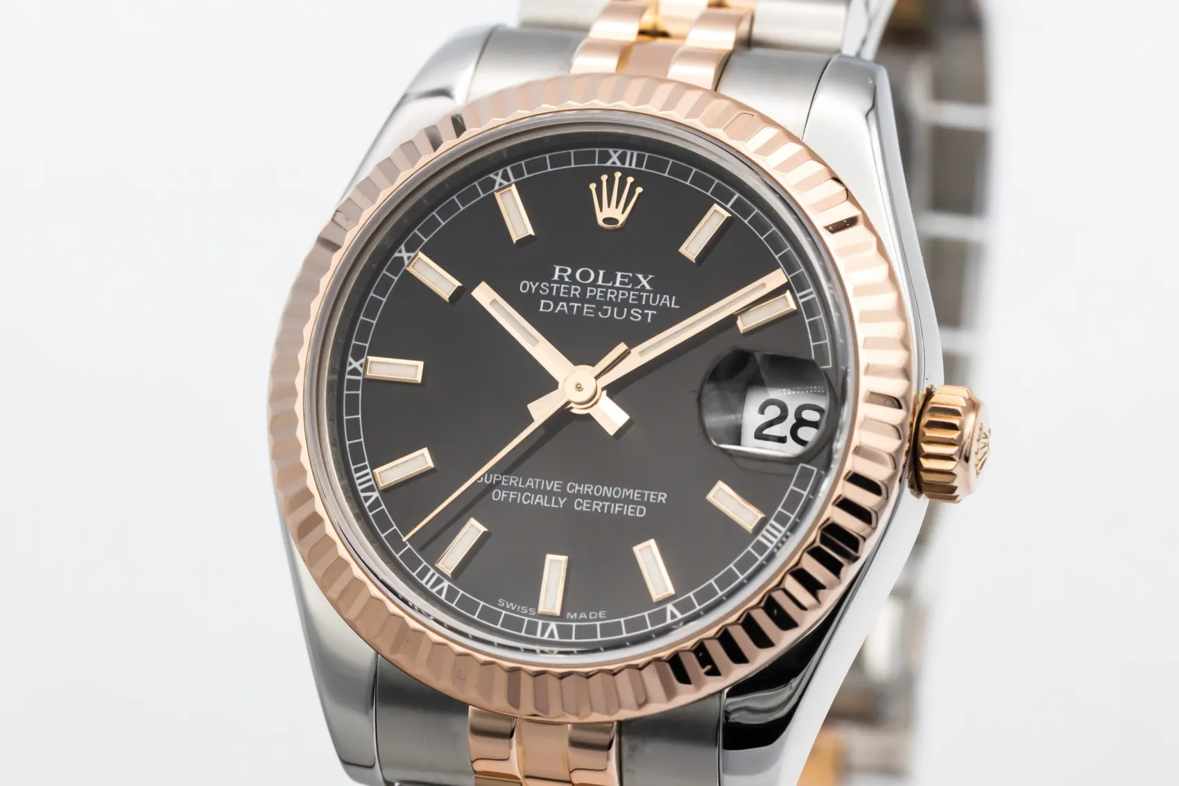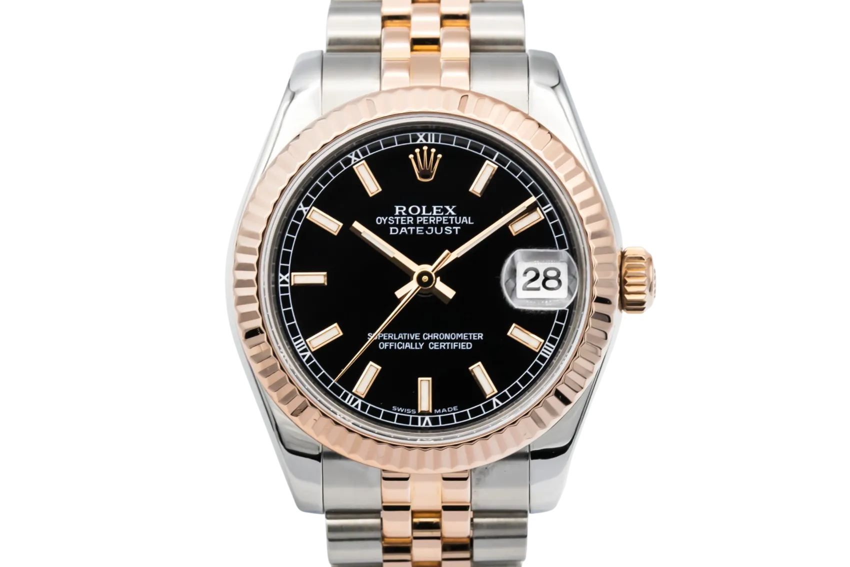 finance this from £200.07 p/m call the shop Read about our Limited Lifetime WarrantyThis 2008 Rolex DateJust 31mm is a refined luxury timepiece crafted in stainless steel and 18ct rose gold. The black dial features elegant baton hour markers and the signature date window at 3 o’clock, offering strong contrast and excellent legibility. Finished with a smooth rose gold bezel and the iconic steel and rose gold Jubilee bracelet.