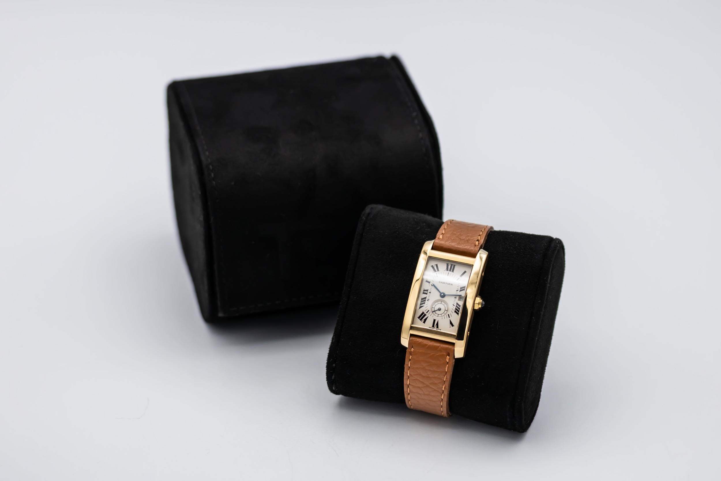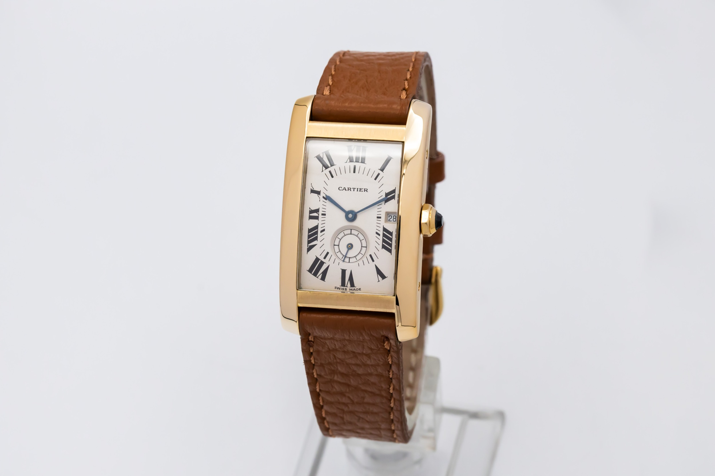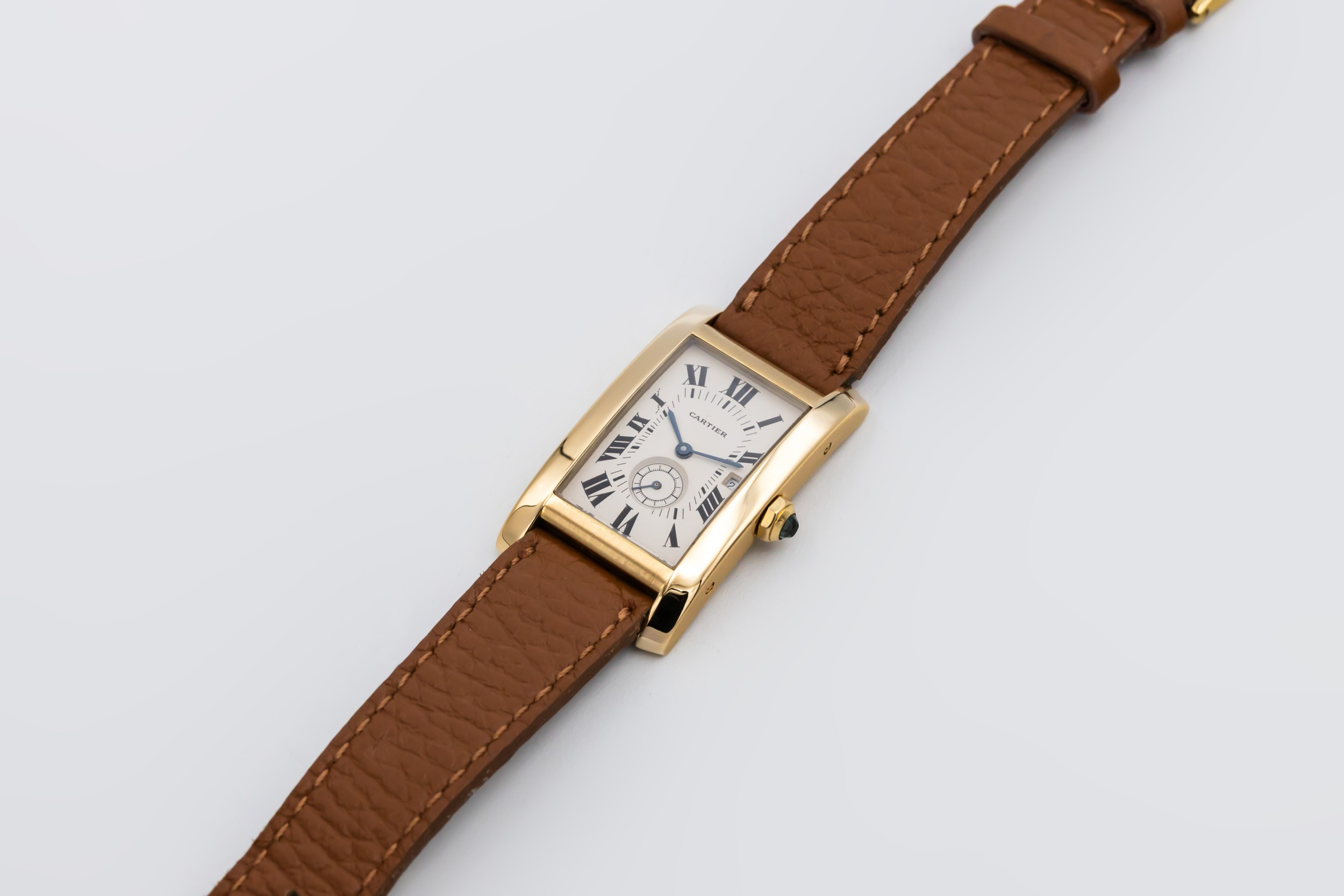 This circa 2000s Cartier Tank Américaine 24mm is an elegant luxury timepiece crafted in solid 18ct yellow gold. The curved rectangular case frames a silver guilloché dial with bold black Roman numeral hour markers, blued steel hands, and a small seconds display, creating classic Cartier refinement with excellent legibility. Finished on a brown leather strap.