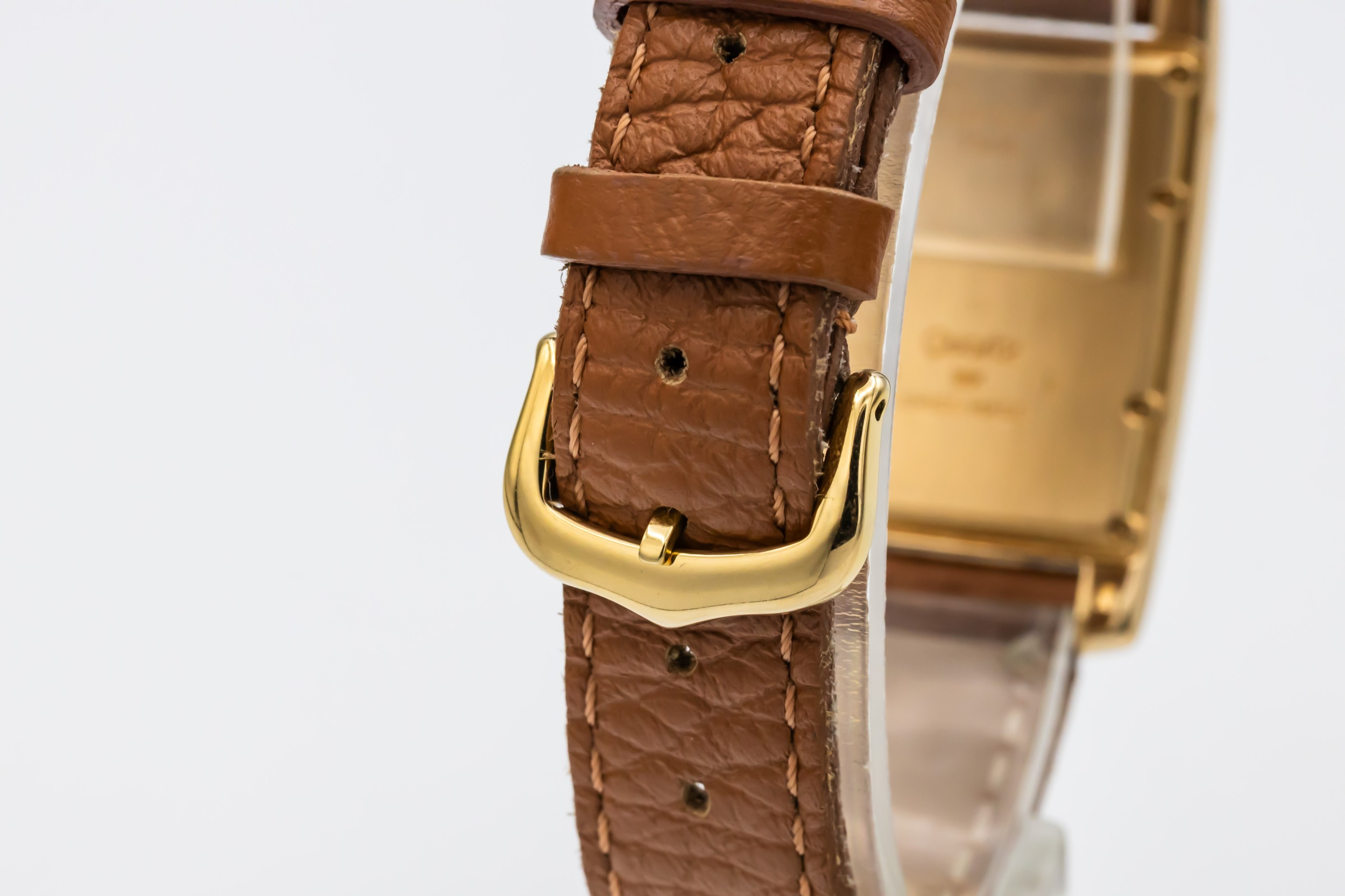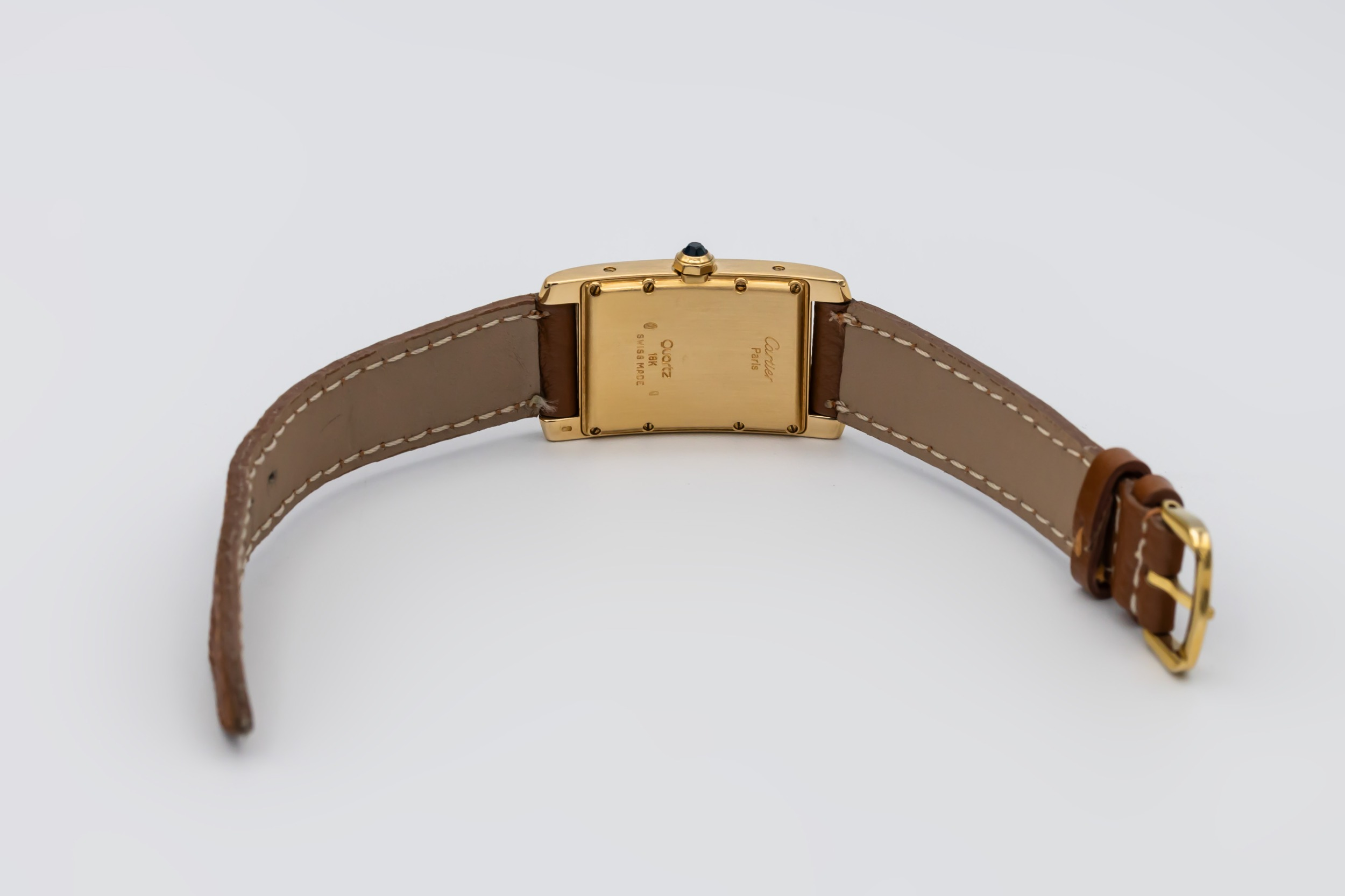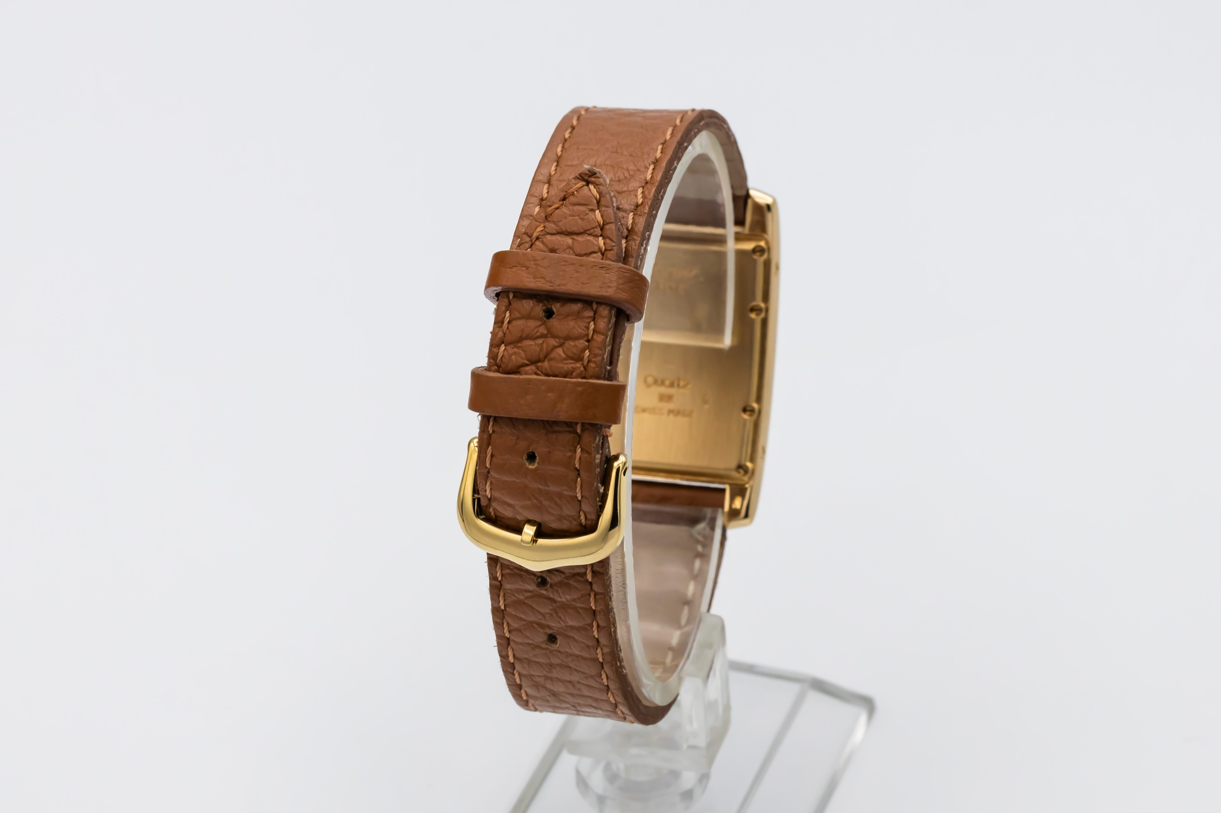 This circa 2000s Cartier Tank Américaine 24mm is an elegant luxury timepiece crafted in solid 18ct yellow gold. The curved rectangular case frames a silver guilloché dial with bold black Roman numeral hour markers, blued steel hands, and a small seconds display, creating classic Cartier refinement with excellent legibility. Finished on a brown leather strap.