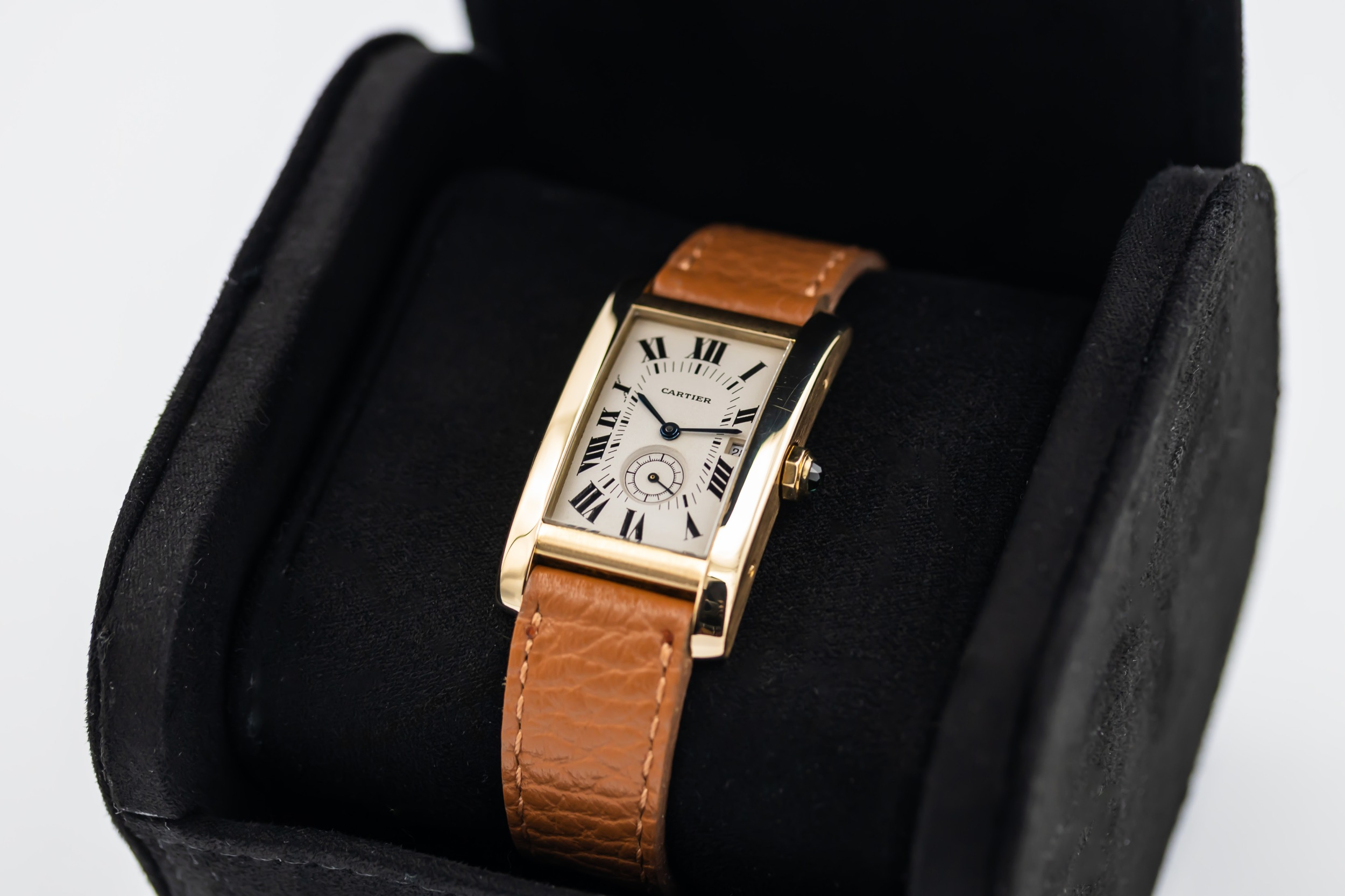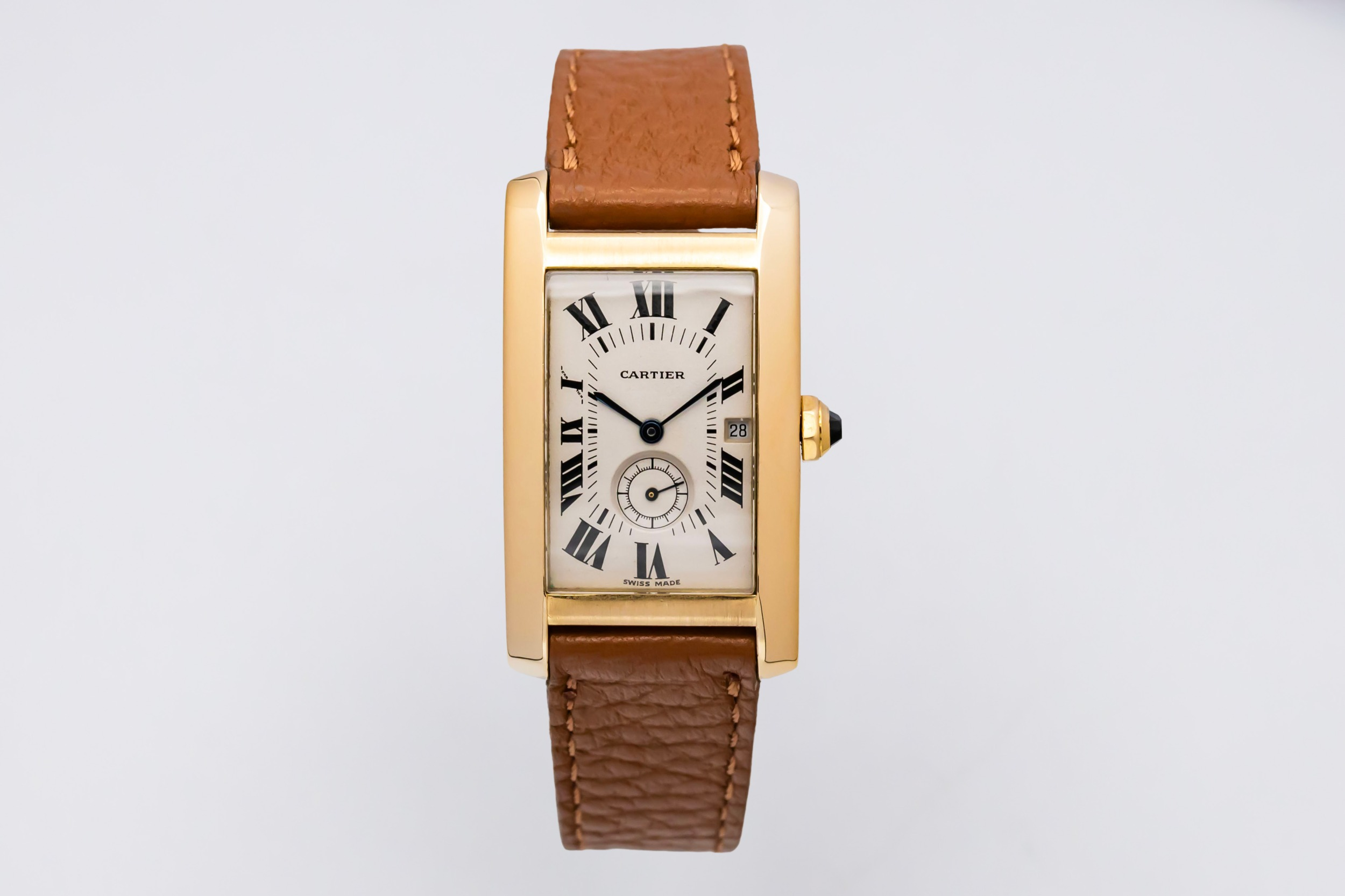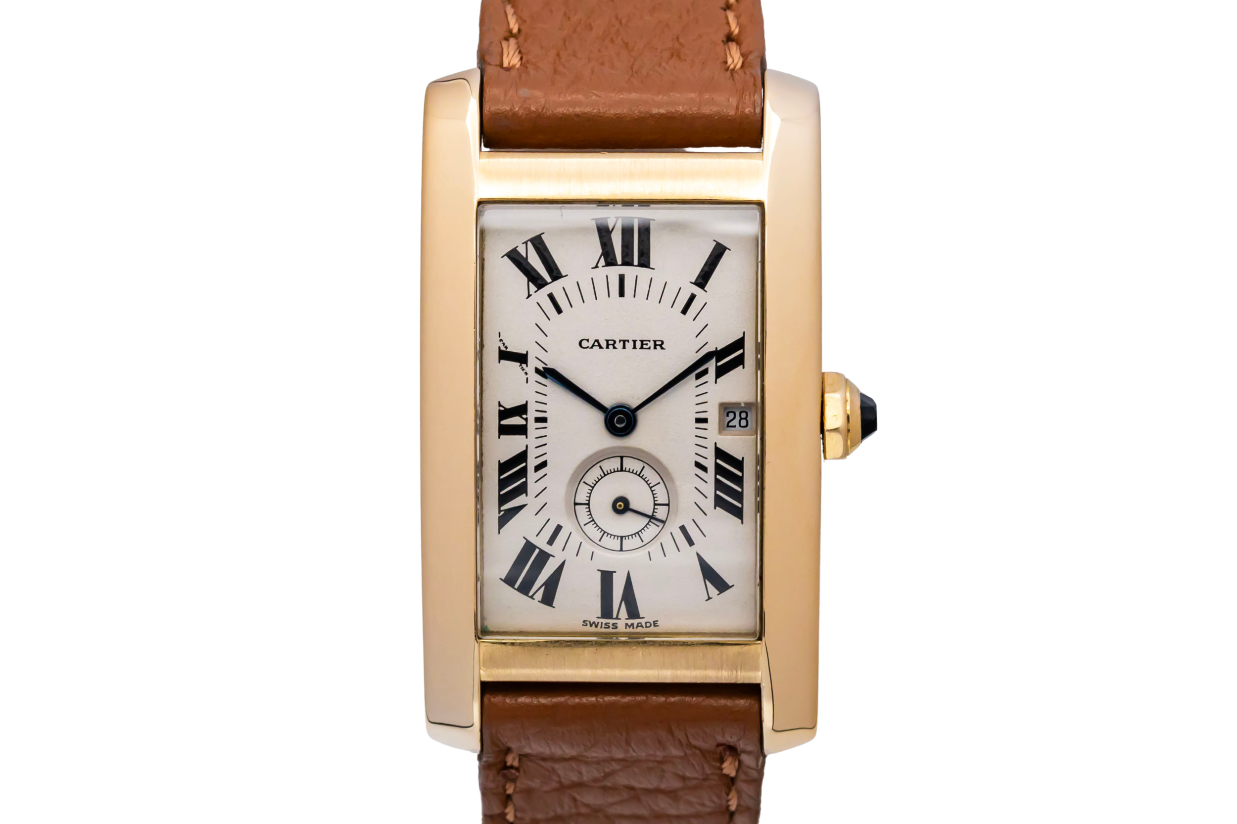The Tank Américaine later reinterpreted the original concept with a longer, curved case designed for enhanced comfort and elegance. Models featuring complications such as small seconds and date displays highlight Cartier’s ability to blend classical aesthetics with practical watchmaking, making them especially desirable among collectors.