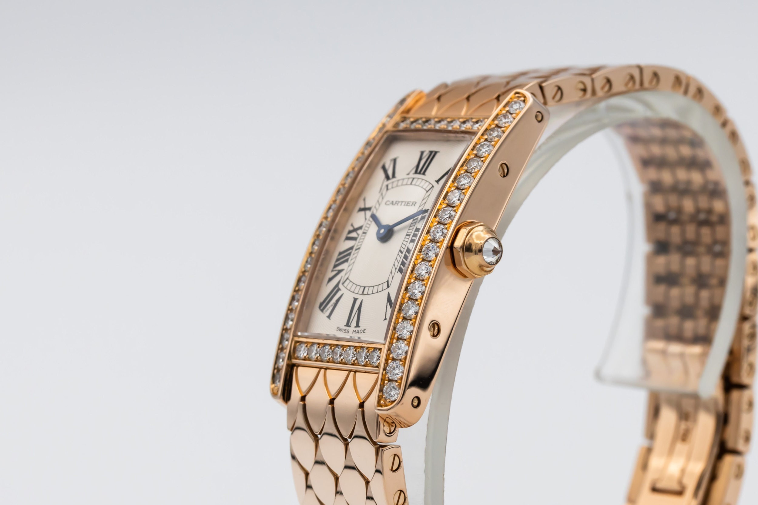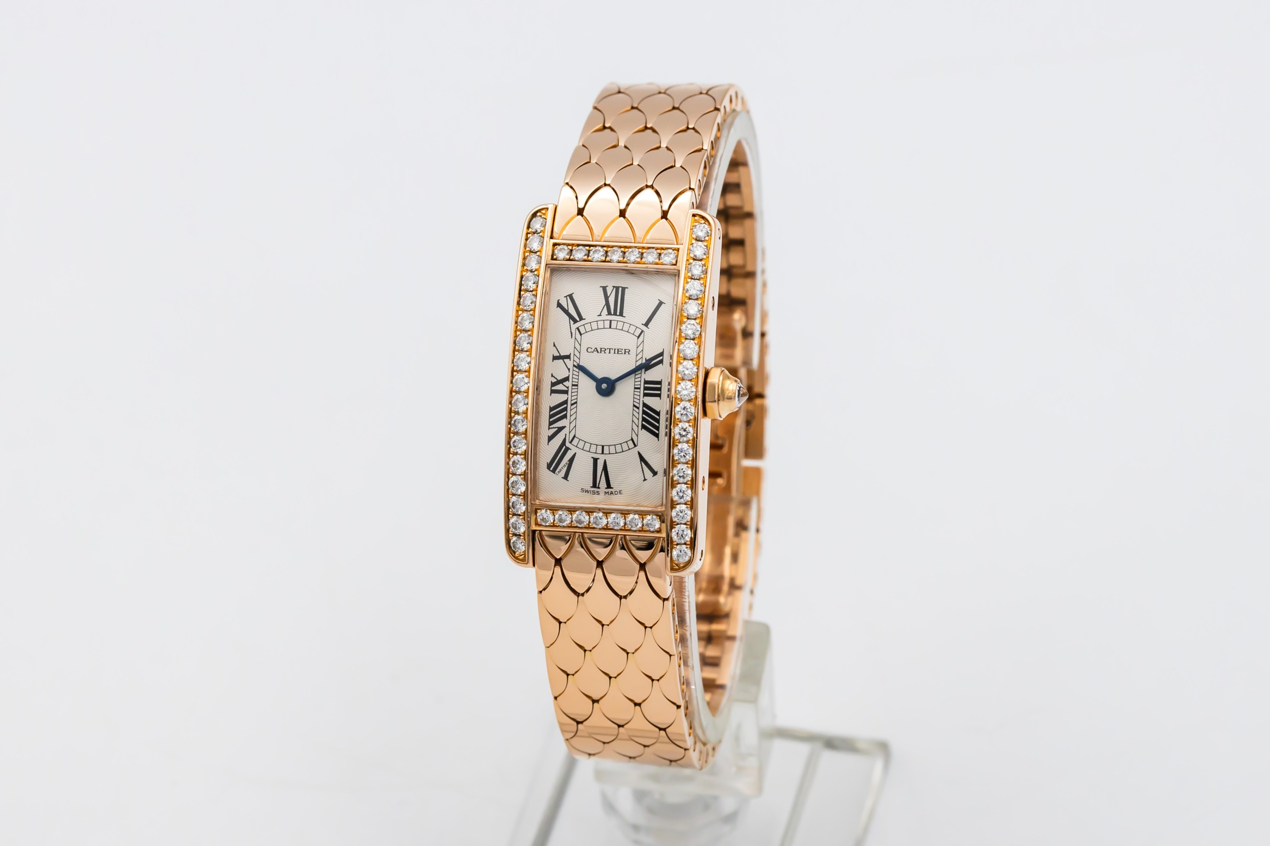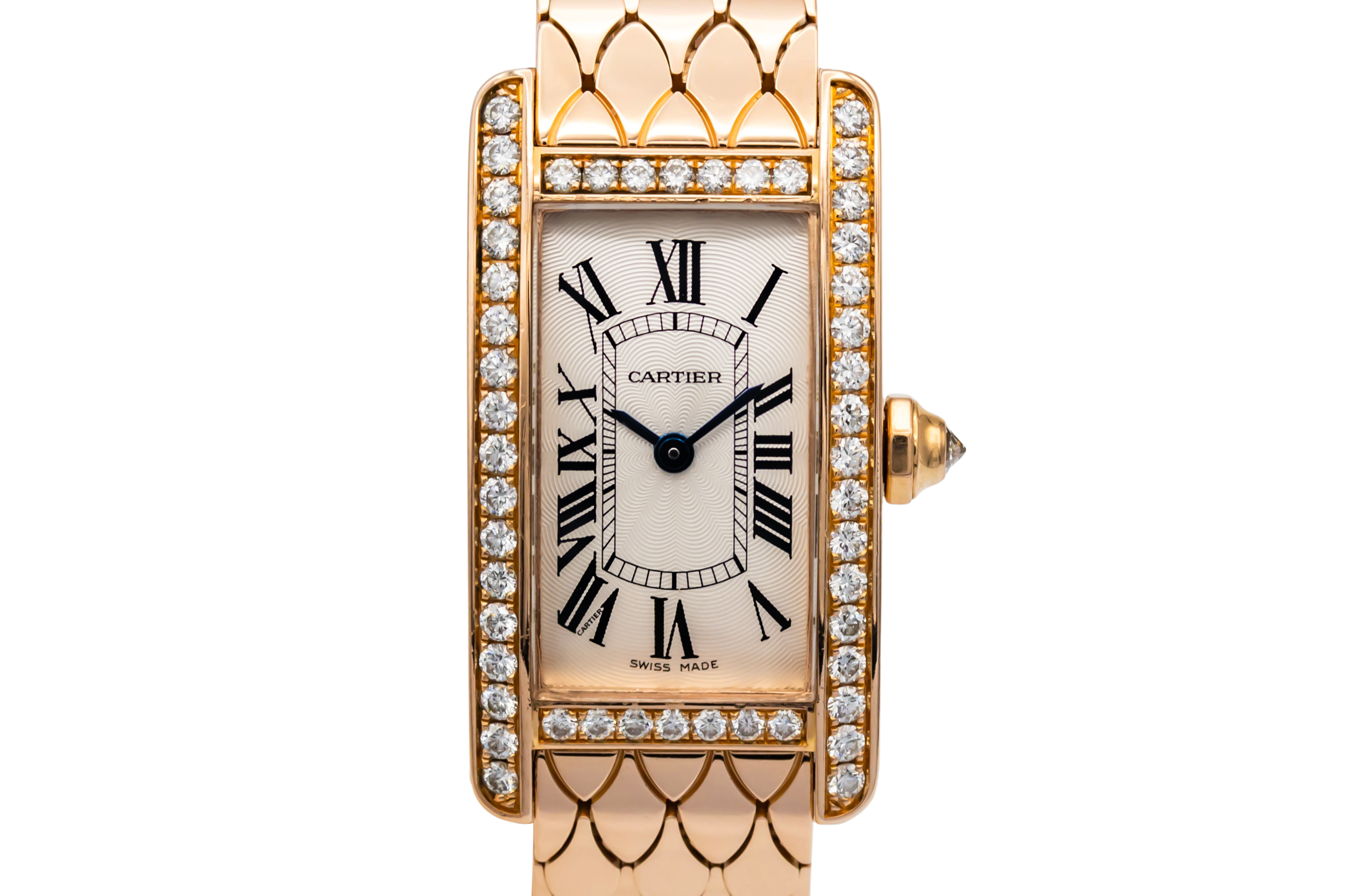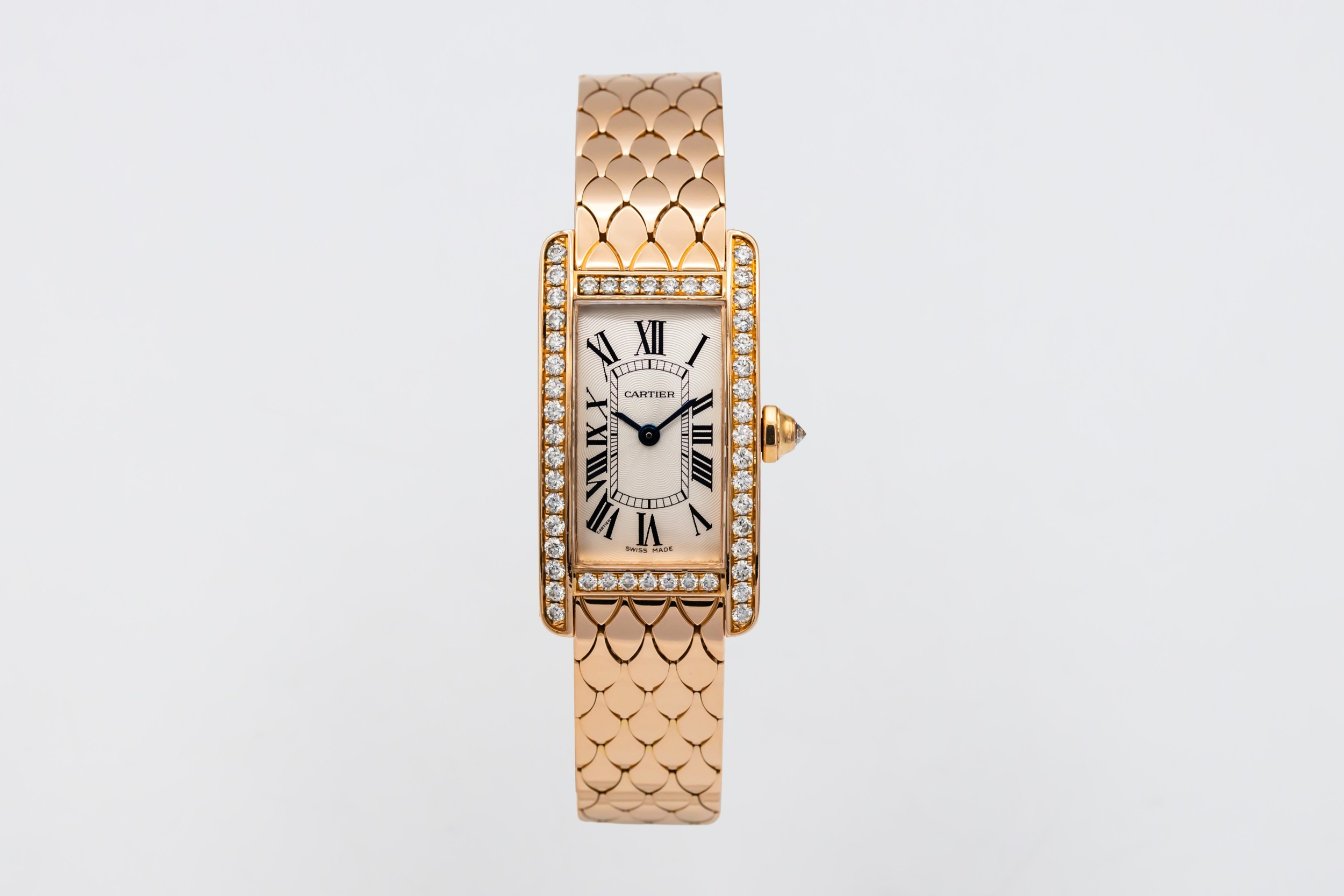 This circa 2010 Cartier Tank Américaine Mini 19mm is an elegant jewellery timepiece crafted in 18ct rose gold. The rectangular case is framed by a factory diamond-set bezel, surrounding a silver guilloché dial with classic black Roman numeral hour markers and blued steel hands. Finished on an integrated 18ct rose gold bracelet with a distinctive scale-link design.