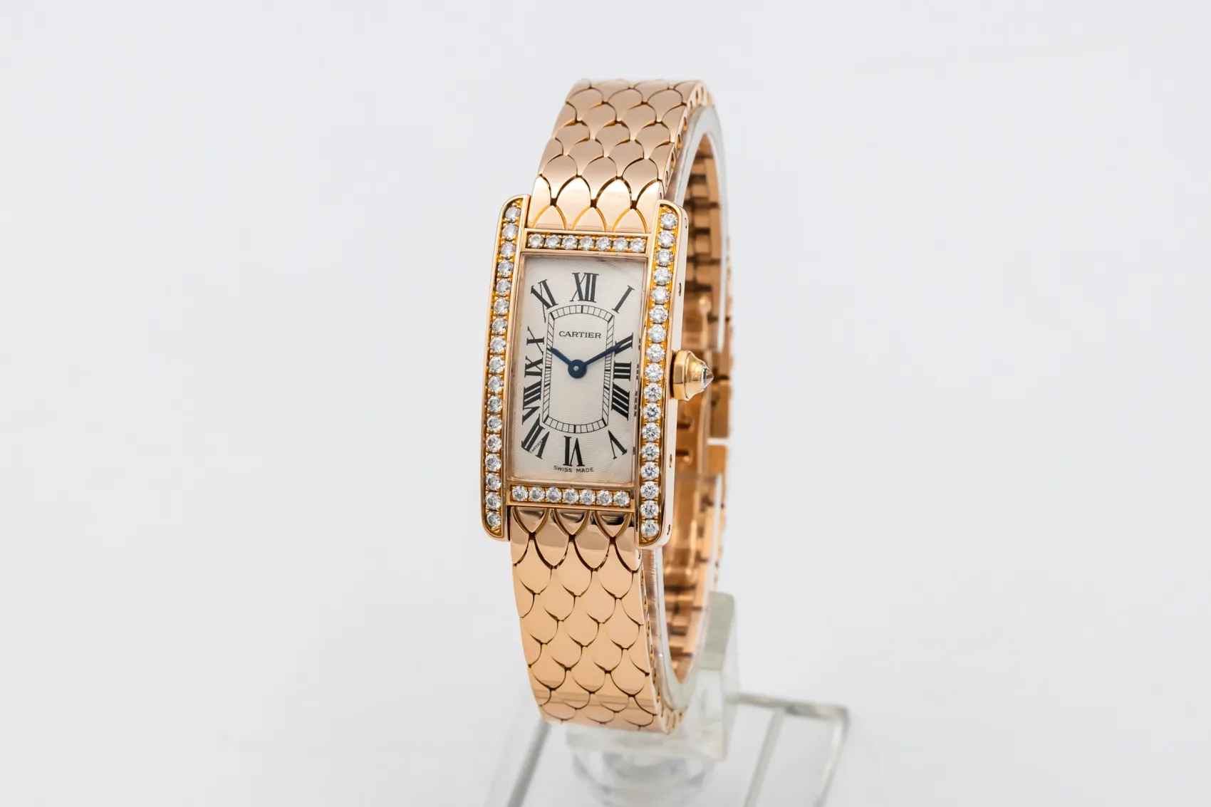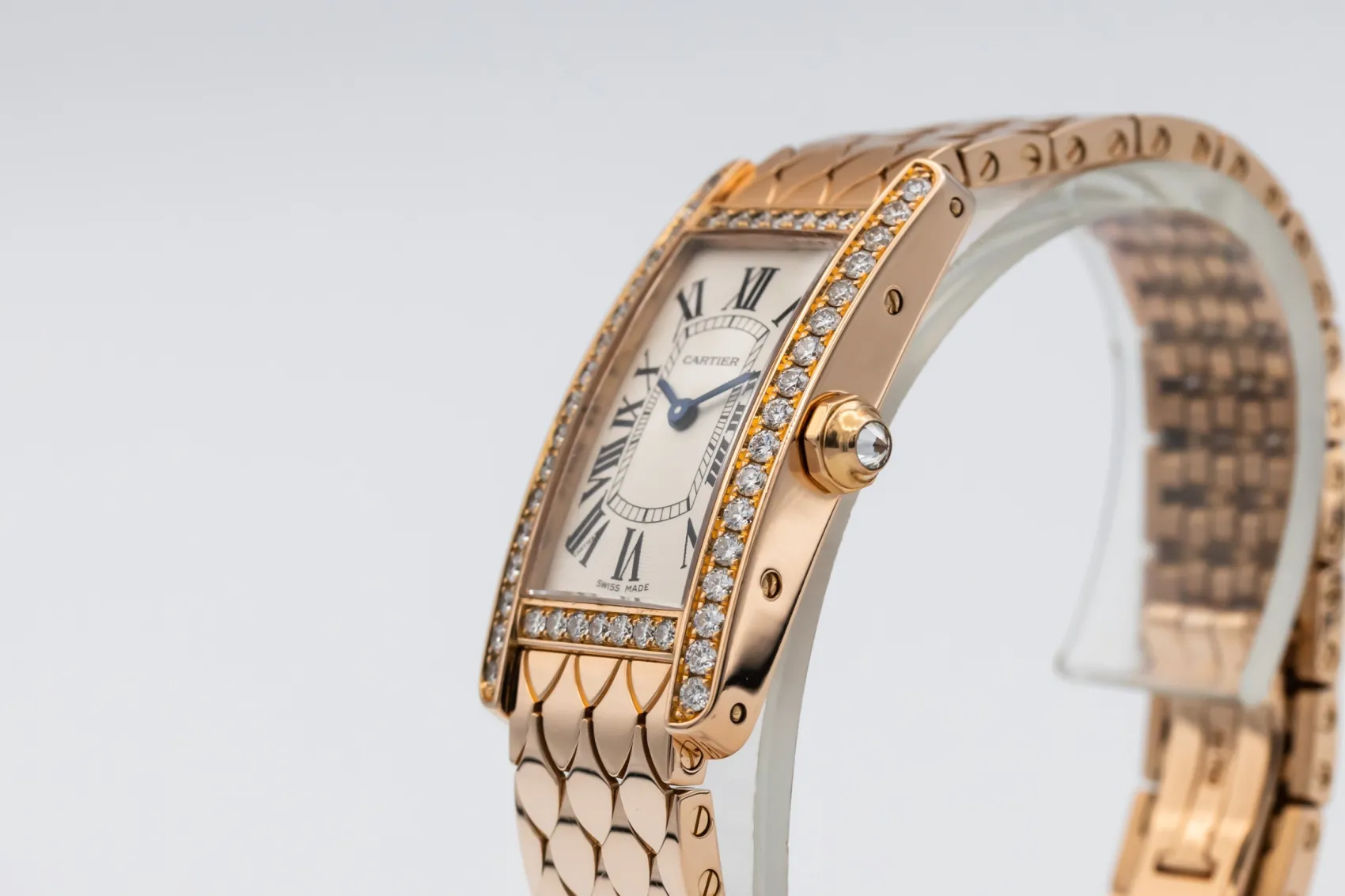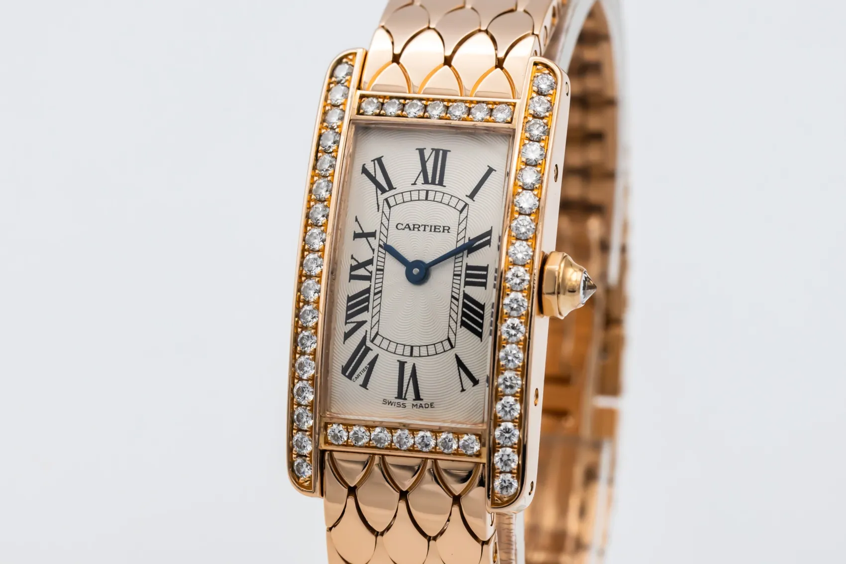 finance this from £402.06 p/m call the shop Read about our Limited Lifetime WarrantyThis circa 2010 Cartier Tank Américaine Mini 19mm is an elegant jewellery timepiece crafted in 18ct rose gold. The rectangular case is framed by a factory diamond-set bezel, surrounding a silver guilloché dial with classic black Roman numeral hour markers and blued steel hands. Finished on an integrated 18ct rose gold bracelet with a distinctive scale-link design.