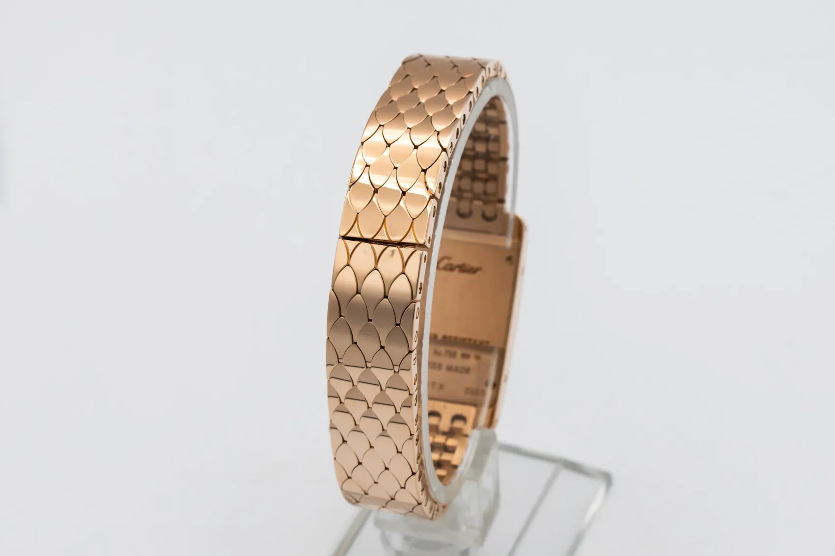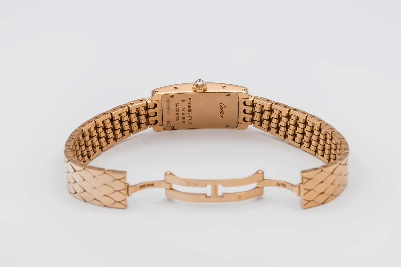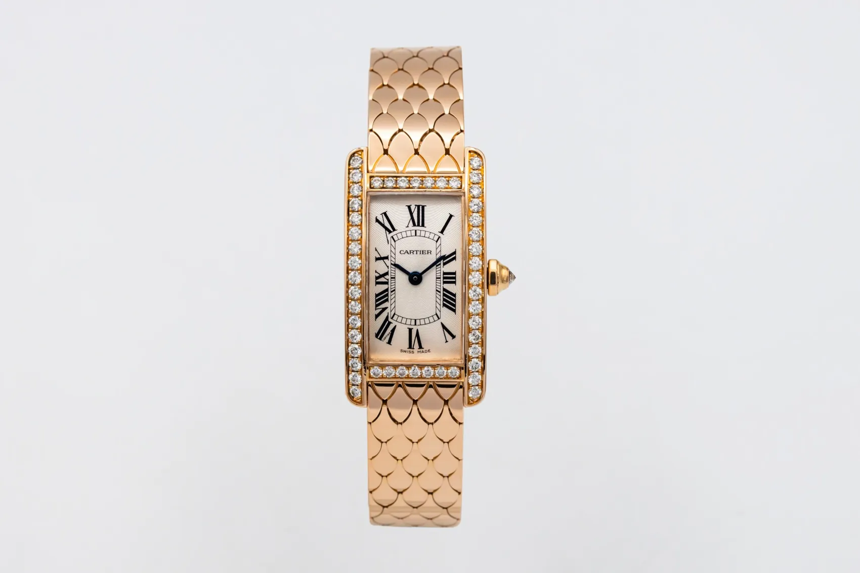 finance this from £402.06 p/m call the shop Read about our Limited Lifetime WarrantyThis circa 2010 Cartier Tank Américaine Mini 19mm is an elegant jewellery timepiece crafted in 18ct rose gold. The rectangular case is framed by a factory diamond-set bezel, surrounding a silver guilloché dial with classic black Roman numeral hour markers and blued steel hands. Finished on an integrated 18ct rose gold bracelet with a distinctive scale-link design.