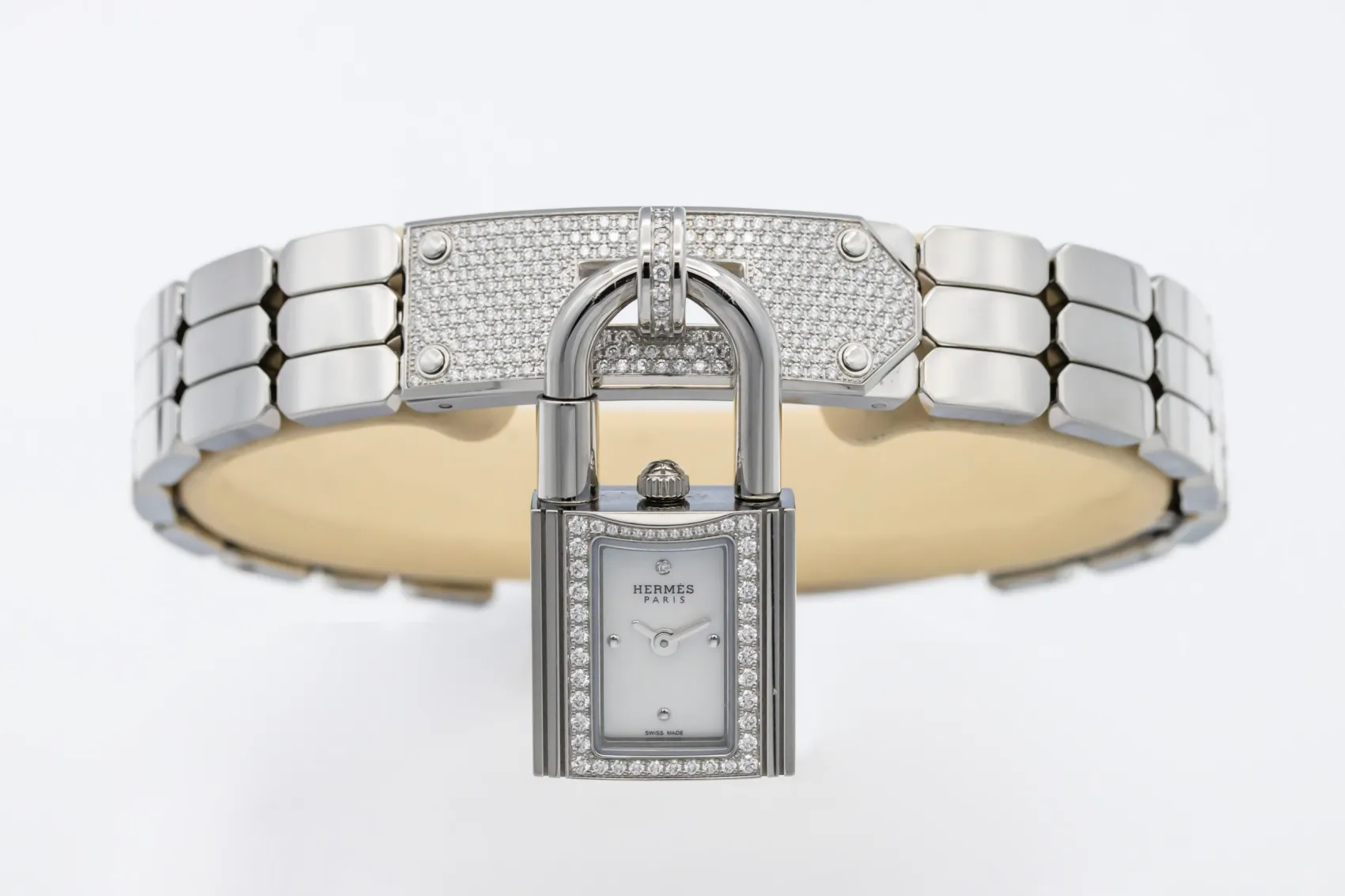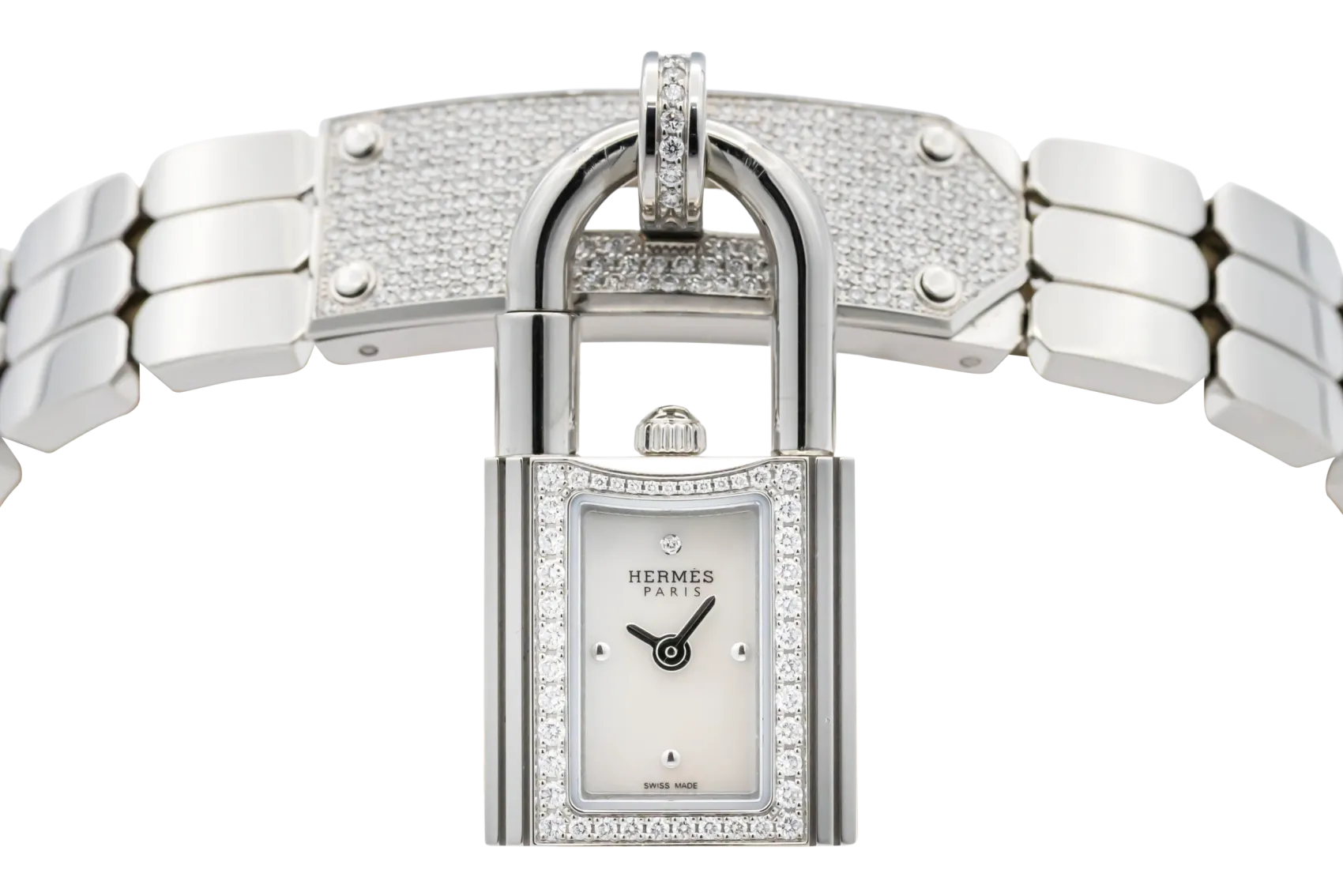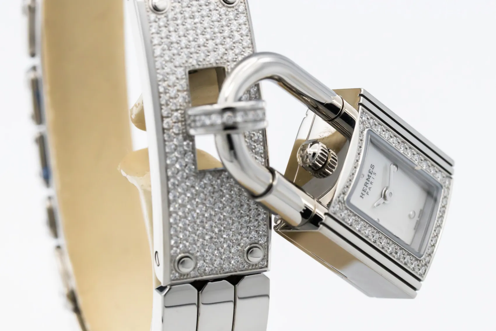 finance this from £110.49 p/m call the shop Read about our Limited Lifetime WarrantyThis circa 2000s Hermès Kelly Watch is an elegant jewellery timepiece crafted in stainless steel, inspired by the iconic padlock design of the Hermès Kelly handbag. The 16mm rectangular case is framed with factory-set diamonds, complemented by a white dial signed Hermès Paris, creating a refined and feminine aesthetic. Finished on a polished stainless steel bracelet with diamond pavé detailing to the clasp.