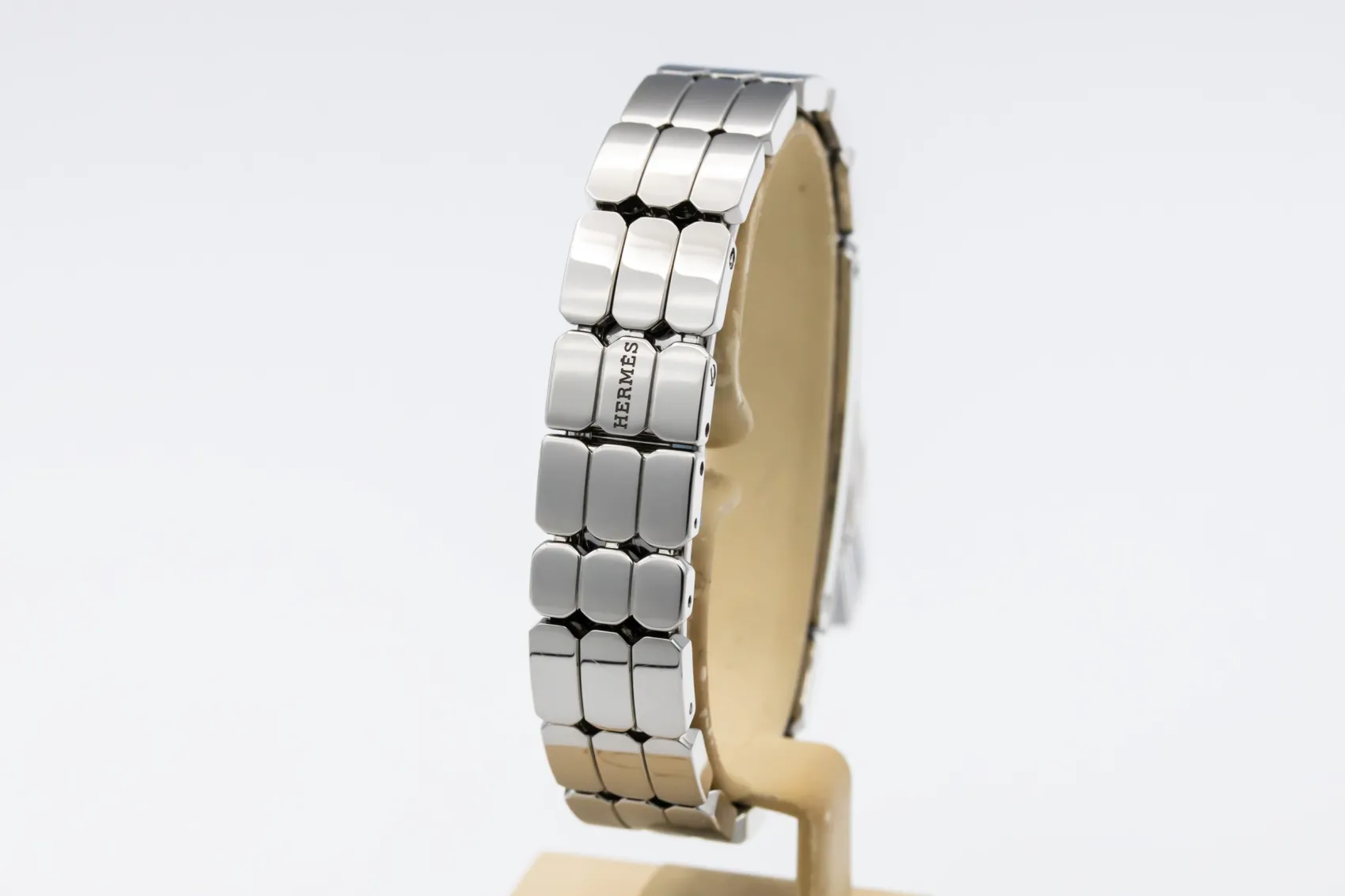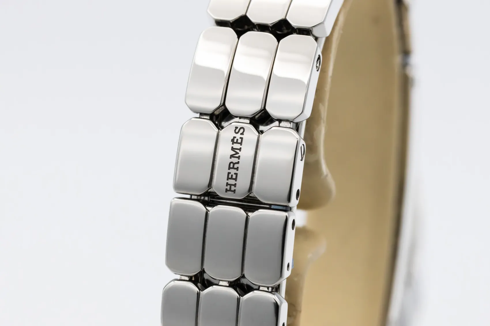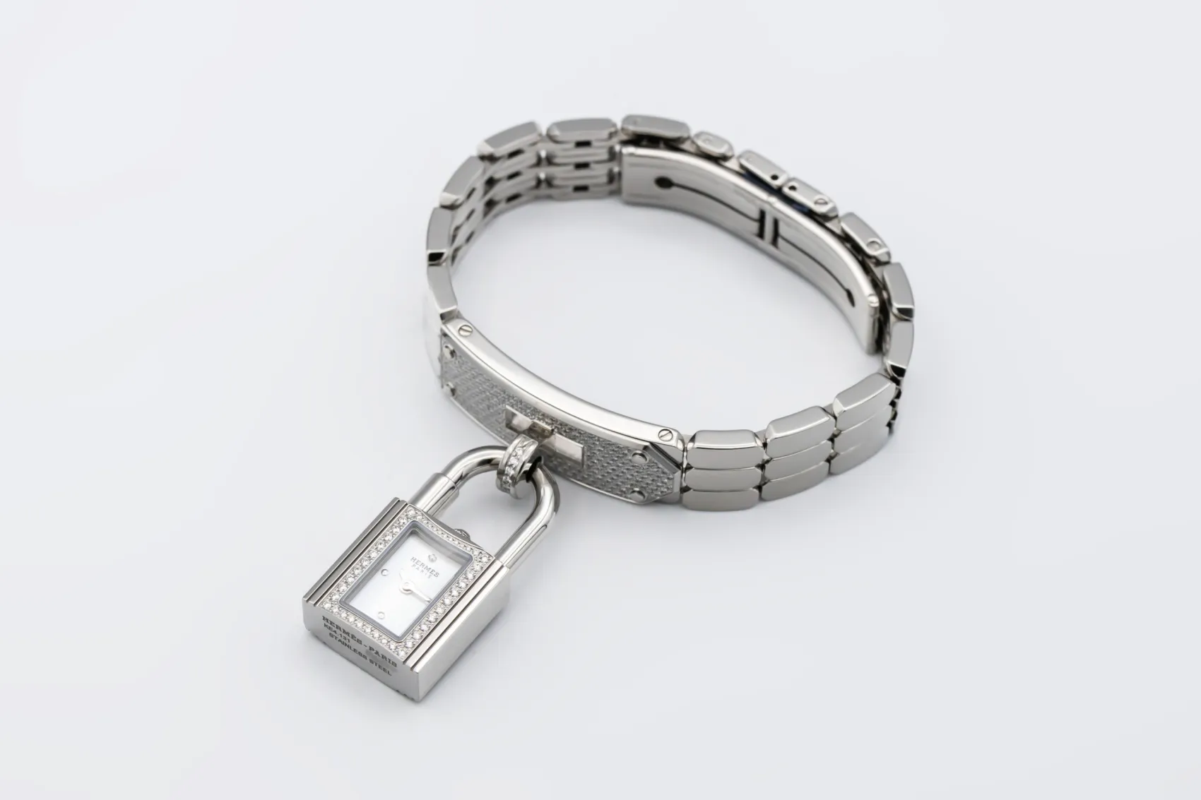 finance this from £110.49 p/m call the shop Read about our Limited Lifetime WarrantyThis circa 2000s Hermès Kelly Watch is an elegant jewellery timepiece crafted in stainless steel, inspired by the iconic padlock design of the Hermès Kelly handbag. The 16mm rectangular case is framed with factory-set diamonds, complemented by a white dial signed Hermès Paris, creating a refined and feminine aesthetic. Finished on a polished stainless steel bracelet with diamond pavé detailing to the clasp.