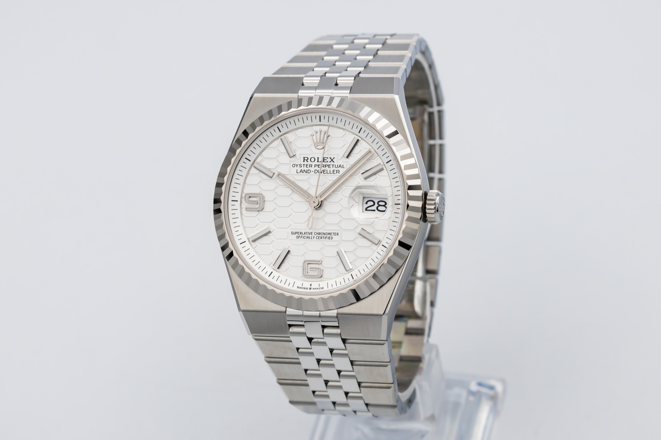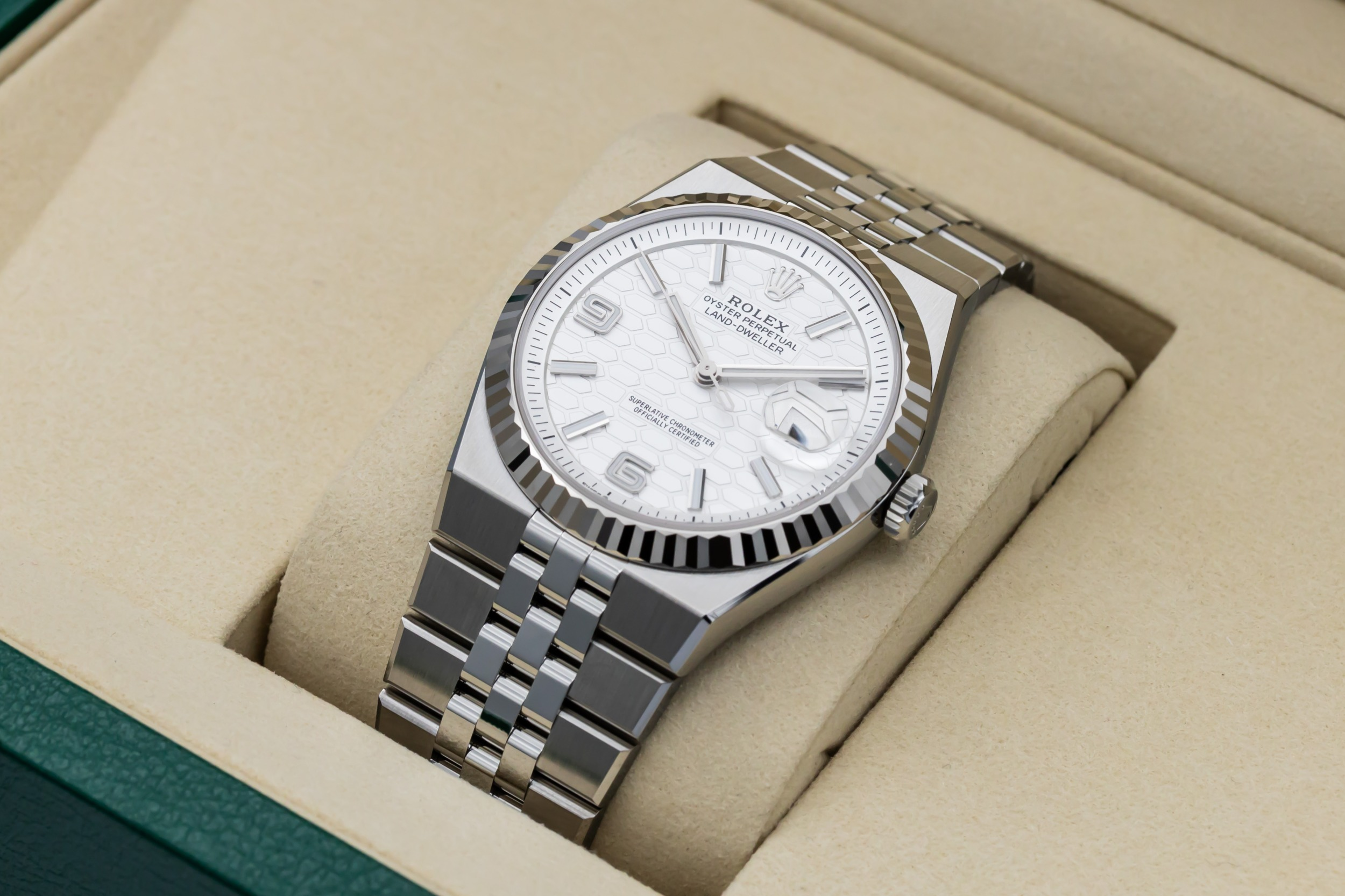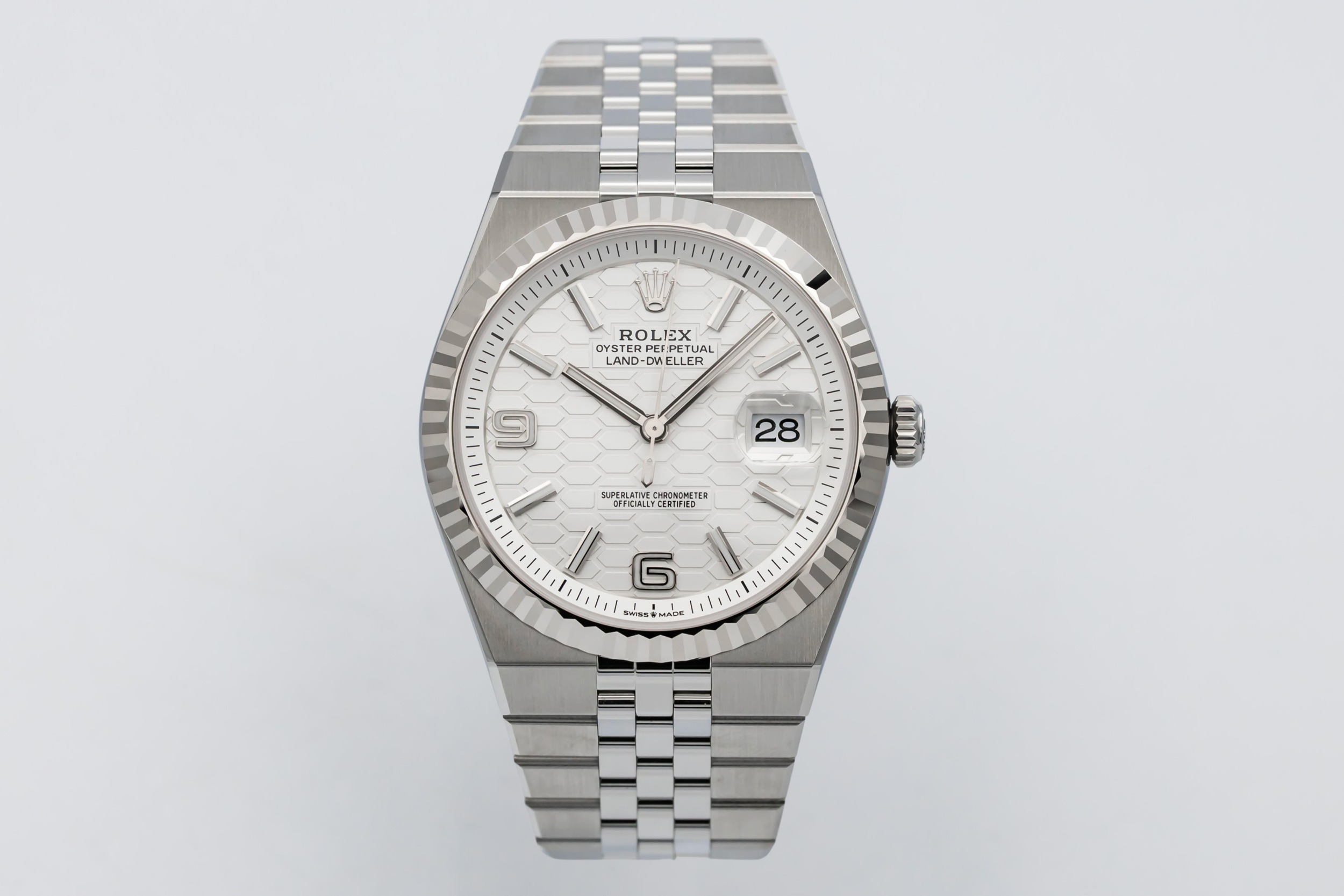 The unworn 2026 Rolex Land-Dweller 36mm features a white dial with luminous baton hour markers, polished hands, and a date window at 3 o’clock framed by the Cyclops lens for enhanced legibility. At 36mm, the case delivers balanced proportions, while the Flat Jubilee bracelet enhances comfort and aesthetic fluidity, making the piece suitable for both everyday wear and travel.