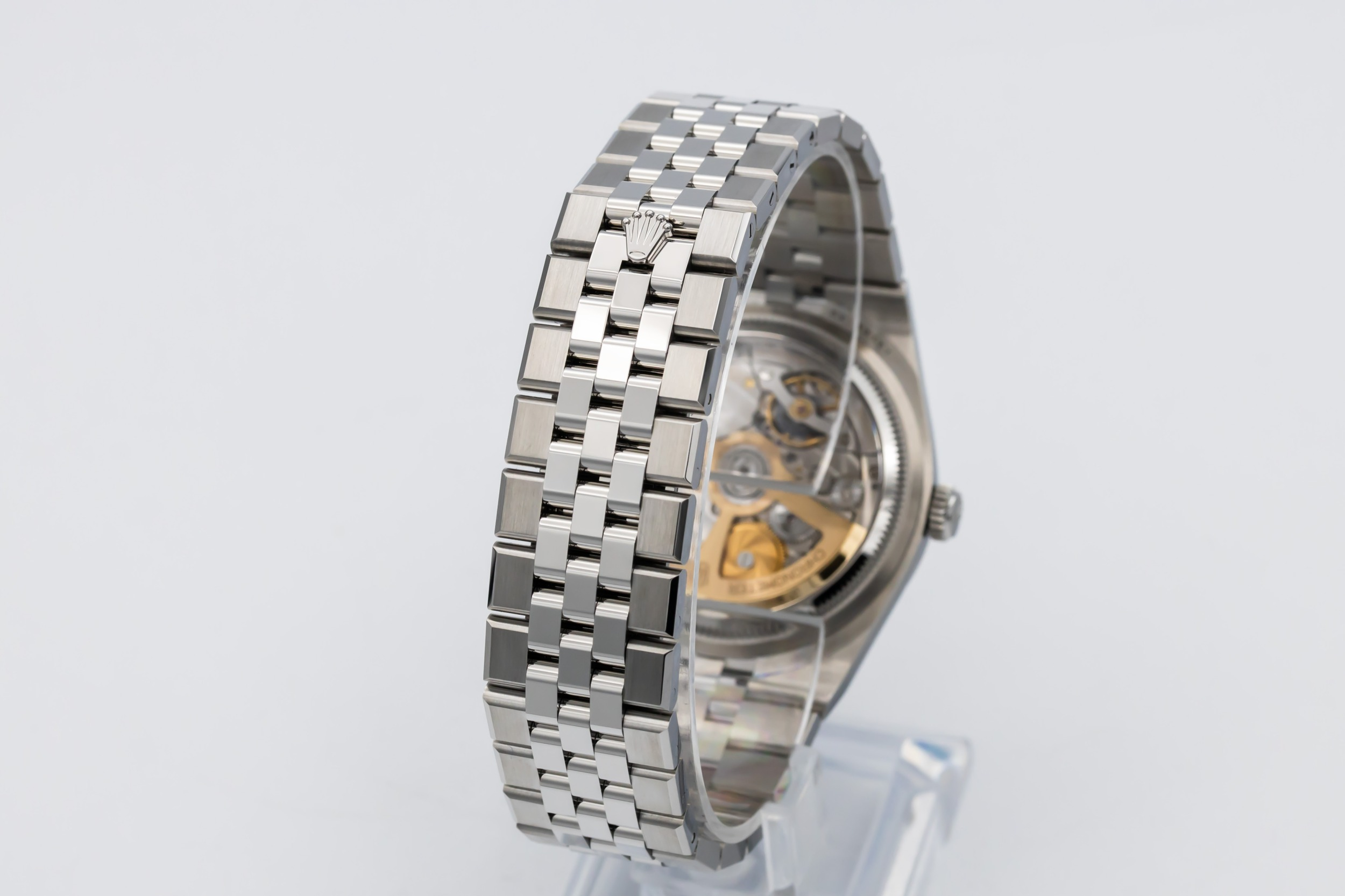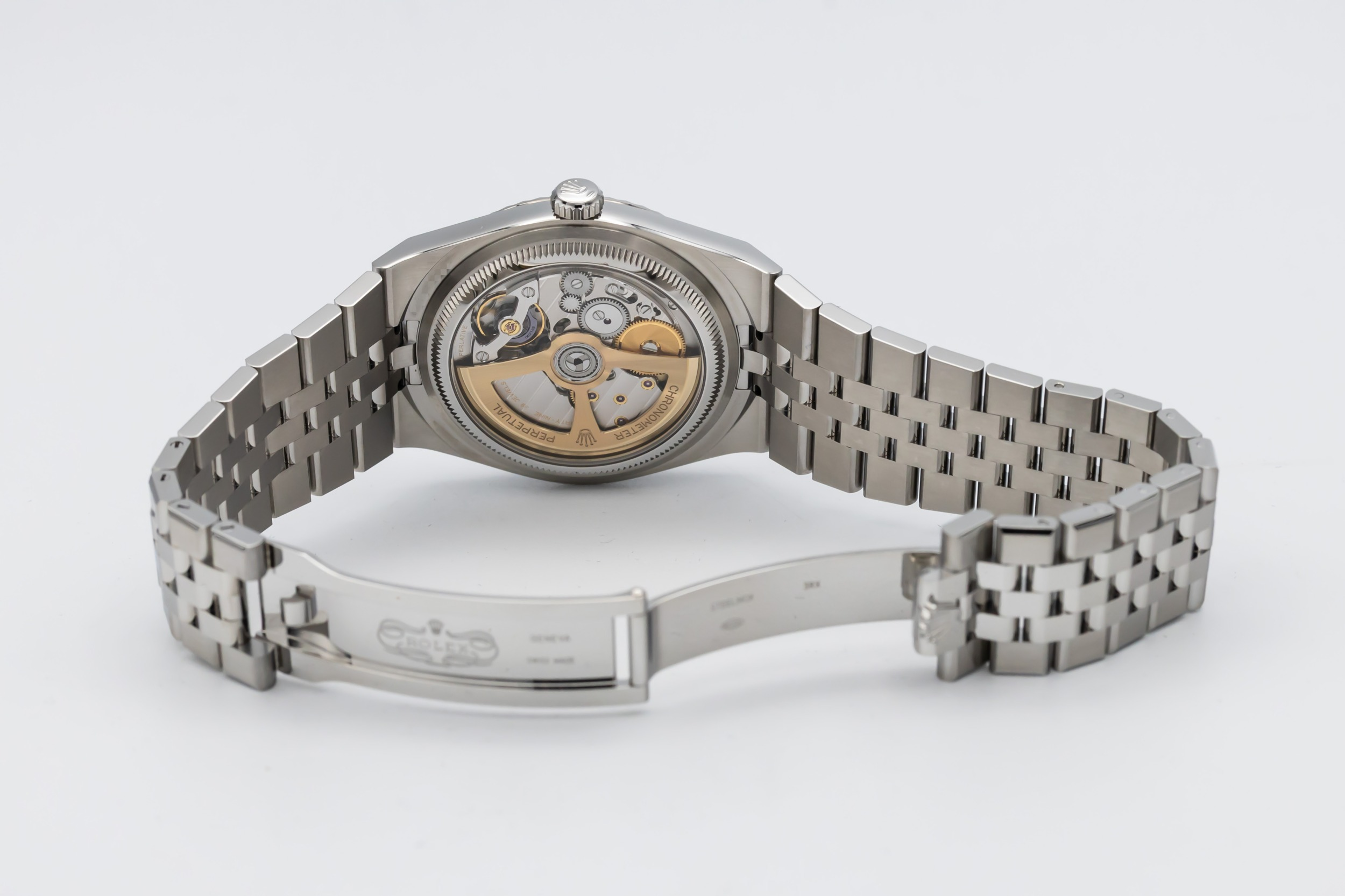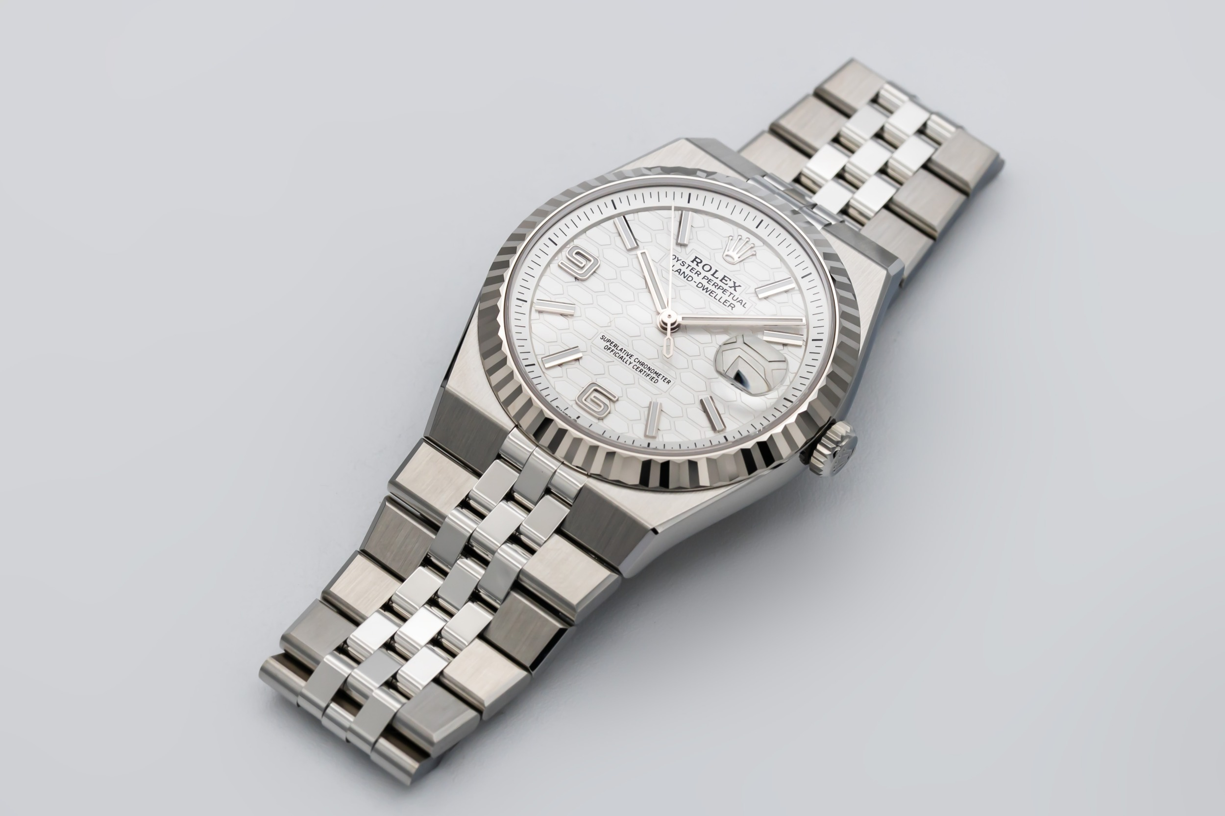 The unworn 2026 Rolex Land-Dweller 36mm features a white dial with luminous baton hour markers, polished hands, and a date window at 3 o’clock framed by the Cyclops lens for enhanced legibility. At 36mm, the case delivers balanced proportions, while the Flat Jubilee bracelet enhances comfort and aesthetic fluidity, making the piece suitable for both everyday wear and travel.